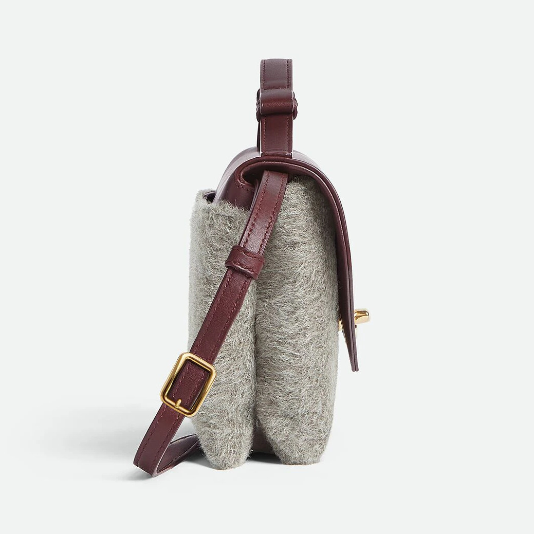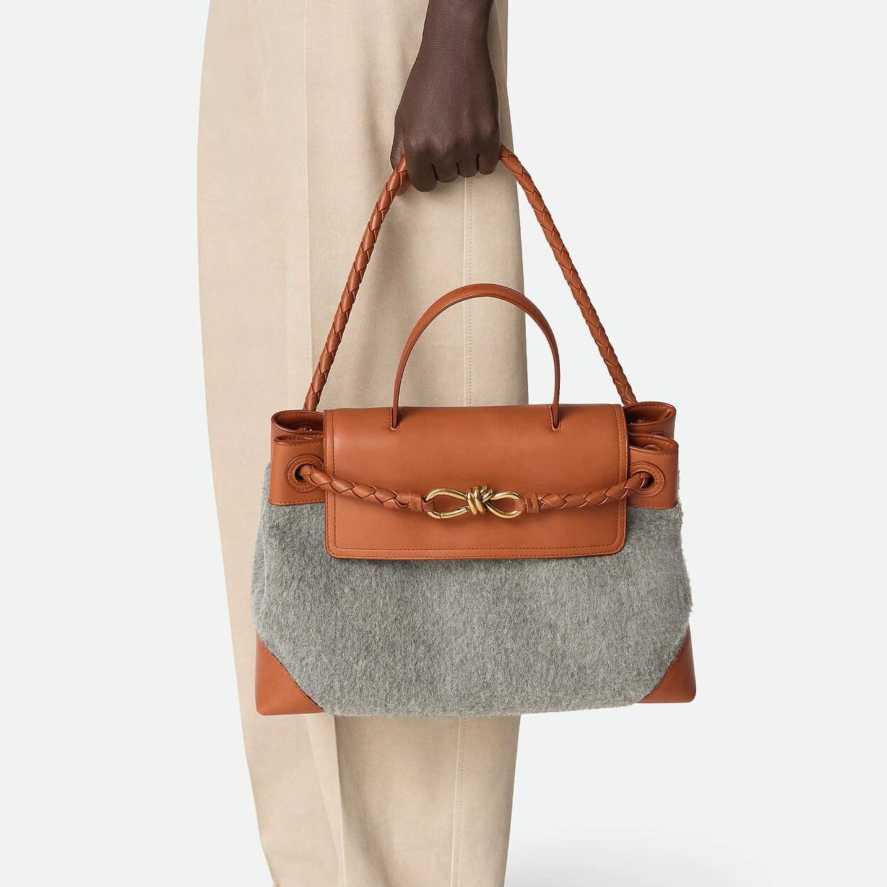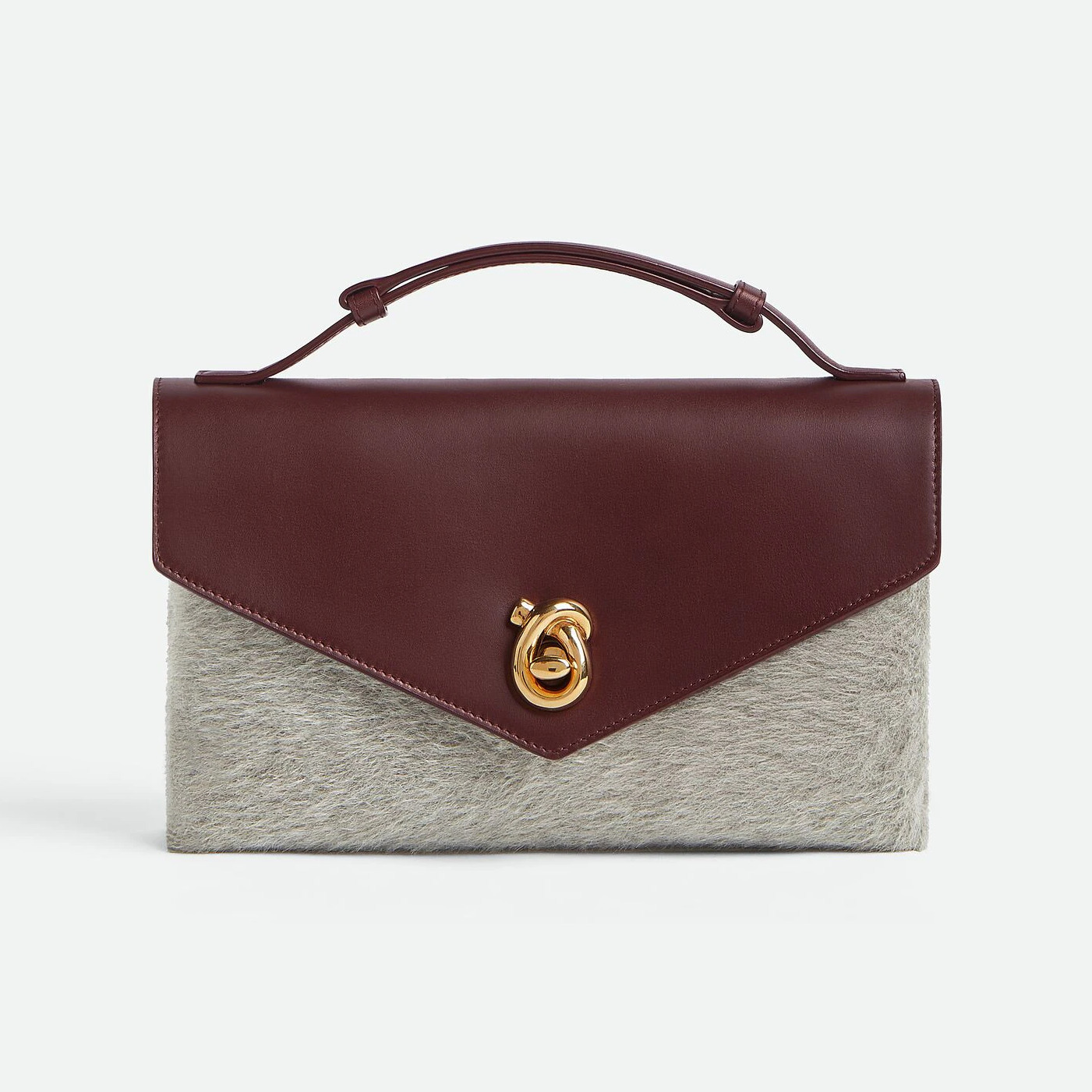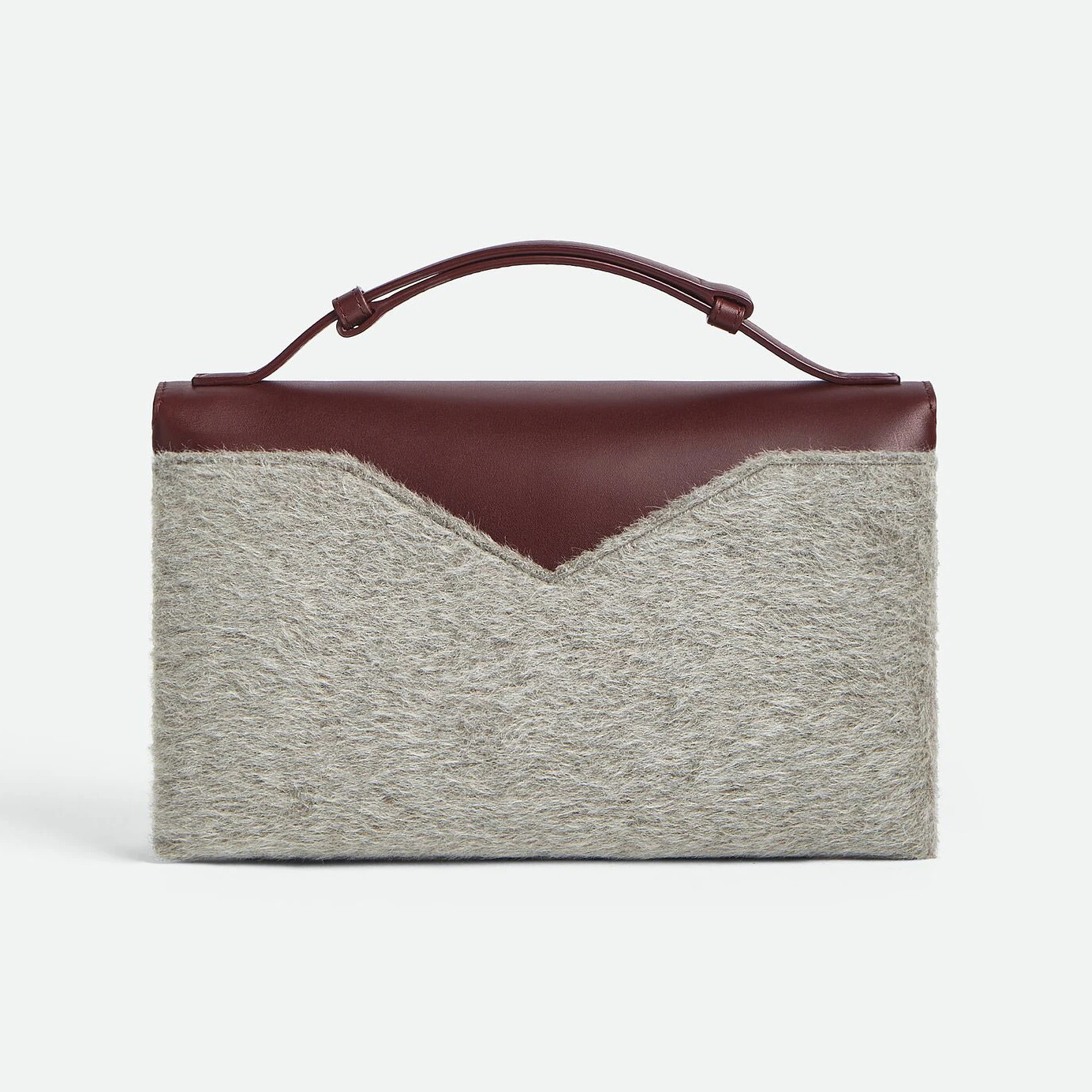 还有一只 Knot Lock 手提包,采用经典复古的信封式造型,营造出洗练率性的气质。取材灰色毛毡包身+红棕色小牛皮翻盖和提手,装饰一枚金色扭结旋锁更添精致雕塑感。