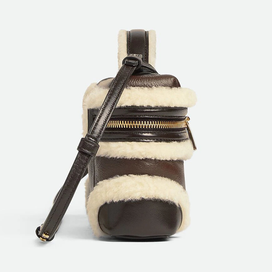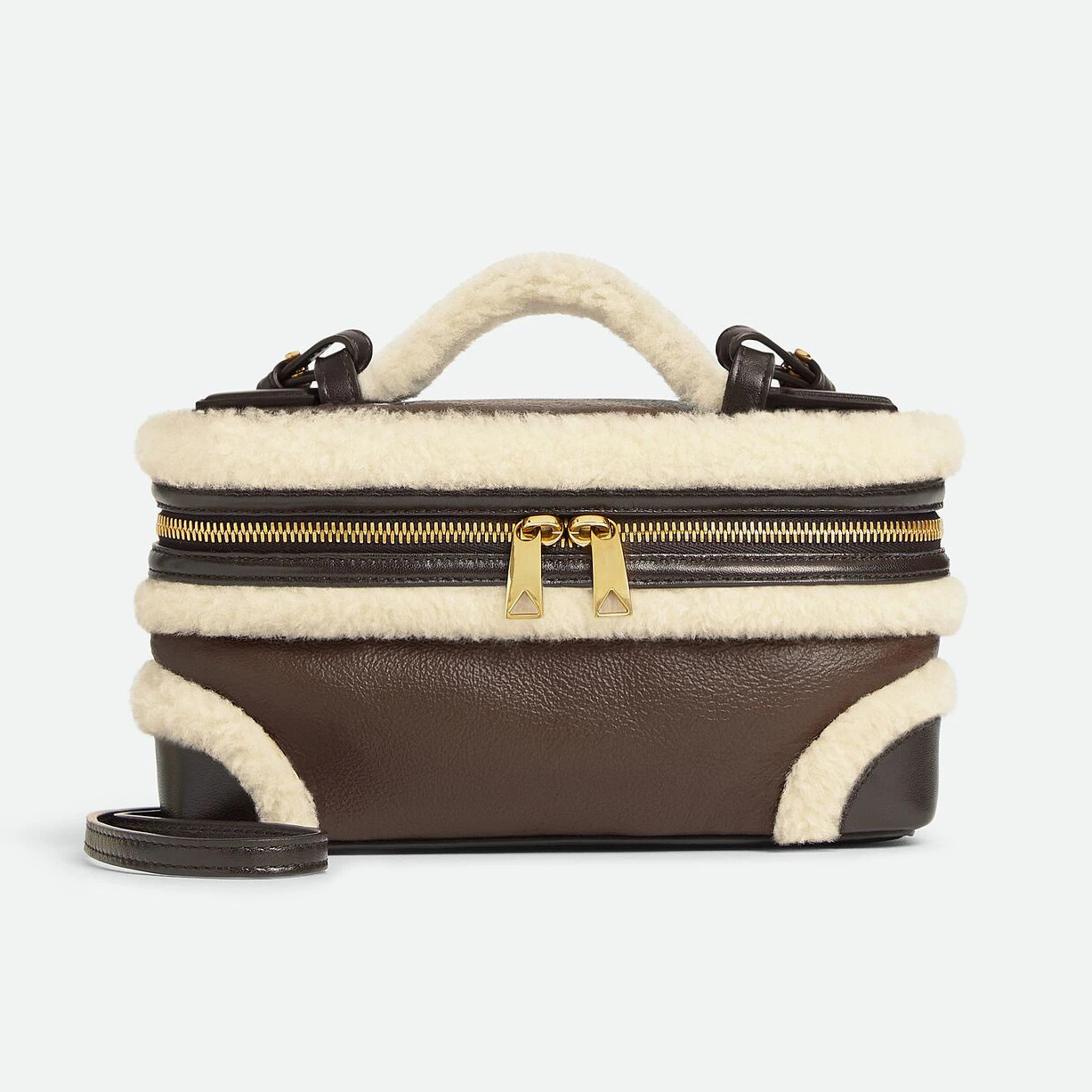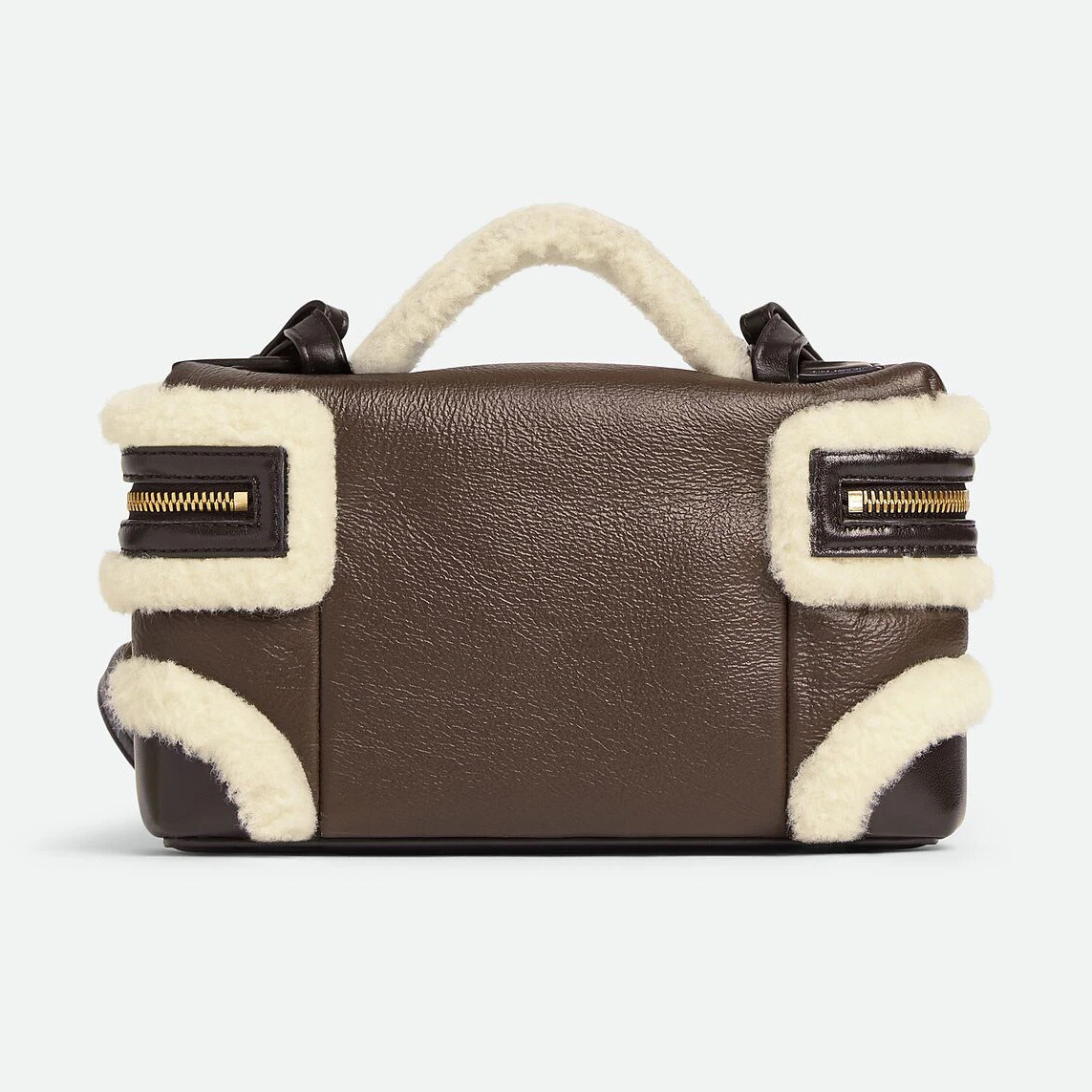 Bang Bang 化妆包取材亮棕色小羊皮制作而成,亮点是点缀奶油白色美利奴剪羊毛滚边、提手等细节,像是一层冬日积雪,又像是一件毛绒皮夹克,充满温馨冬日气息。
