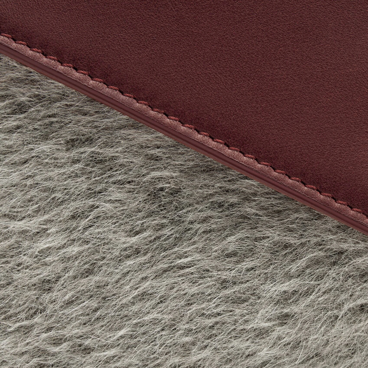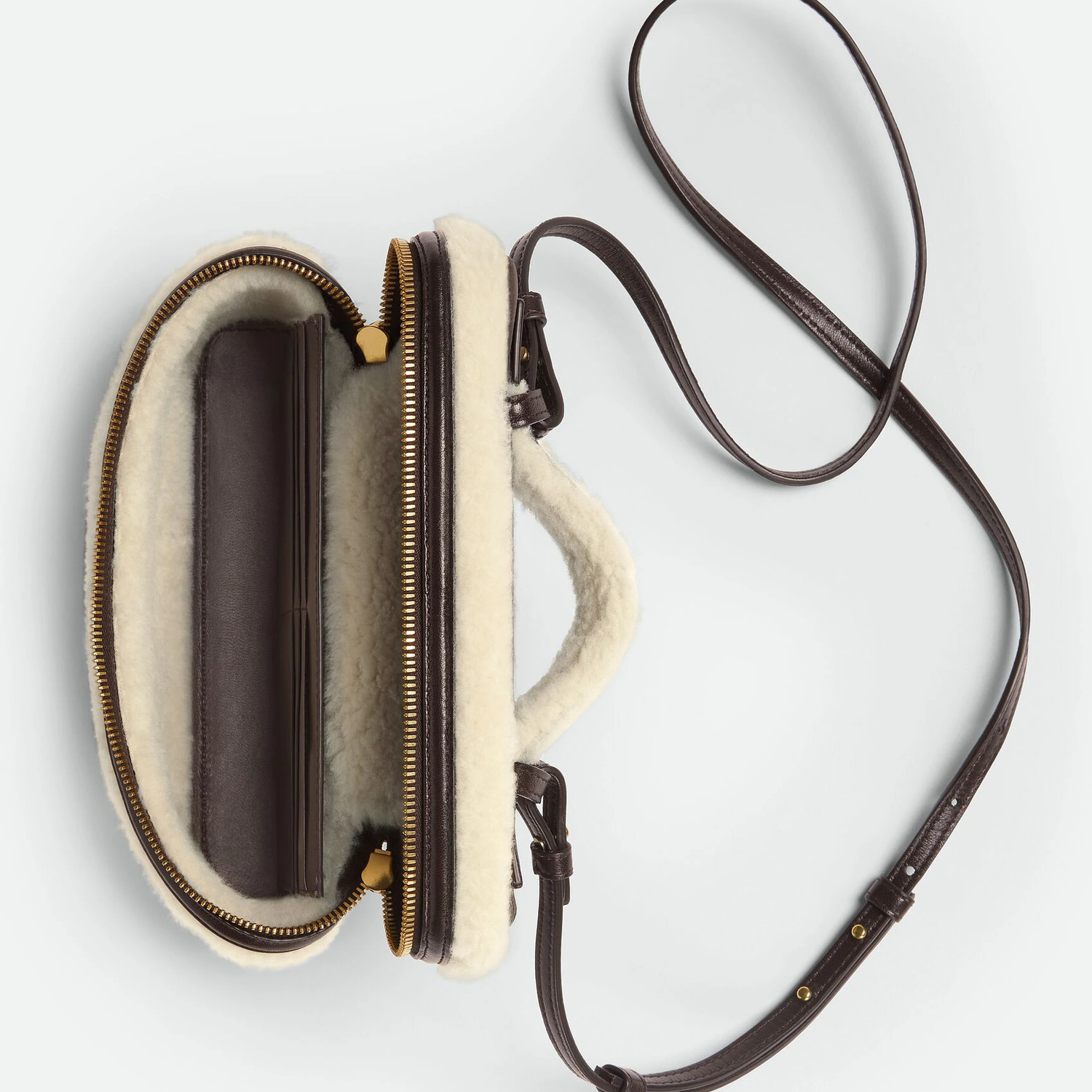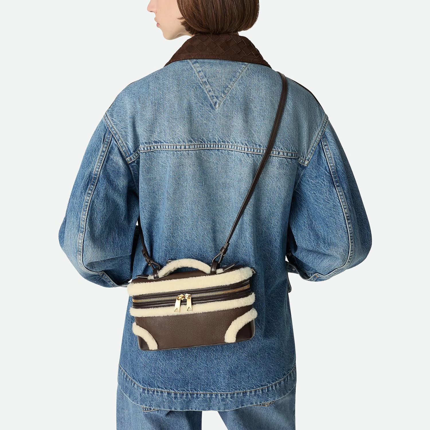 Bang Bang 化妆包取材亮棕色小羊皮制作而成,亮点是点缀奶油白色美利奴剪羊毛滚边、提手等细节,像是一层冬日积雪,又像是一件毛绒皮夹克,充满温馨冬日气息。