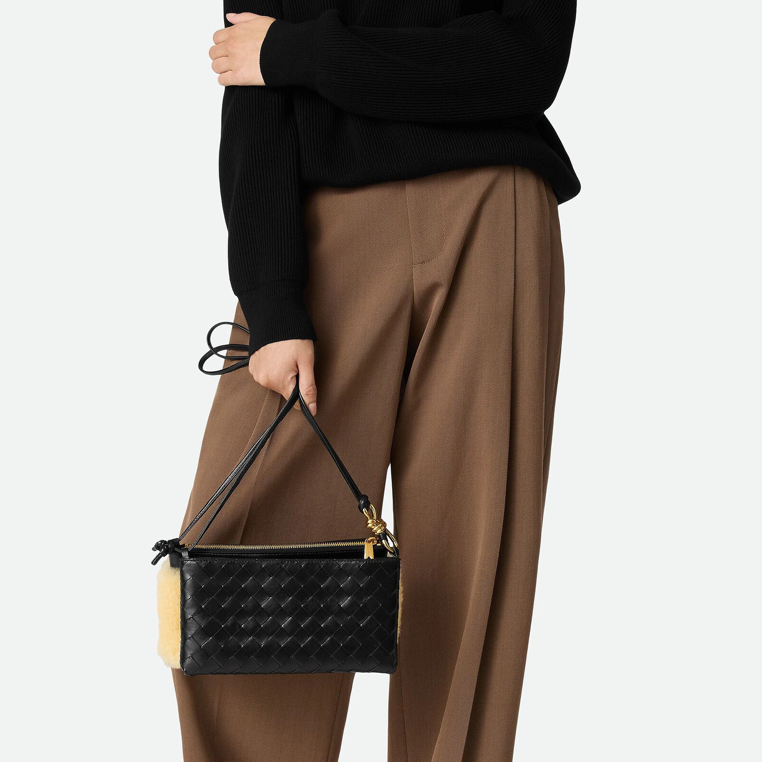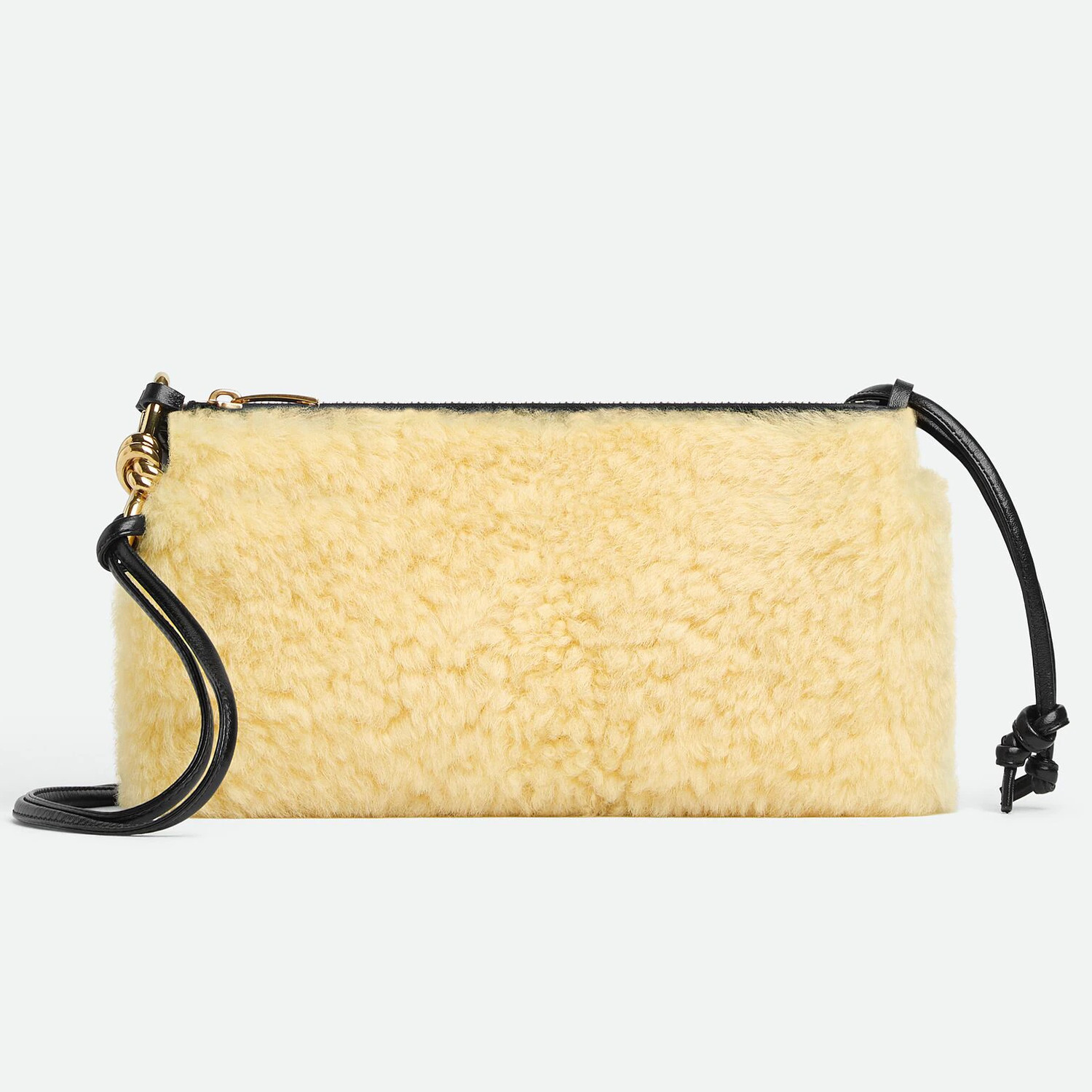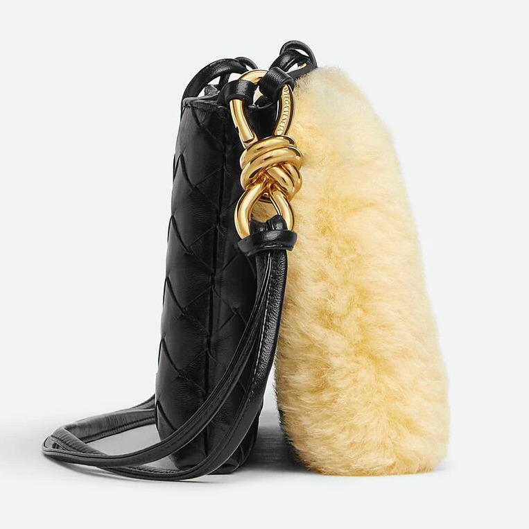 Andiamo Double Pouch 手袋采用二合一设计,由2个拉链袋拼接而成——一个是爆米花色剪羊毛小包;一个是黑色纳帕小牛皮编织小包,包包像是铺了一层甜甜的奶盖。