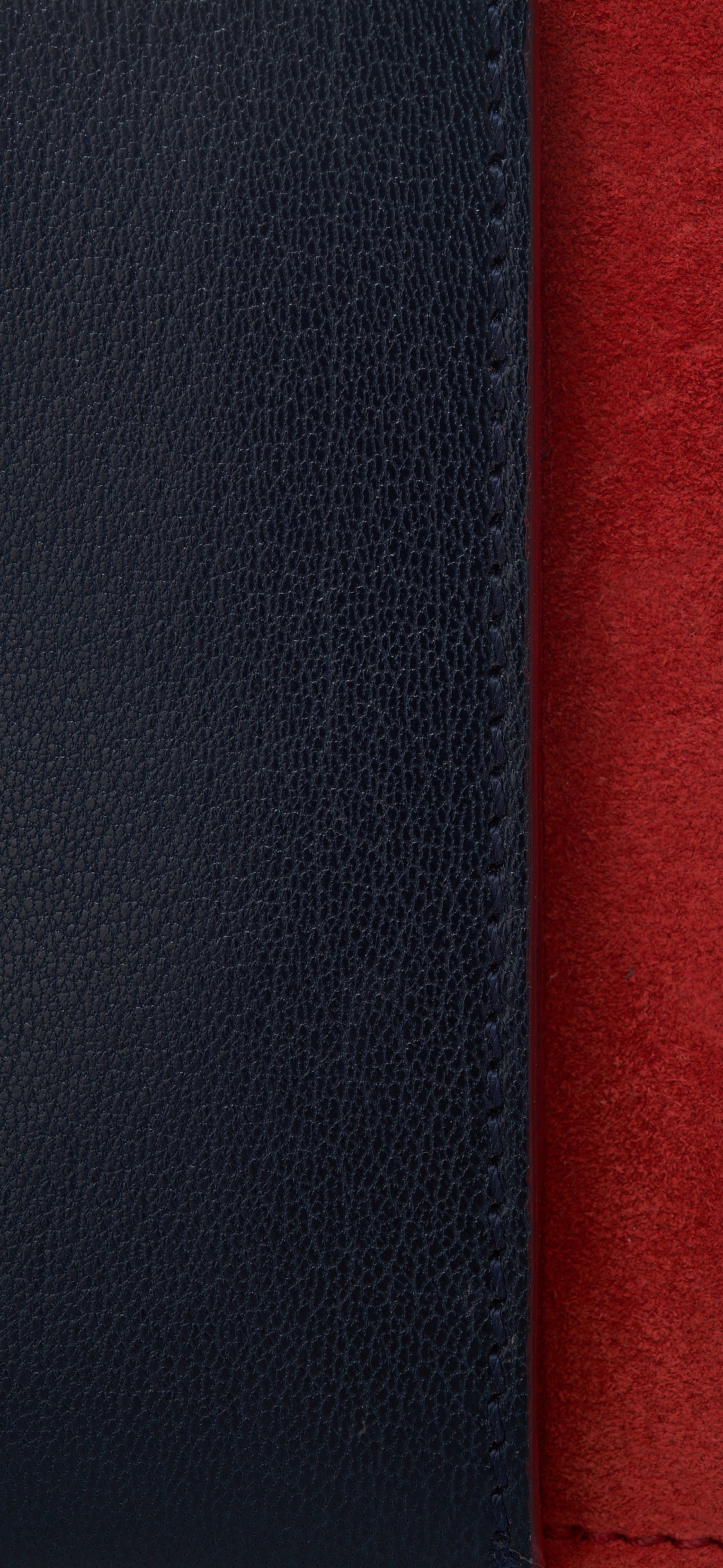 包身使用了两种不同工艺的皮革——蓝色为平纹山羊皮,经过 Tamponato 染色工艺处理,拥有柔亮自然的皮革色彩;红色为绒面革,为包包增添亮丽气质,从质感到颜色,呈现反差之美。