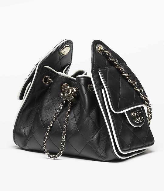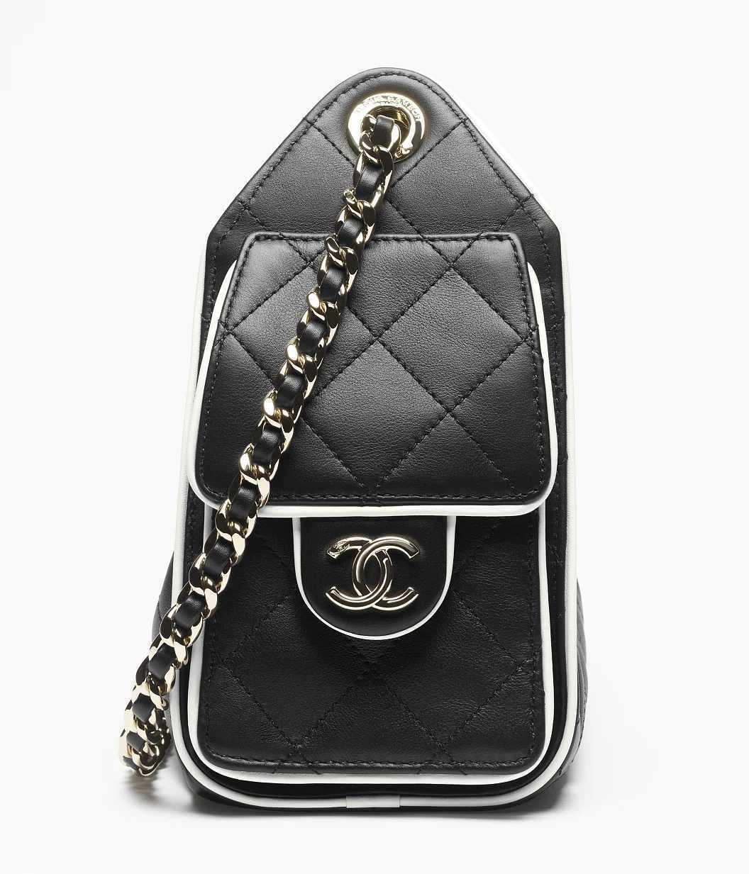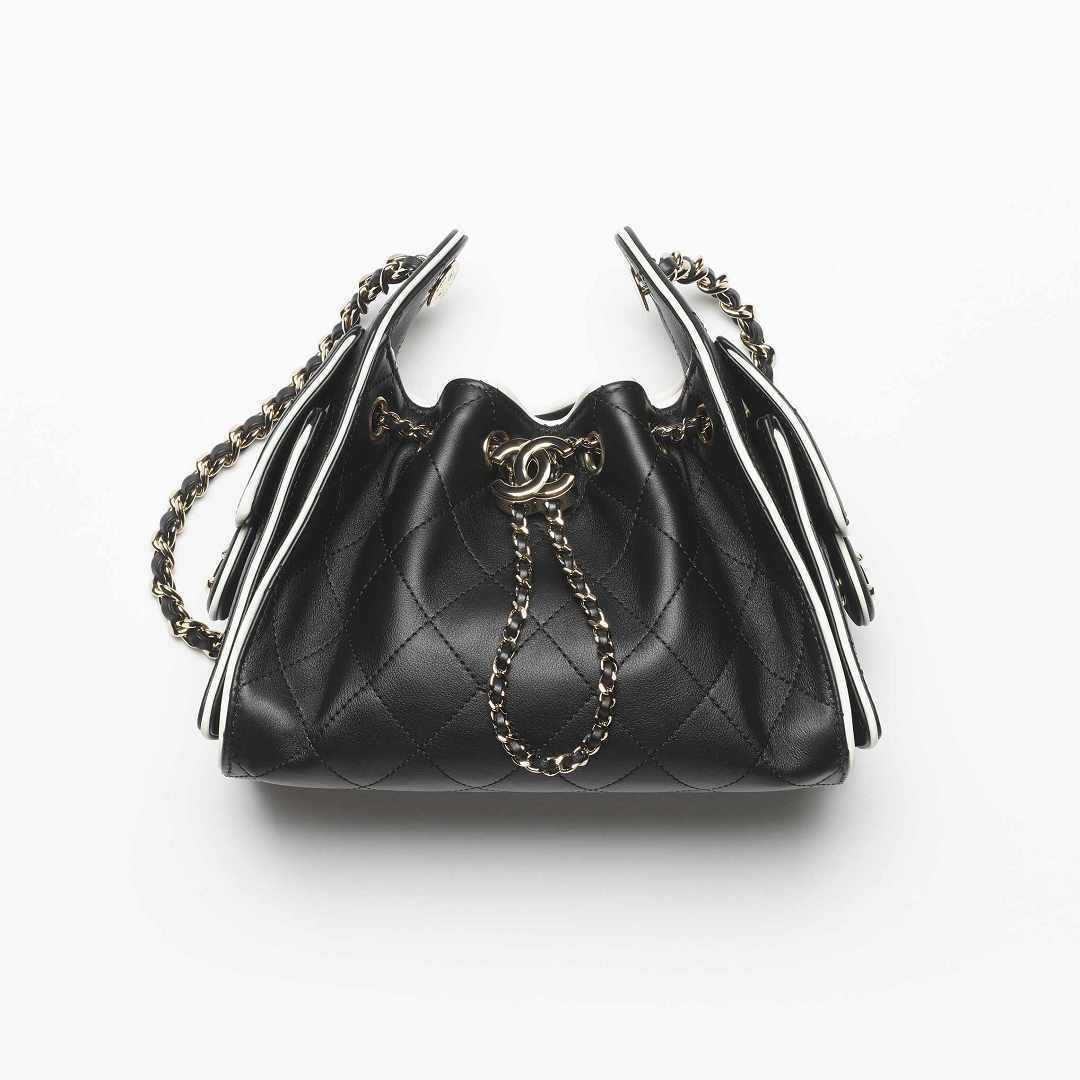 这只 Chanel 25 迷你手袋以白色皮革绲边勾勒黑色菱格纹小牛皮包身,对比鲜明的黑白撞色让人联想到 Chanel 经典双色套装,呈现叛逆不羁格调。