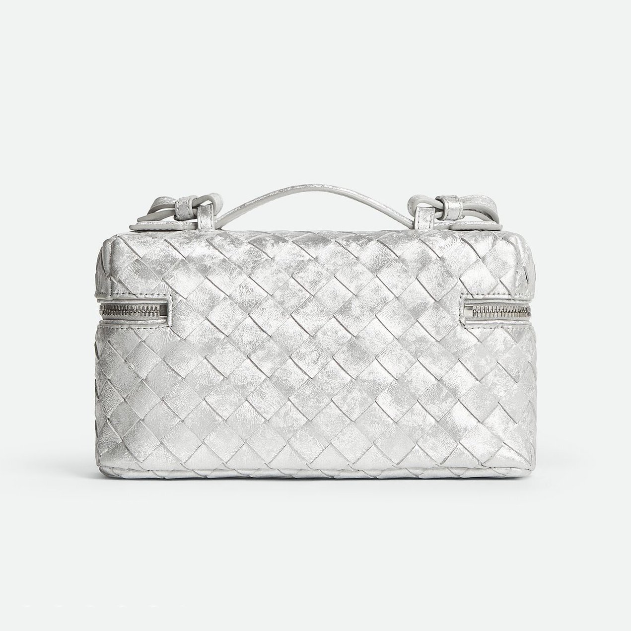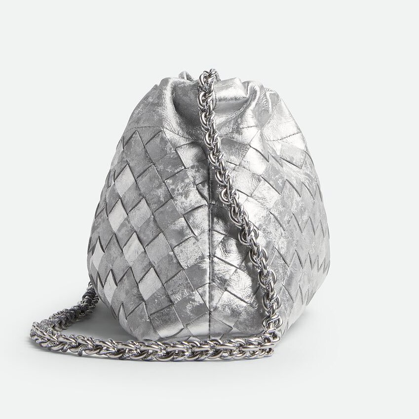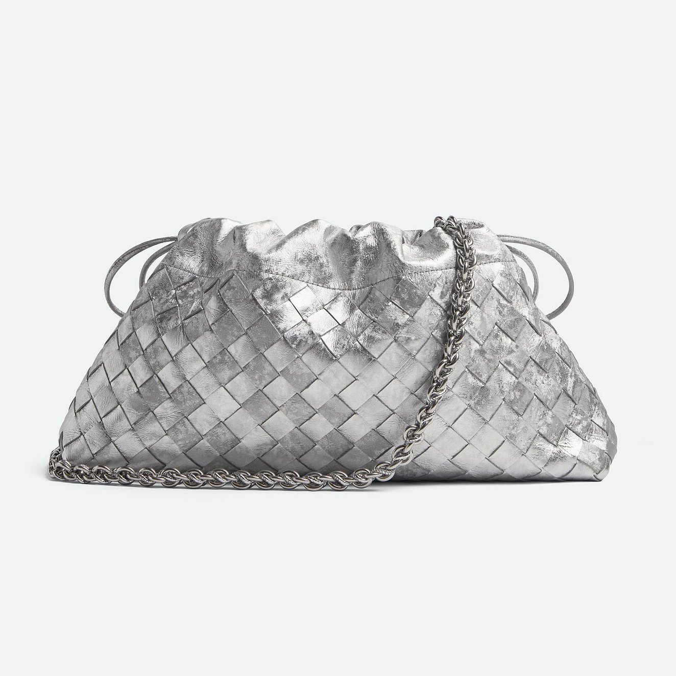 银色系包包人联想到银装素裹的雪季,和冬季氛围格外 Match。新作采用丝缎质感层压小羊皮为主材质,让本身就柔嫩的小羊皮更添温润细腻的缎面质感,采用品牌标志性的 Intrecciato 编织工艺制作,包包仿佛撒上了一层闪烁的银霜,显得精致又优雅。