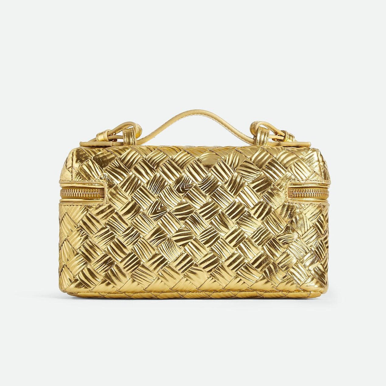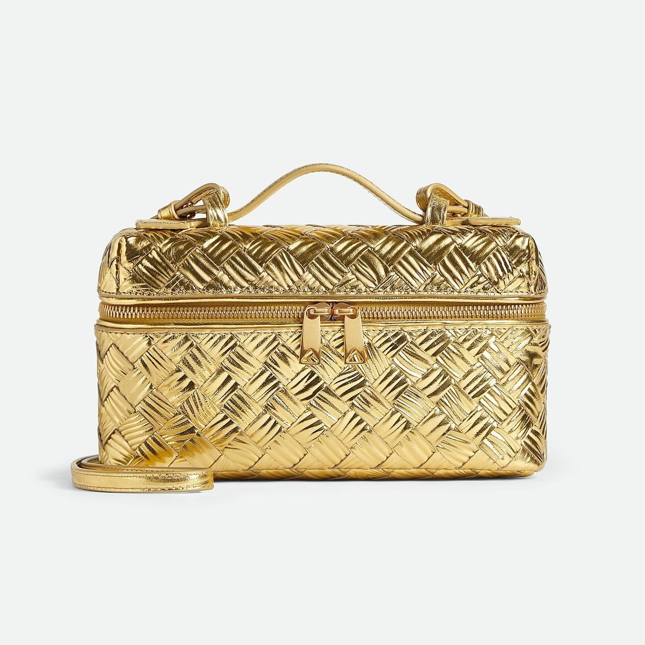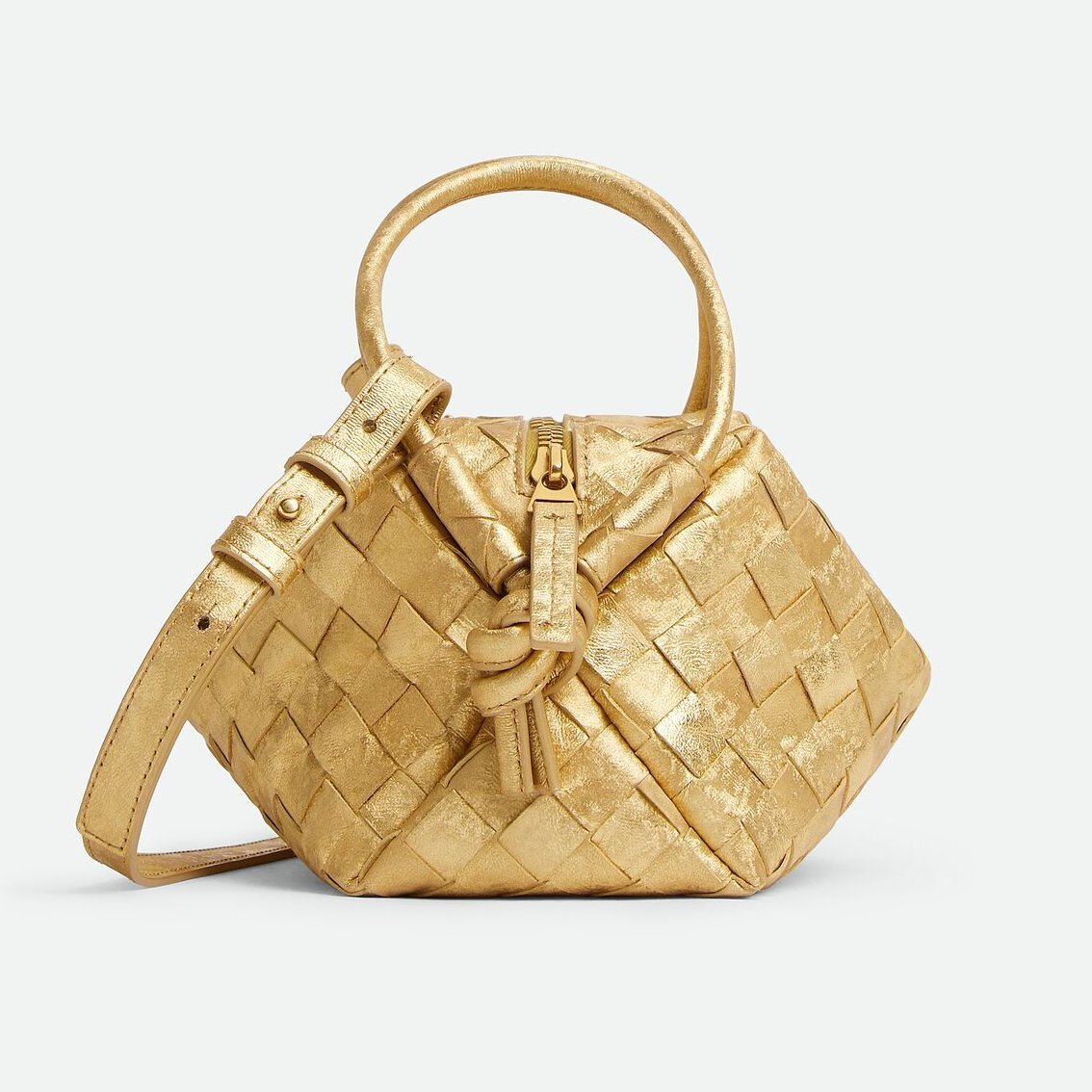 最夺人眼球的是这组金色包袋,取材木纹烫印层压小牛皮编织而成,像是镜面反光质感般鎏光闪耀,表面可以看到竖条纹理,营造出立体起伏的视觉效果。