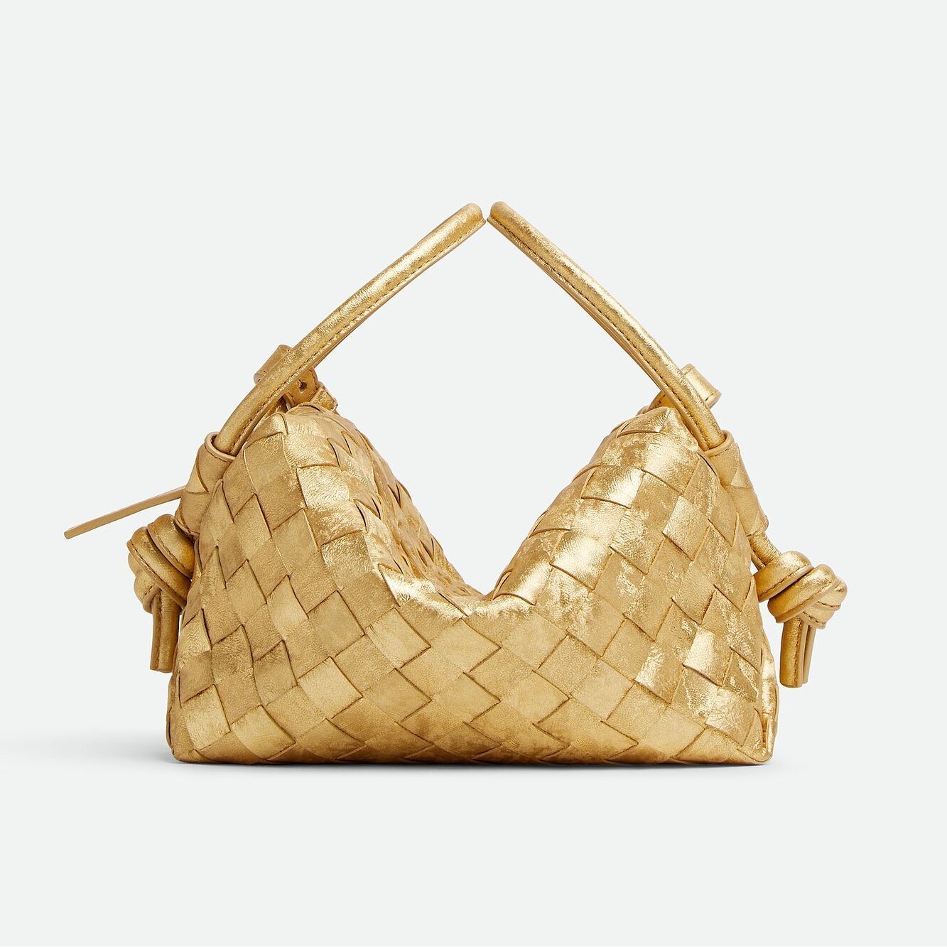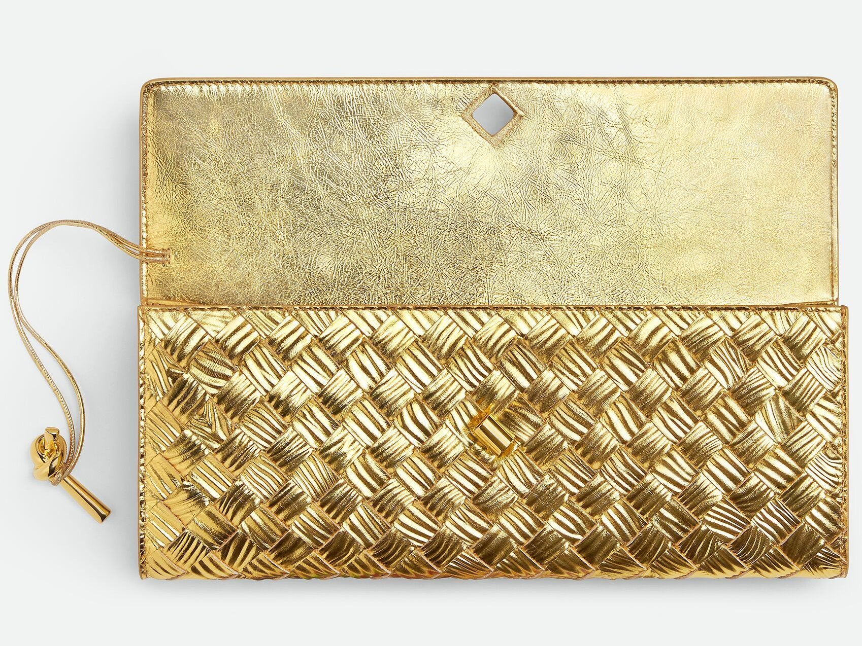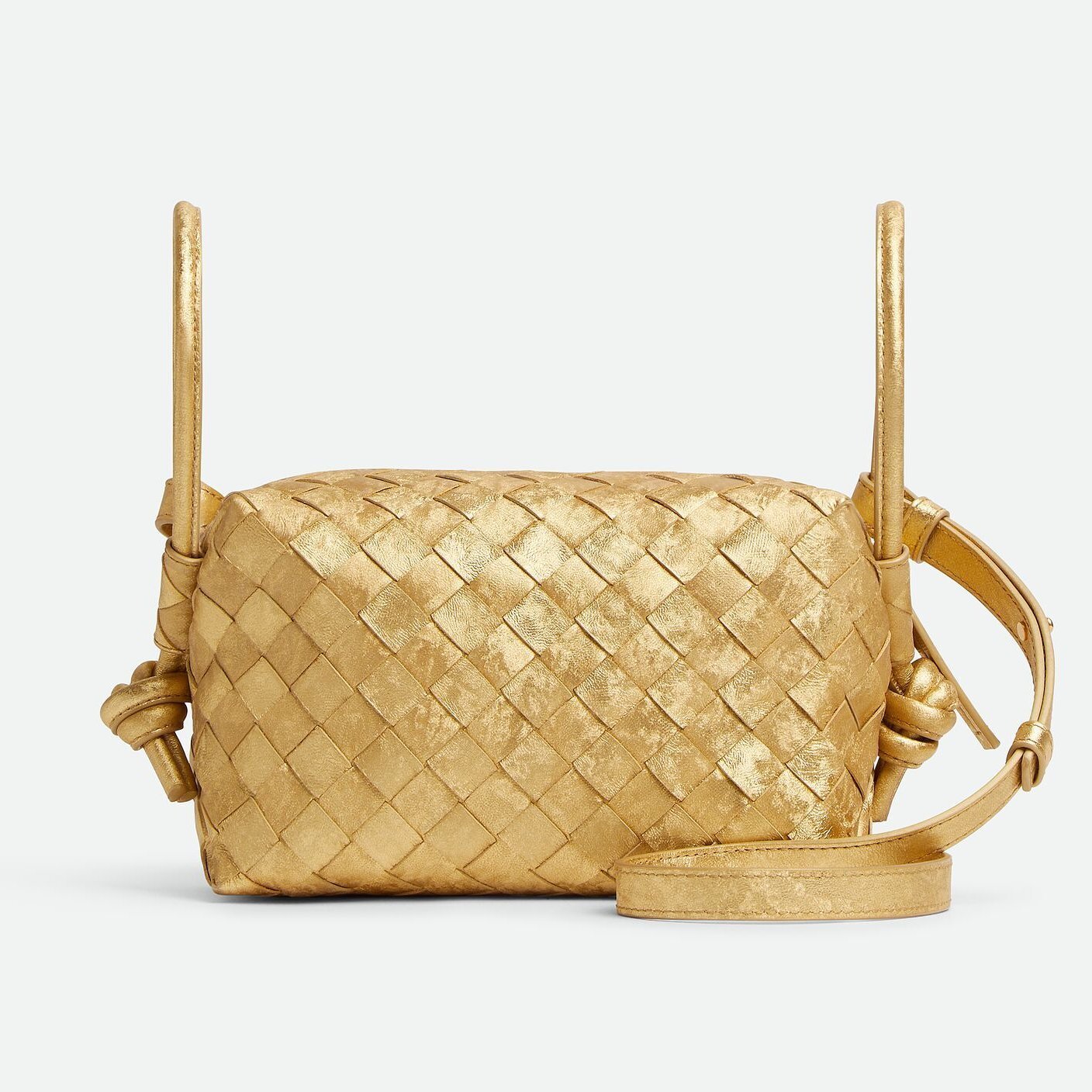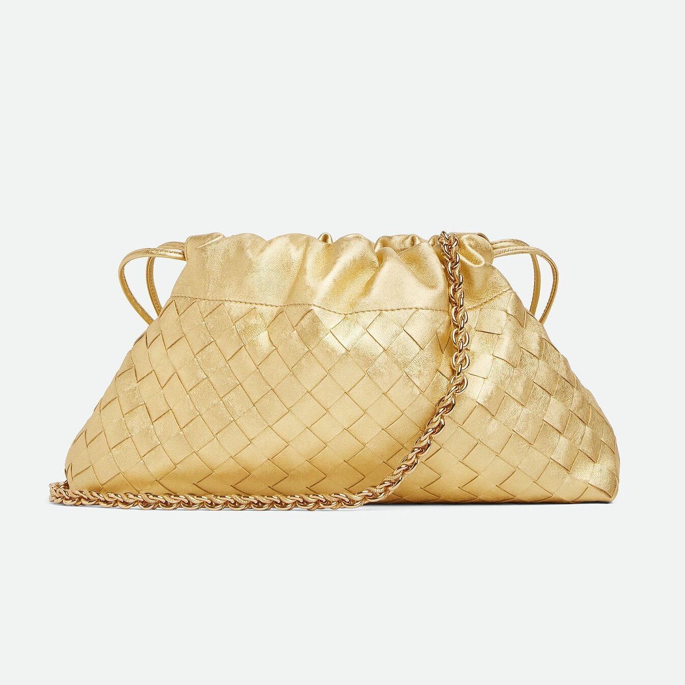 这组包包采用金色丝缎质感层压小羊皮制作,你可以看到小羊皮编织饰条上的细腻纹理,像是在袋身包裹了一层金箔,流露出复古浮华的千禧年风格。