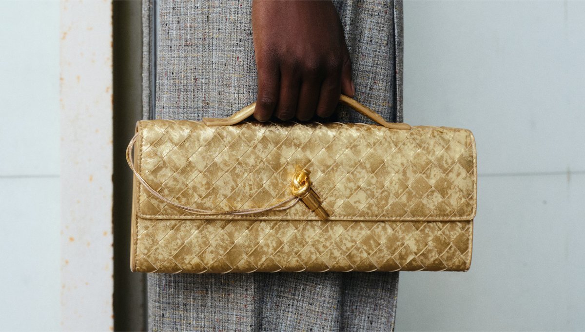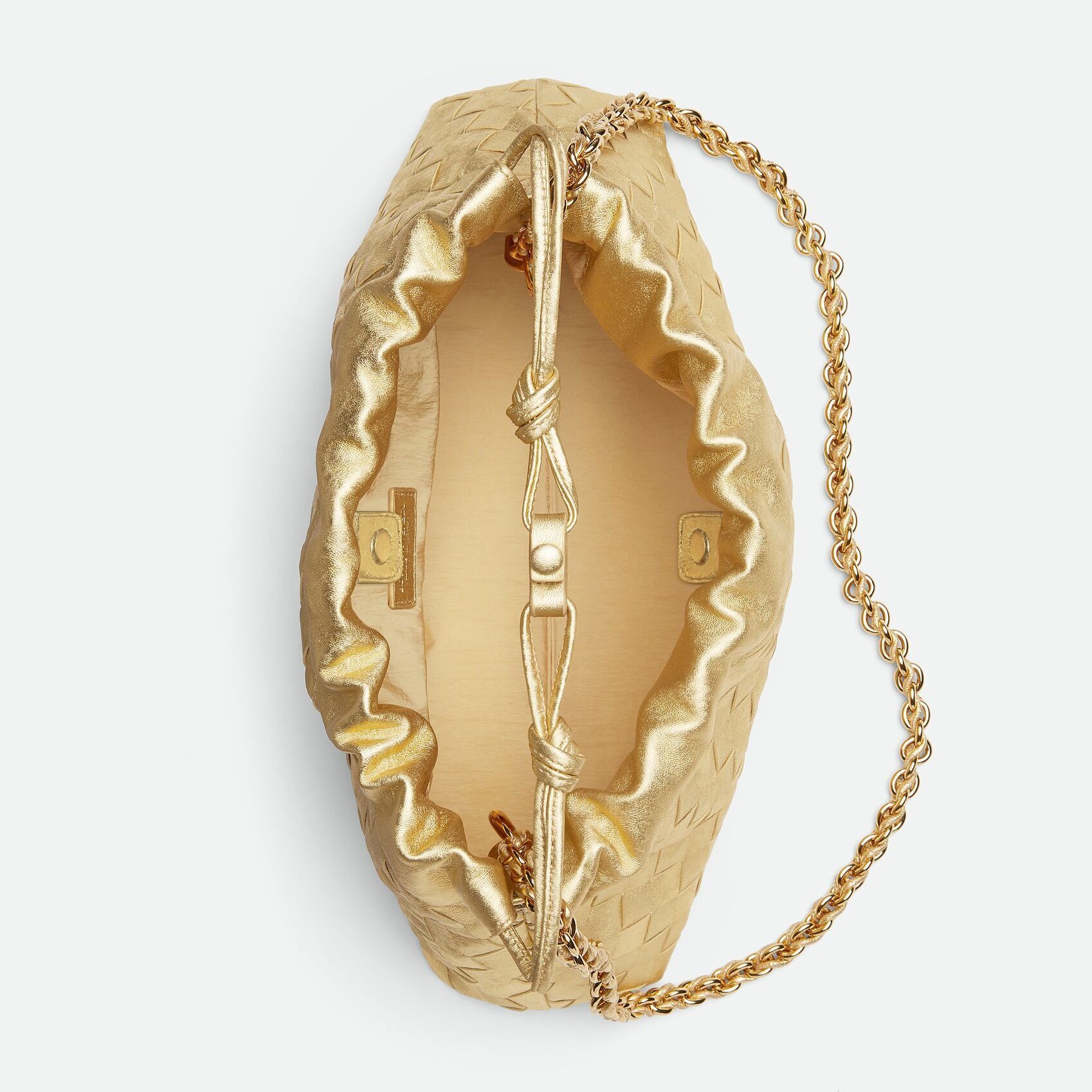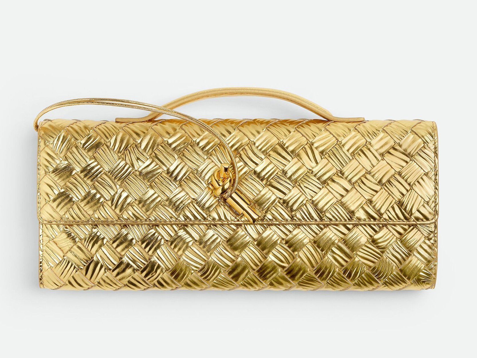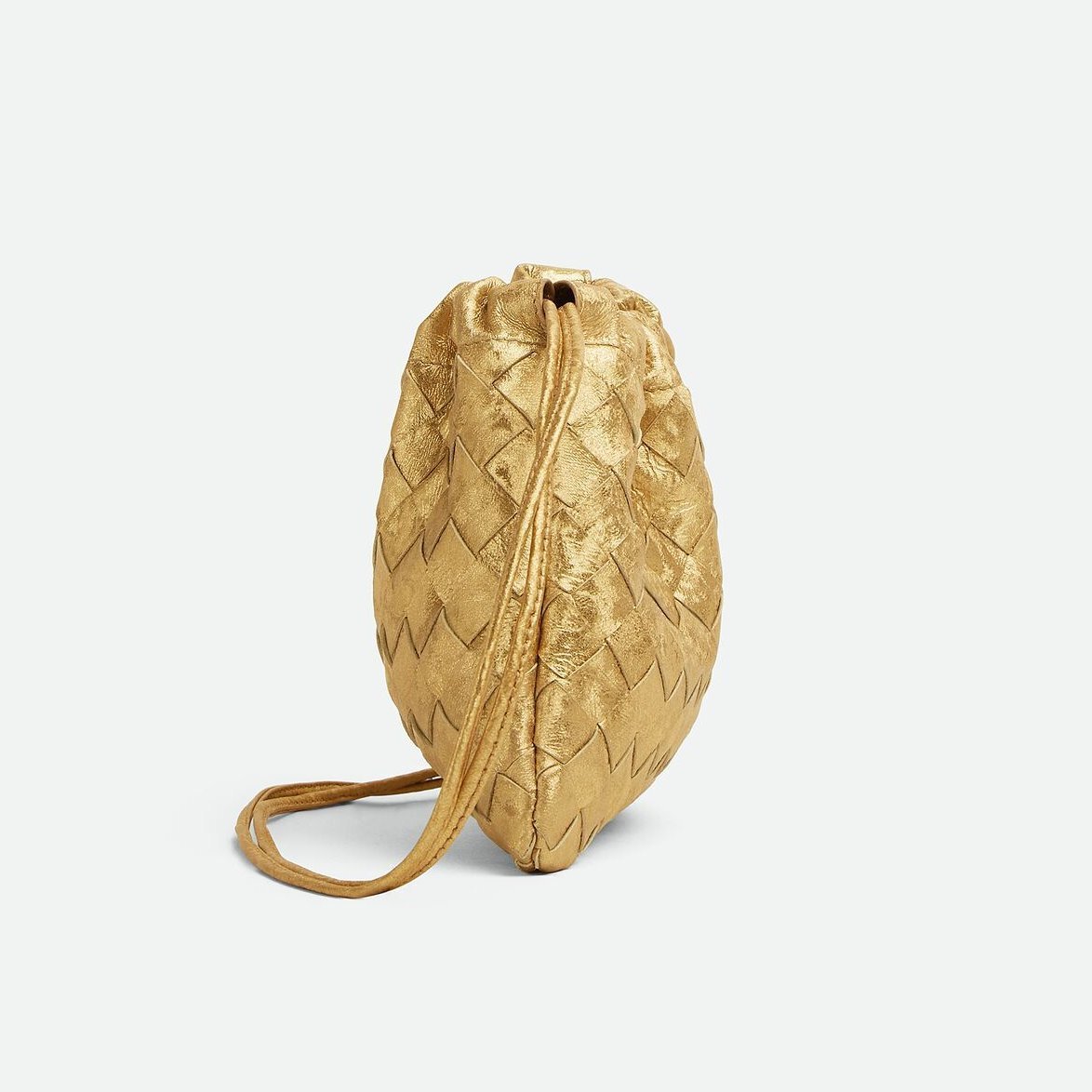 这组包包采用金色丝缎质感层压小羊皮制作,你可以看到小羊皮编织饰条上的细腻纹理,像是在袋身包裹了一层金箔,流露出复古浮华的千禧年风格。