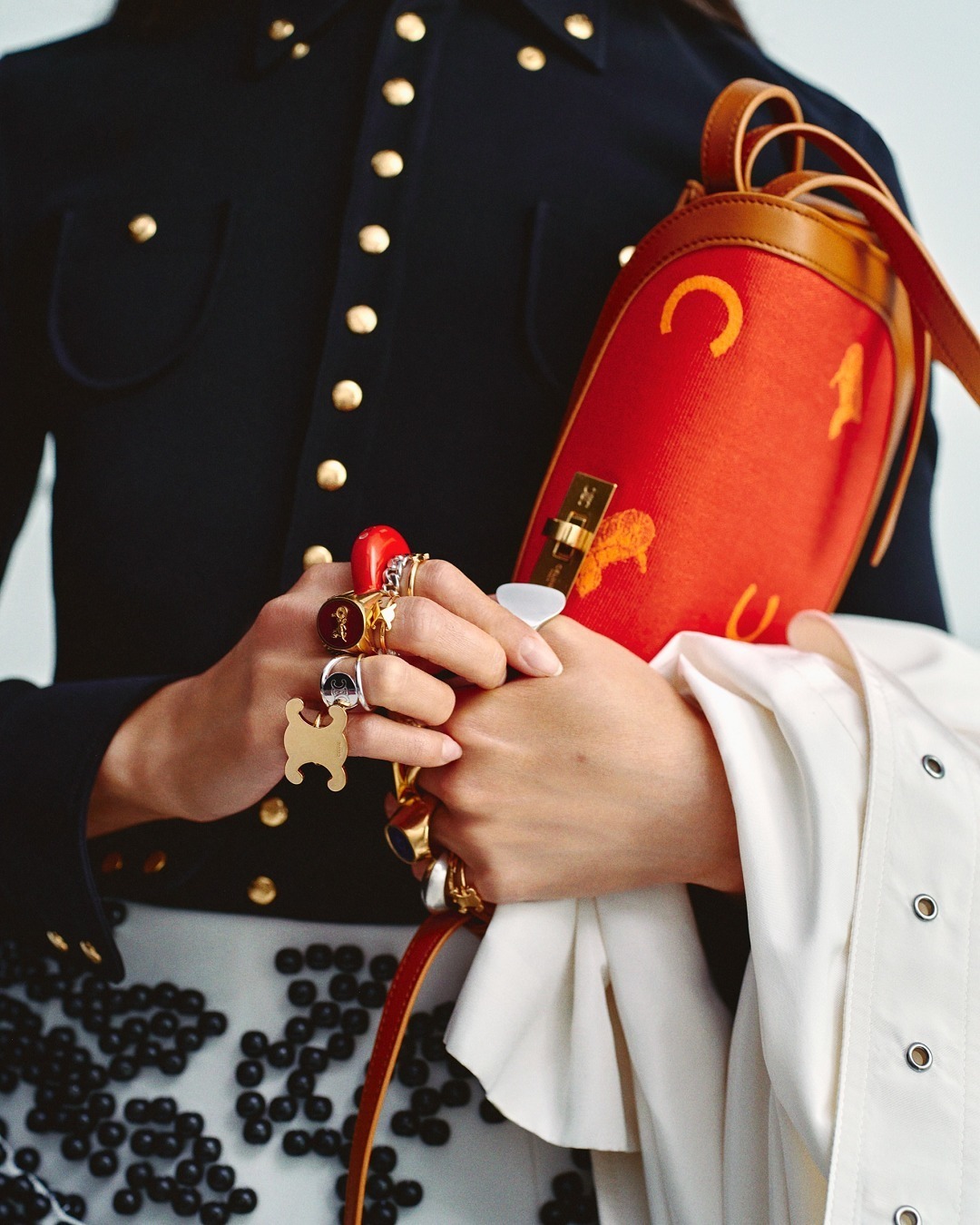 16 系列推出顶部开合的全新包型,延续标志性半圆形金属旋锁设计。另外还推出一款马车徽标印花帆布马鞍包,搭配棕色皮革饰边,颇有复古学院风情。
