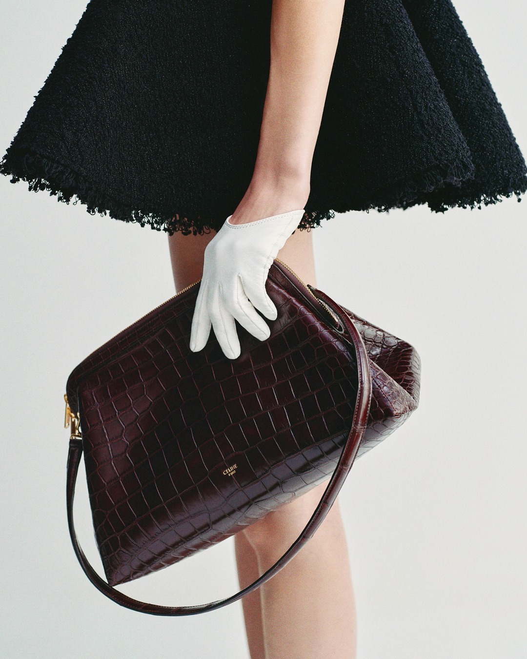 新季包袋作品中可以看到全新登场的手拎包,采用富有建筑感的梯形结构搭配顶部拉链开合结构,推出鳄鱼纹皮革、光面皮革和亮面皮革款式,呈现复古优雅面貌。