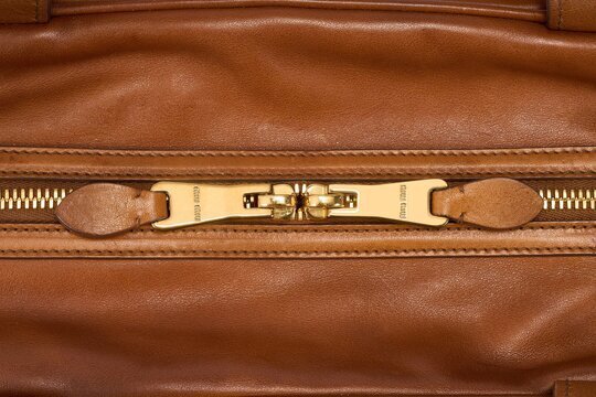 打开双向拉链,可以看到深棕色棉质内衬,以及一枚金色徽标皮革片装饰。