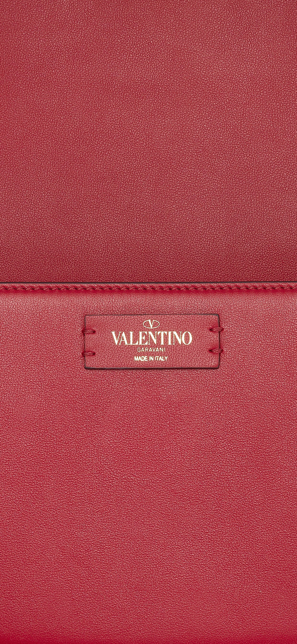 打开手袋最先看到的是 Valentino Red 红色皮标和内袋,与黑色小牛皮里衬形成反差。宽敞的中央主隔层足以收纳日常所需,前后侧扁平隔层可以存放手机、票据、证件等轻薄物品。