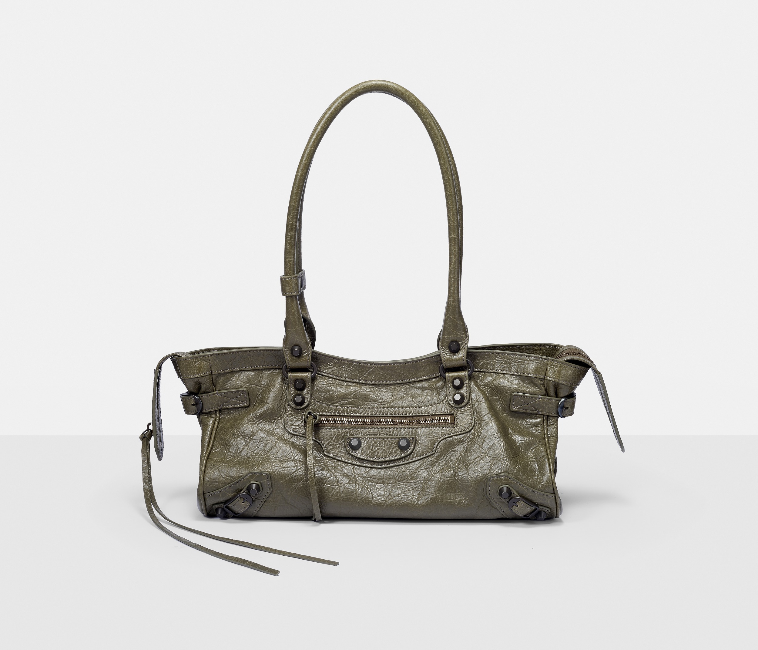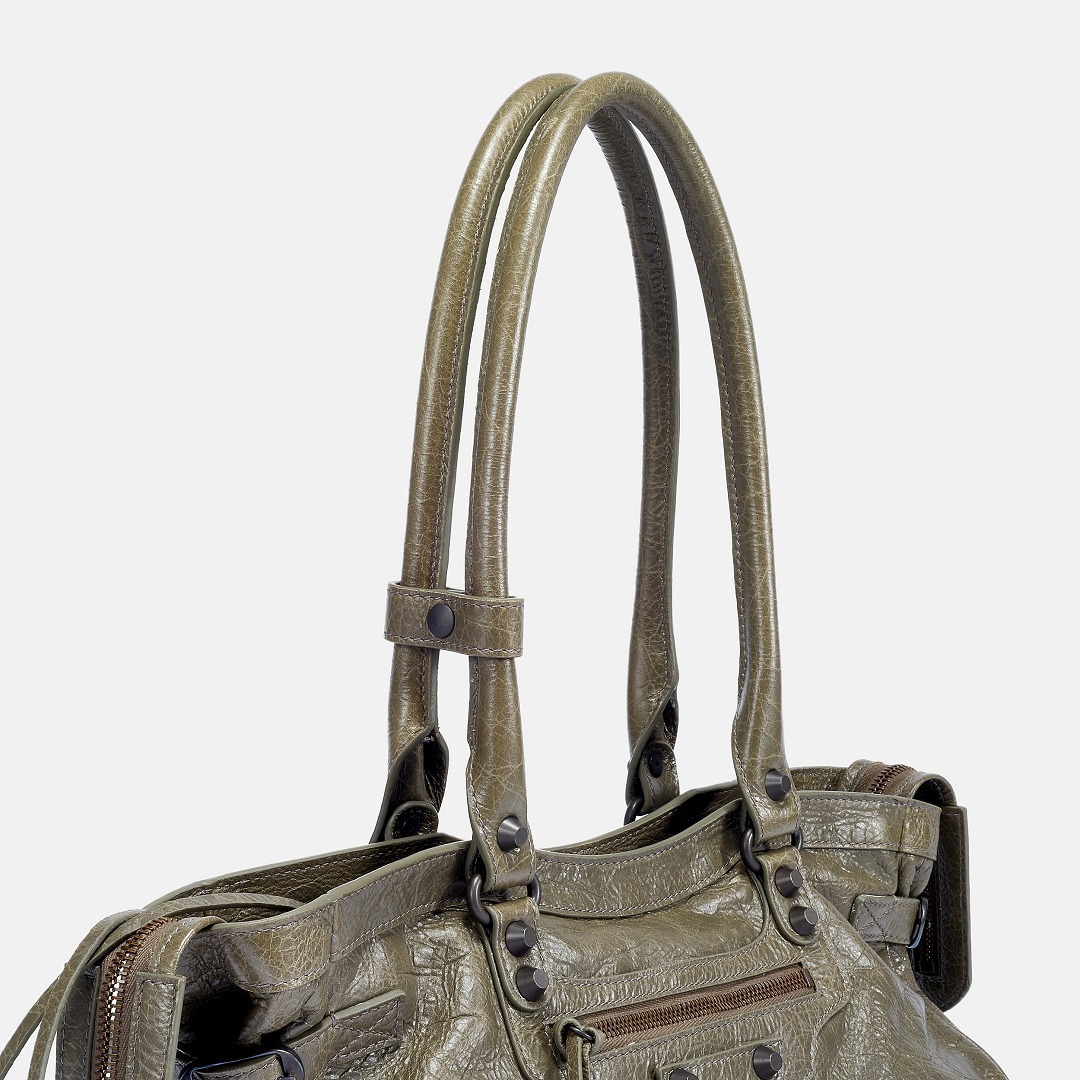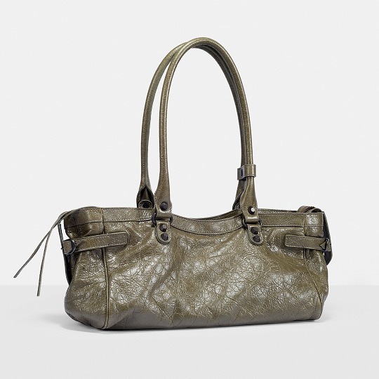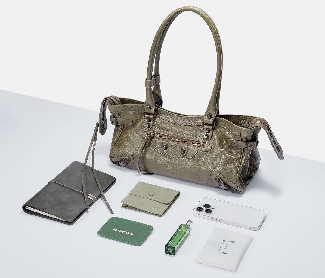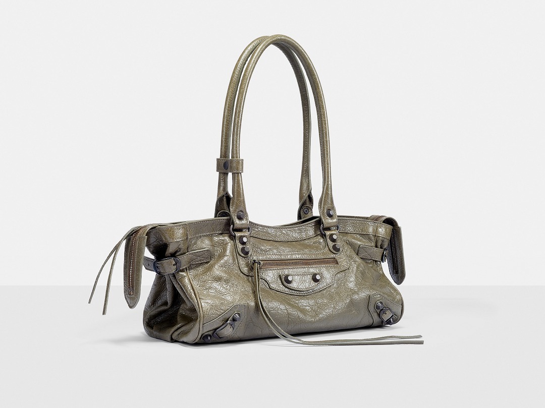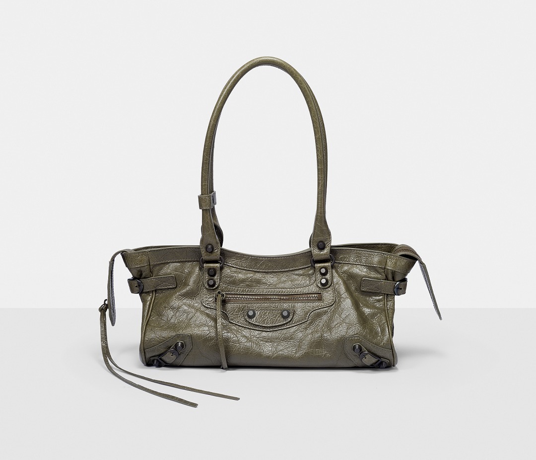 Le City East-West 横款手袋在 Balenciaga 冬季25系列中首次亮相,采用39.8cm长x17.7cm高x14.9cm宽的修长法棍包型搭配加长的皮革双手柄,重新调整的比例让包包能够随时切换手拎或肩背方式,契合繁忙的都市生活节奏。