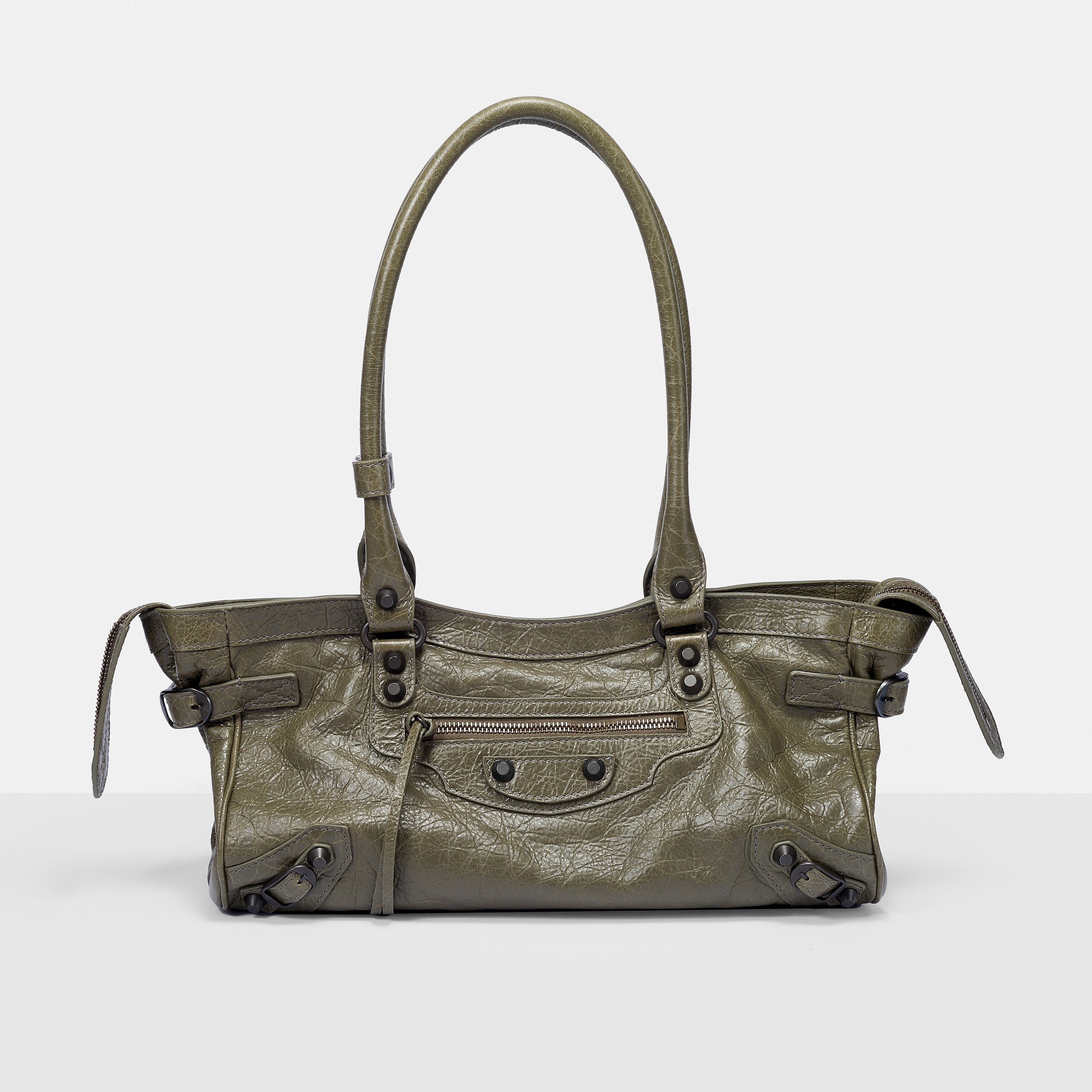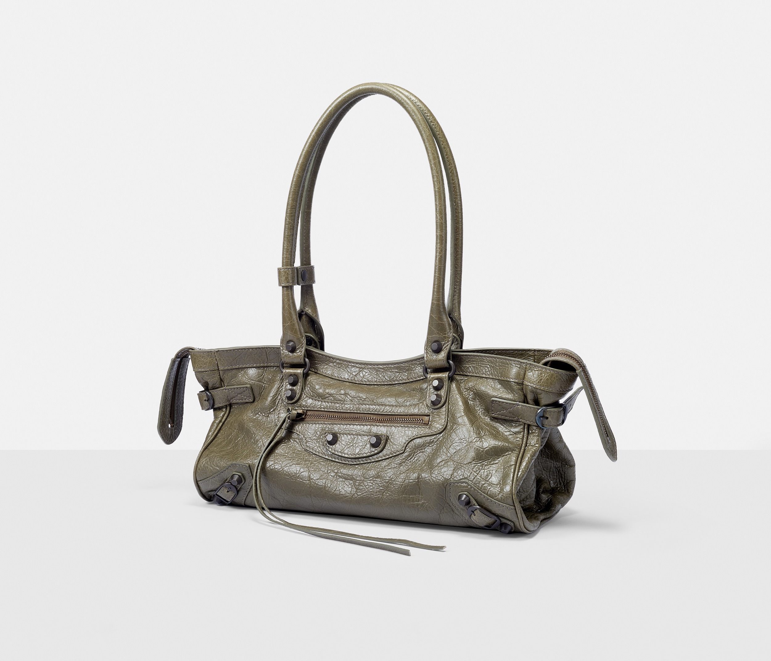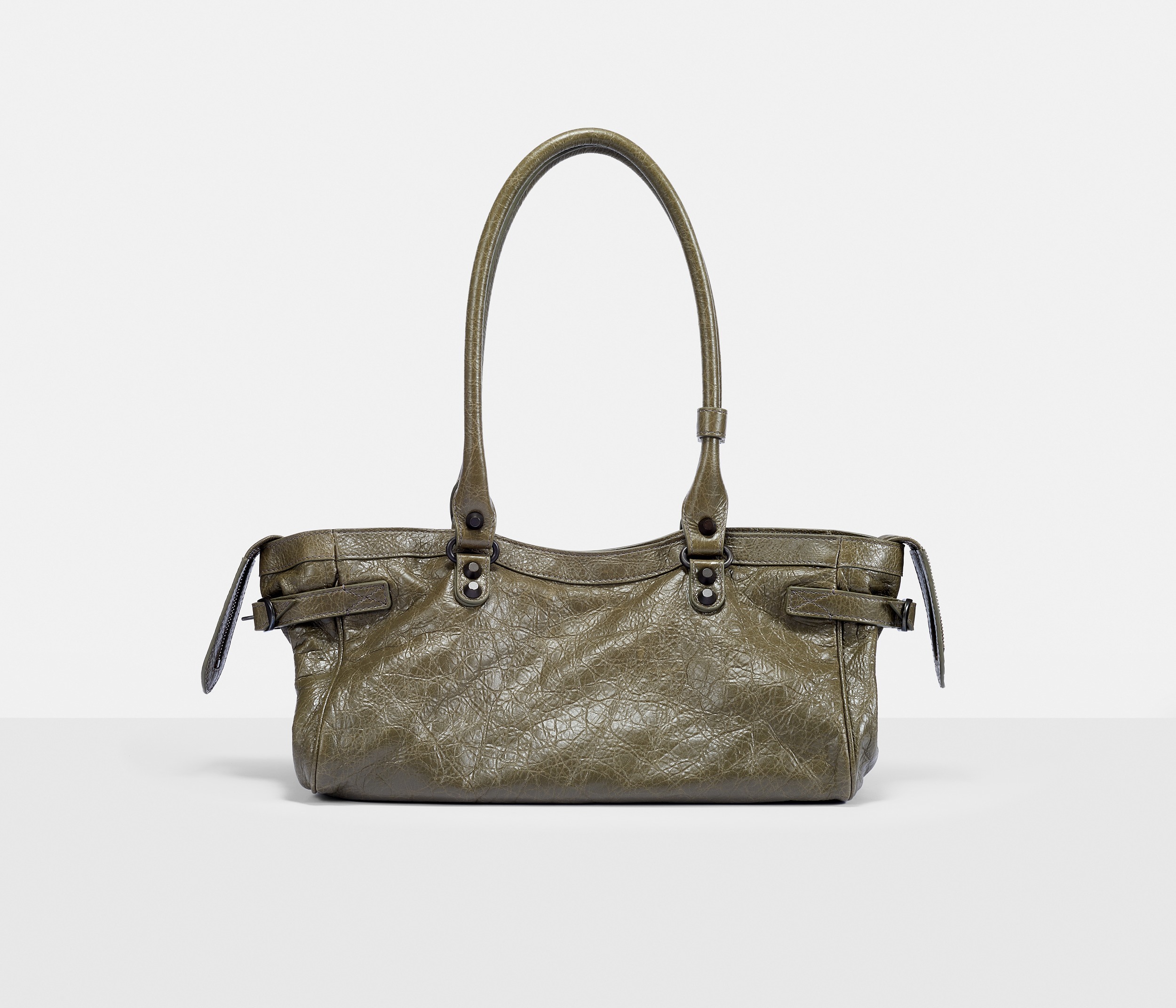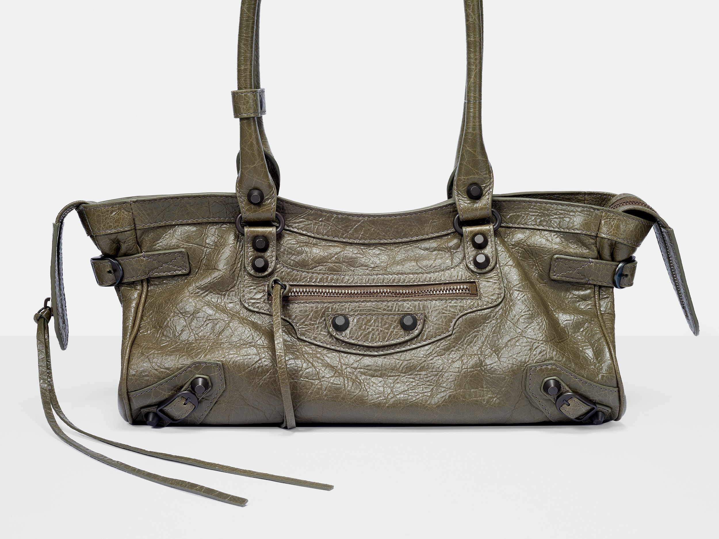 Le City East-West 横款手袋在 Balenciaga 冬季25系列中首次亮相,采用39.8cm长x17.7cm高x14.9cm宽的修长法棍包型搭配加长的皮革双手柄,重新调整的比例让包包能够随时切换手拎或肩背方式,契合繁忙的都市生活节奏。