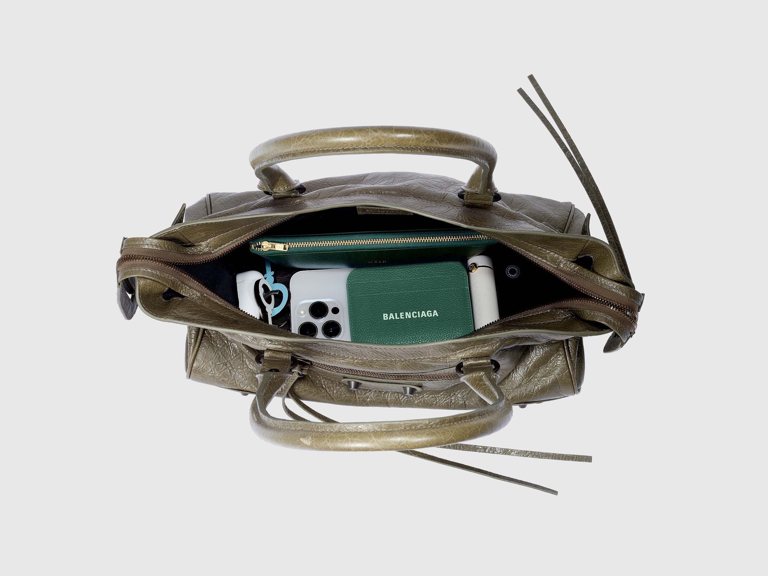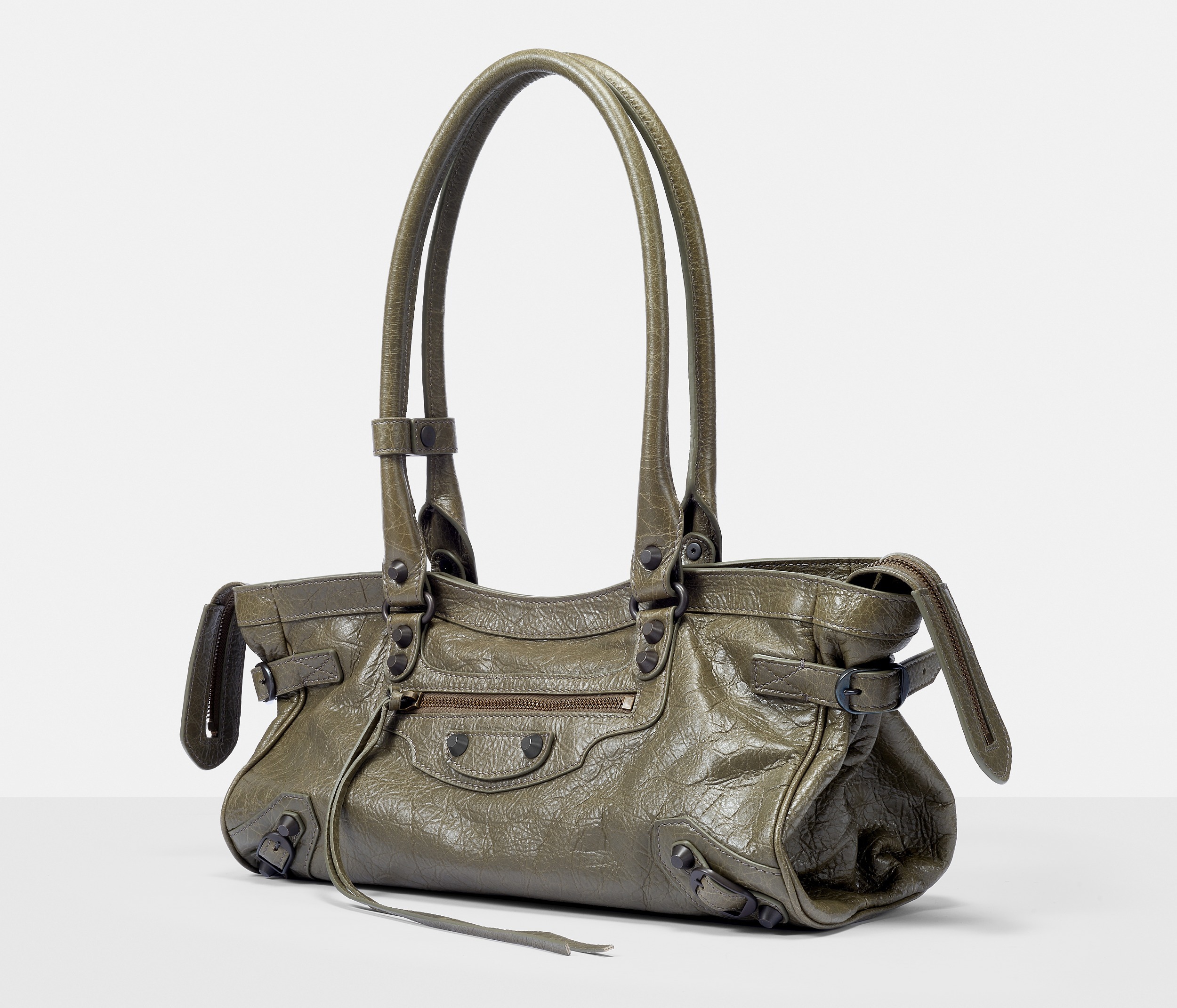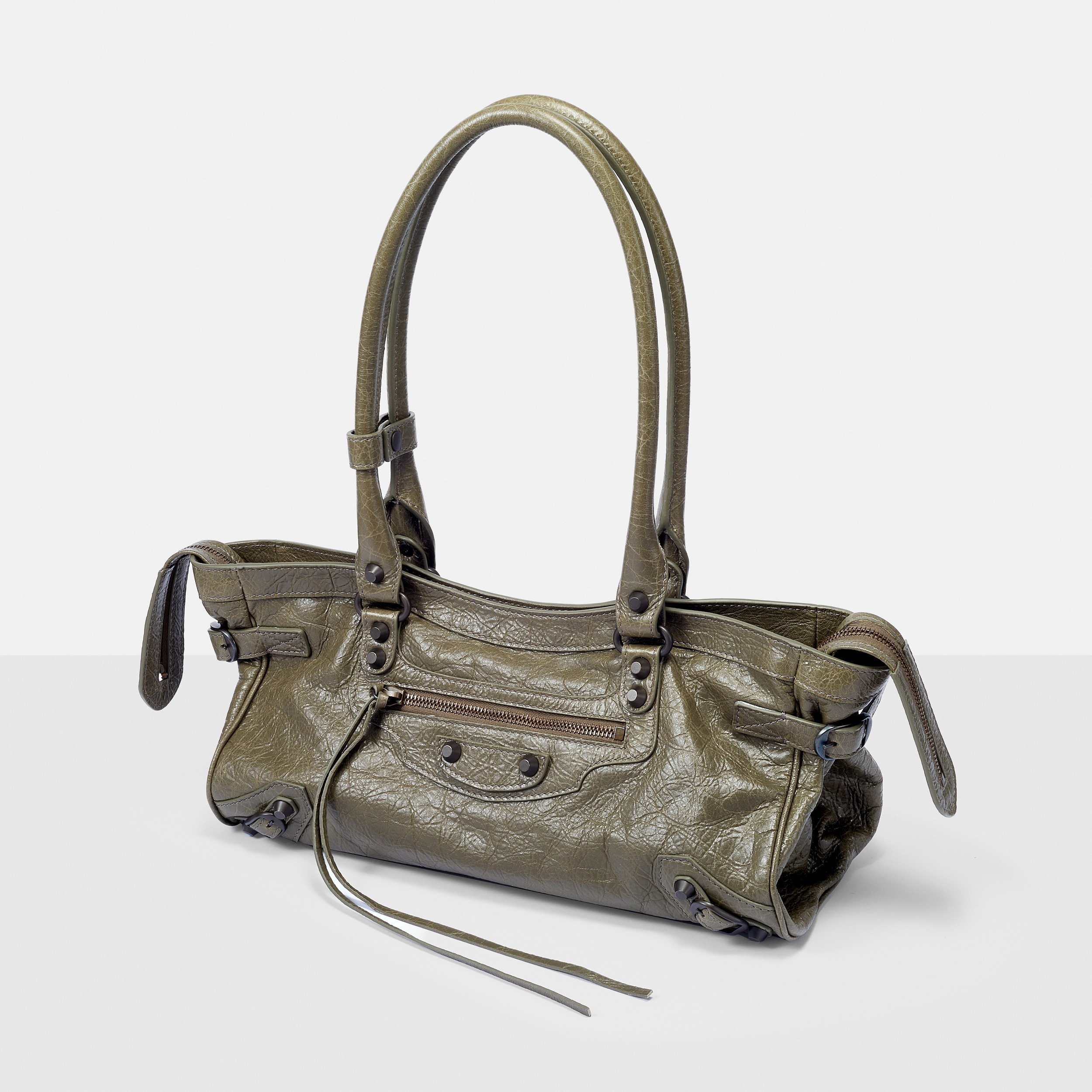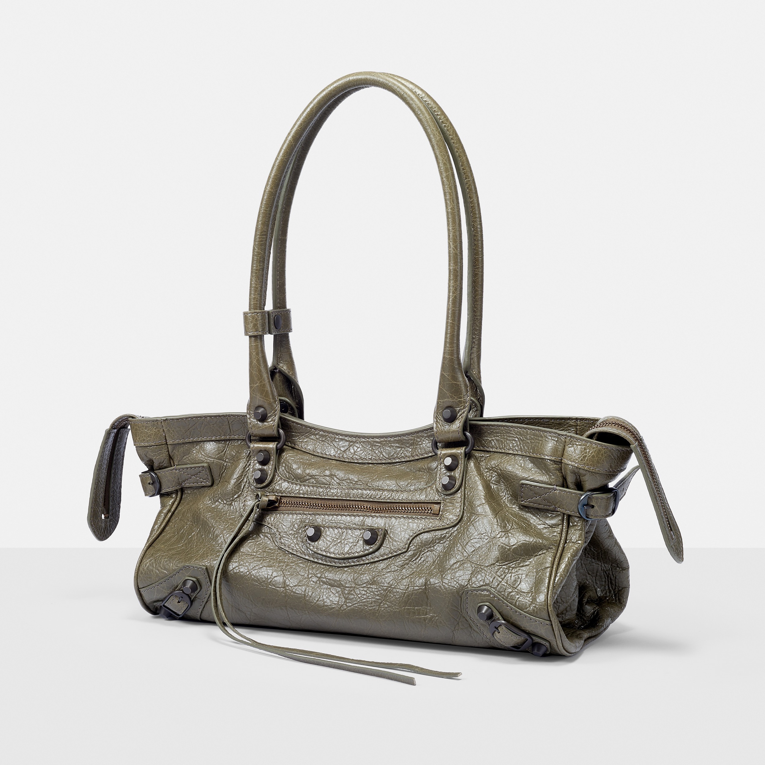 Le City East-West 横款手袋在 Balenciaga 冬季25系列中首次亮相,采用39.8cm长x17.7cm高x14.9cm宽的修长法棍包型搭配加长的皮革双手柄,重新调整的比例让包包能够随时切换手拎或肩背方式,契合繁忙的都市生活节奏。
