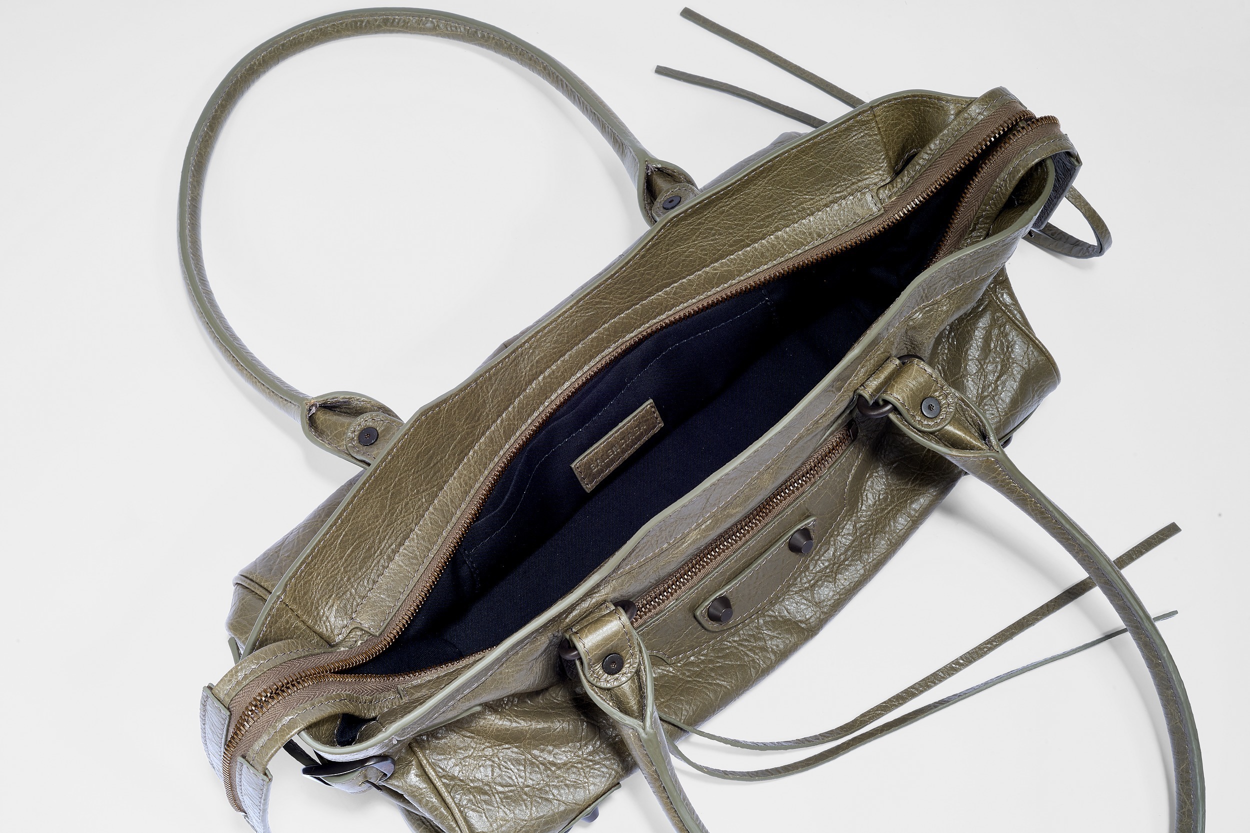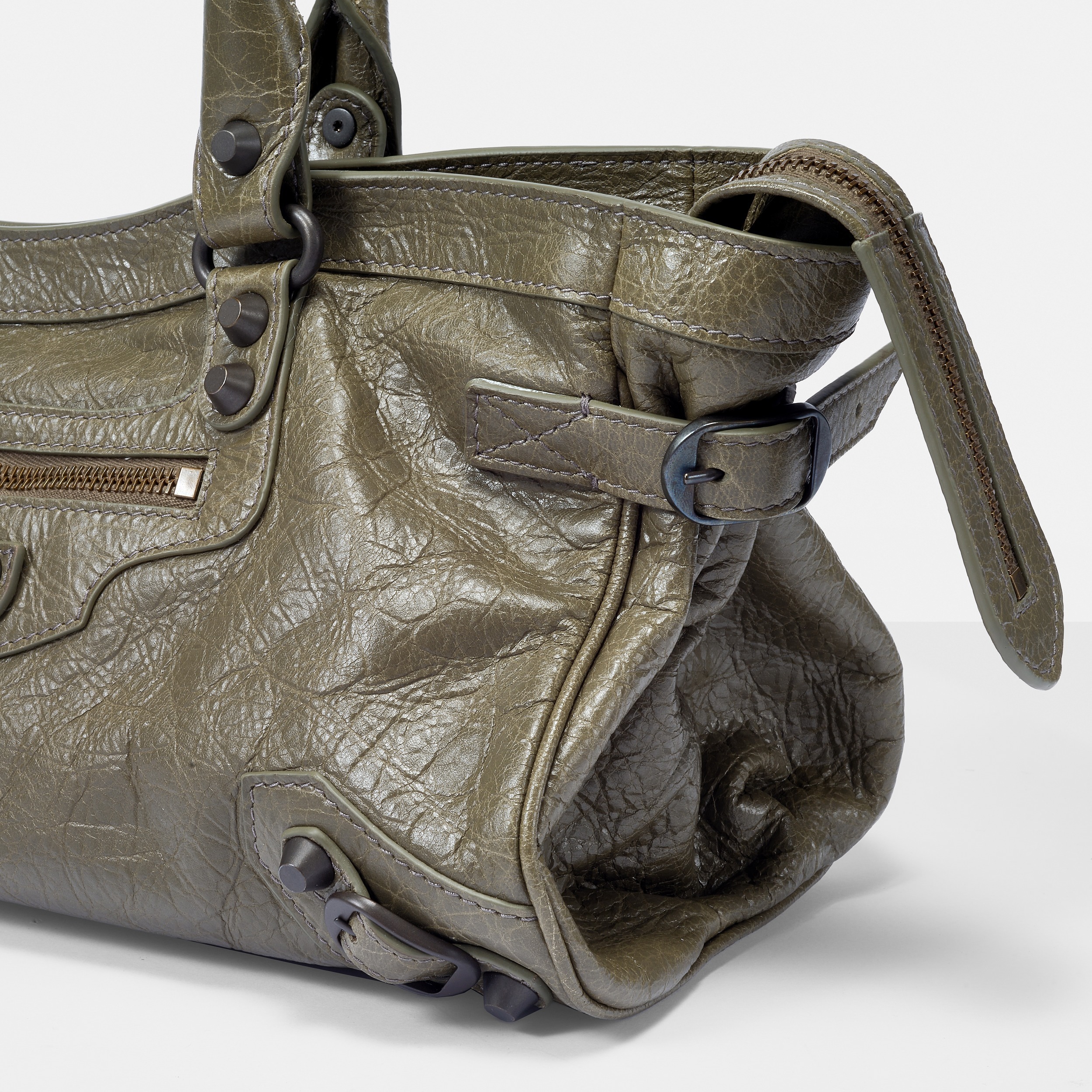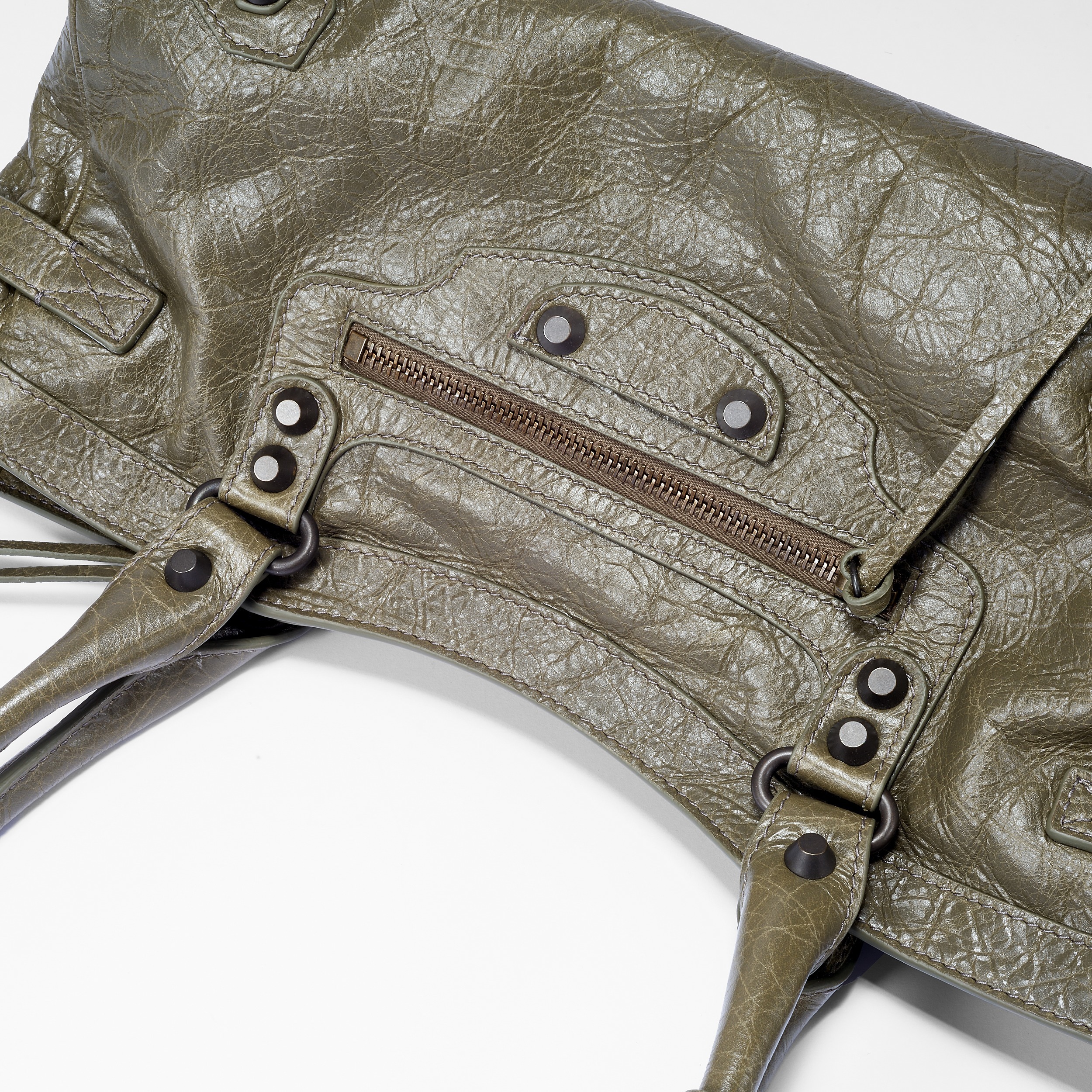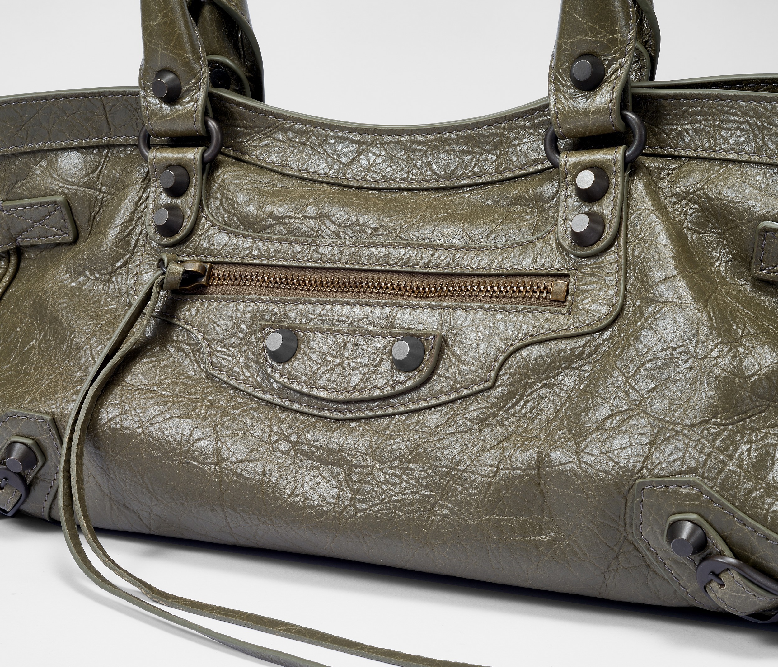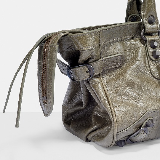包包采用无 Logo 设计,标志性元素是金属铆钉、皮绳拉链头和特殊洗旧处理的皮质,整体外观粗犷而中性,颠覆了当时以优雅为标准的主流审美风格。