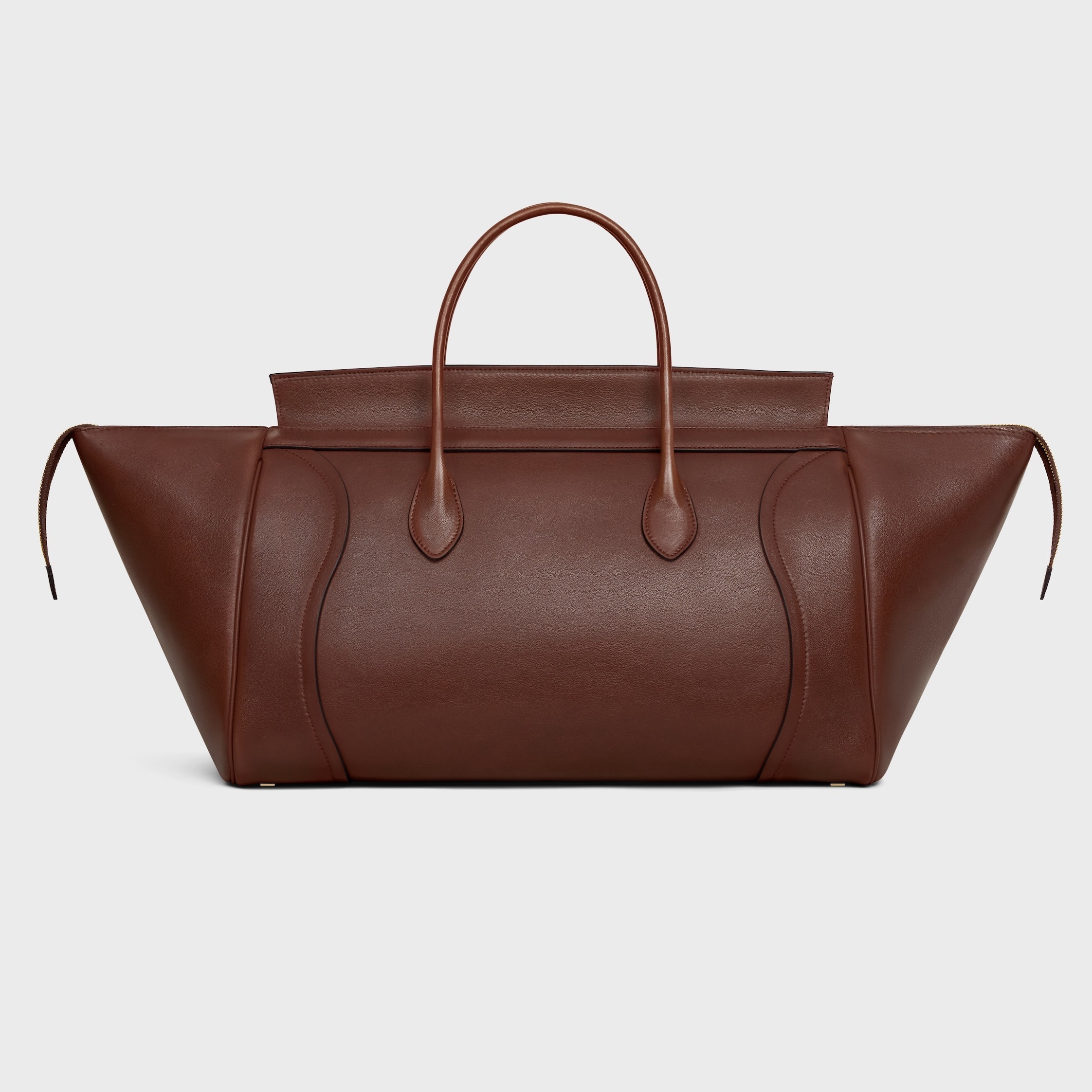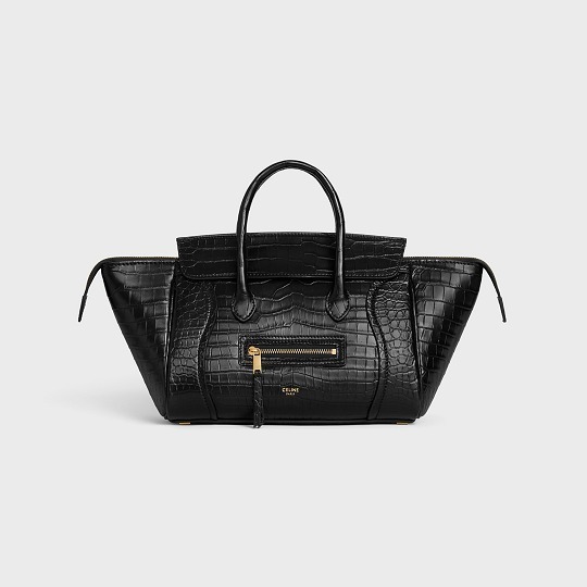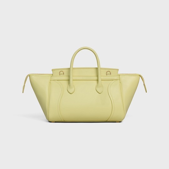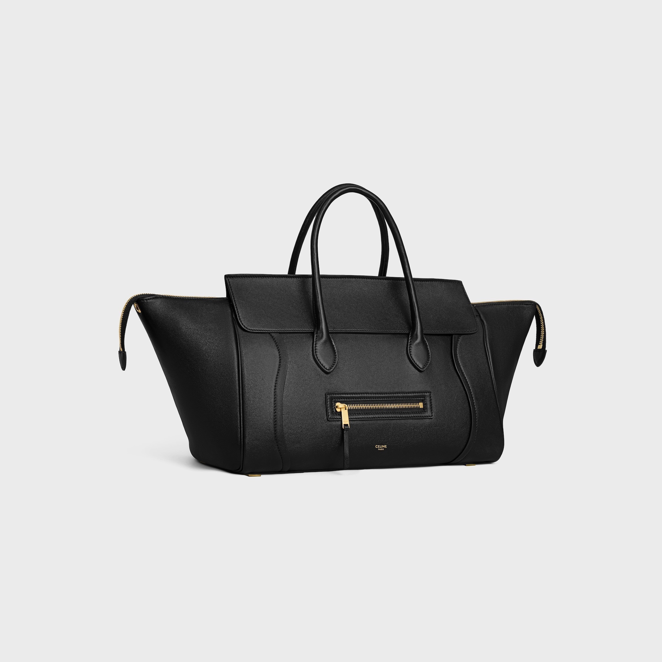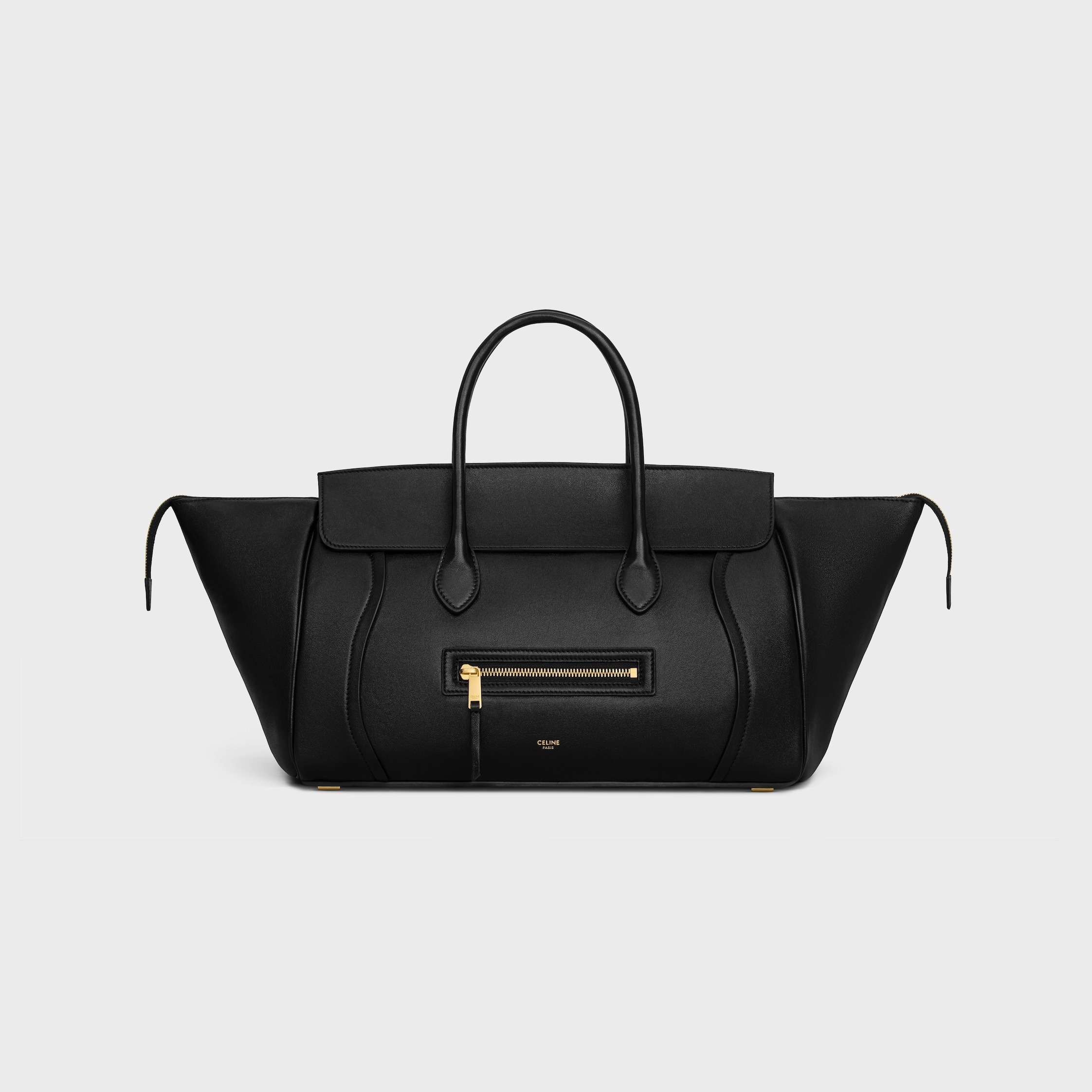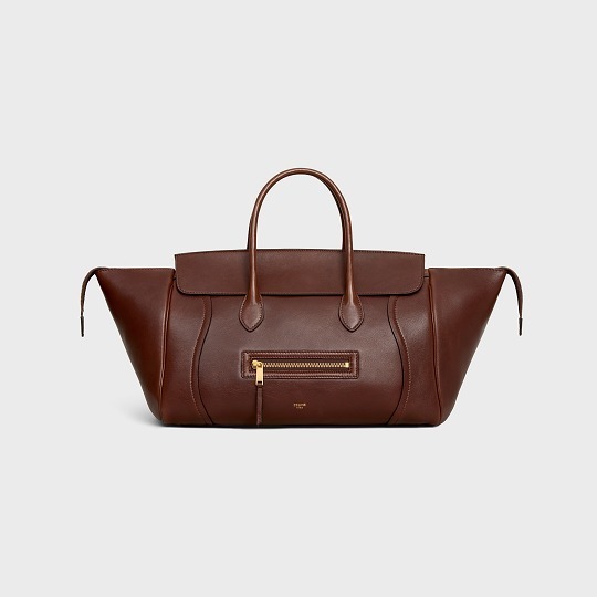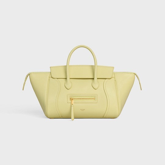 小号 New Luggage 手袋是本季推出的全新尺寸,采用 38.5x11.5x16.5cm 的小巧规格,包身延续倒梯形轮廓、波浪缝线、拉链口袋和管状双手柄等标志性设计,顶部短「刘海」和两侧拉链头增添俏皮点缀,可拆卸肩带实现单肩或斜挎背法。新版笑脸包采用柔软细腻的小羊皮材质搭配牛皮革里衬,包身自重比旧版减轻许多,小号提供黑色、浅棕褐色、氧化蓝和柑橘黄4种配色,经典黑棕色耐看百搭,亮色系为整体装束增添高光,还可以根据需求定制鳄鱼皮版本。
