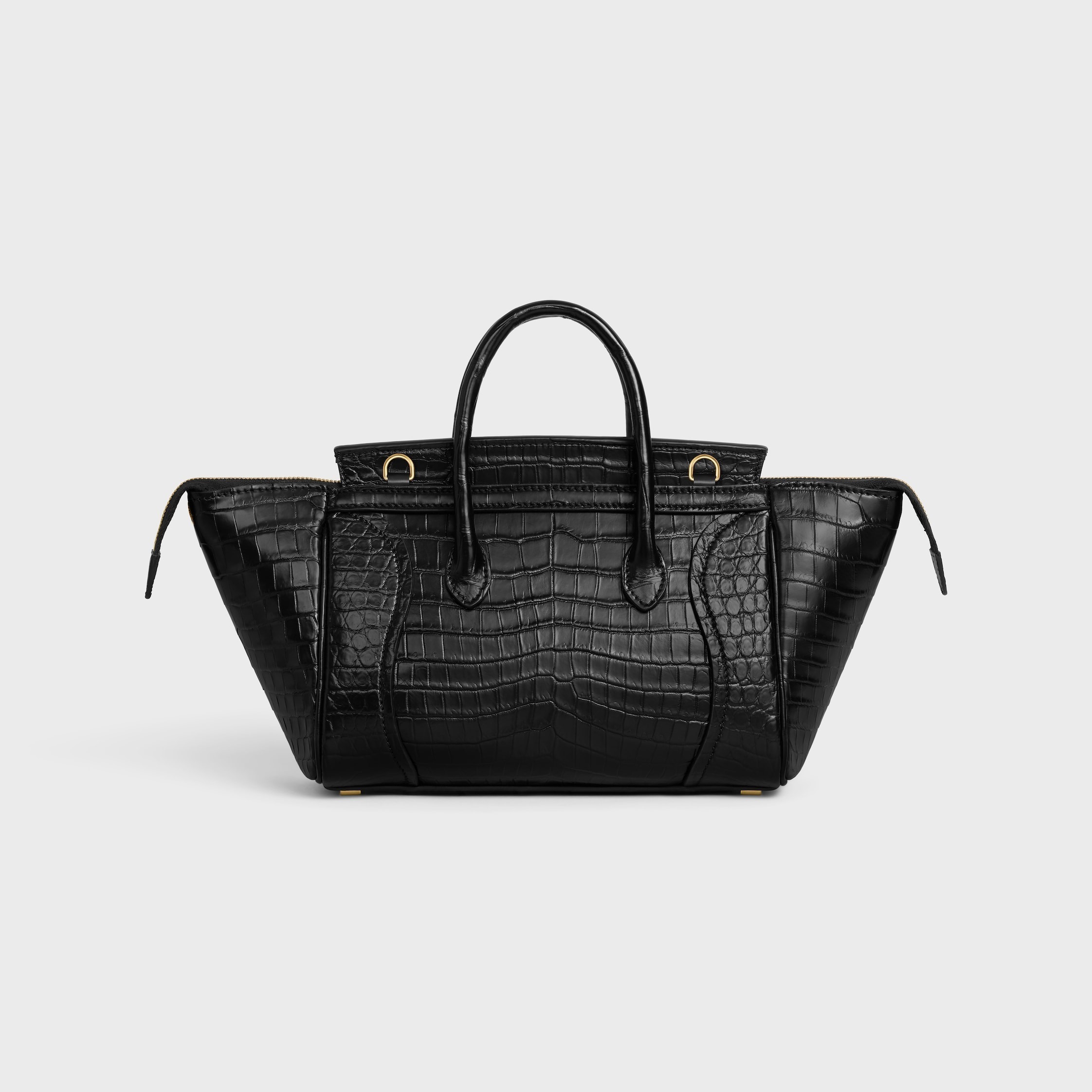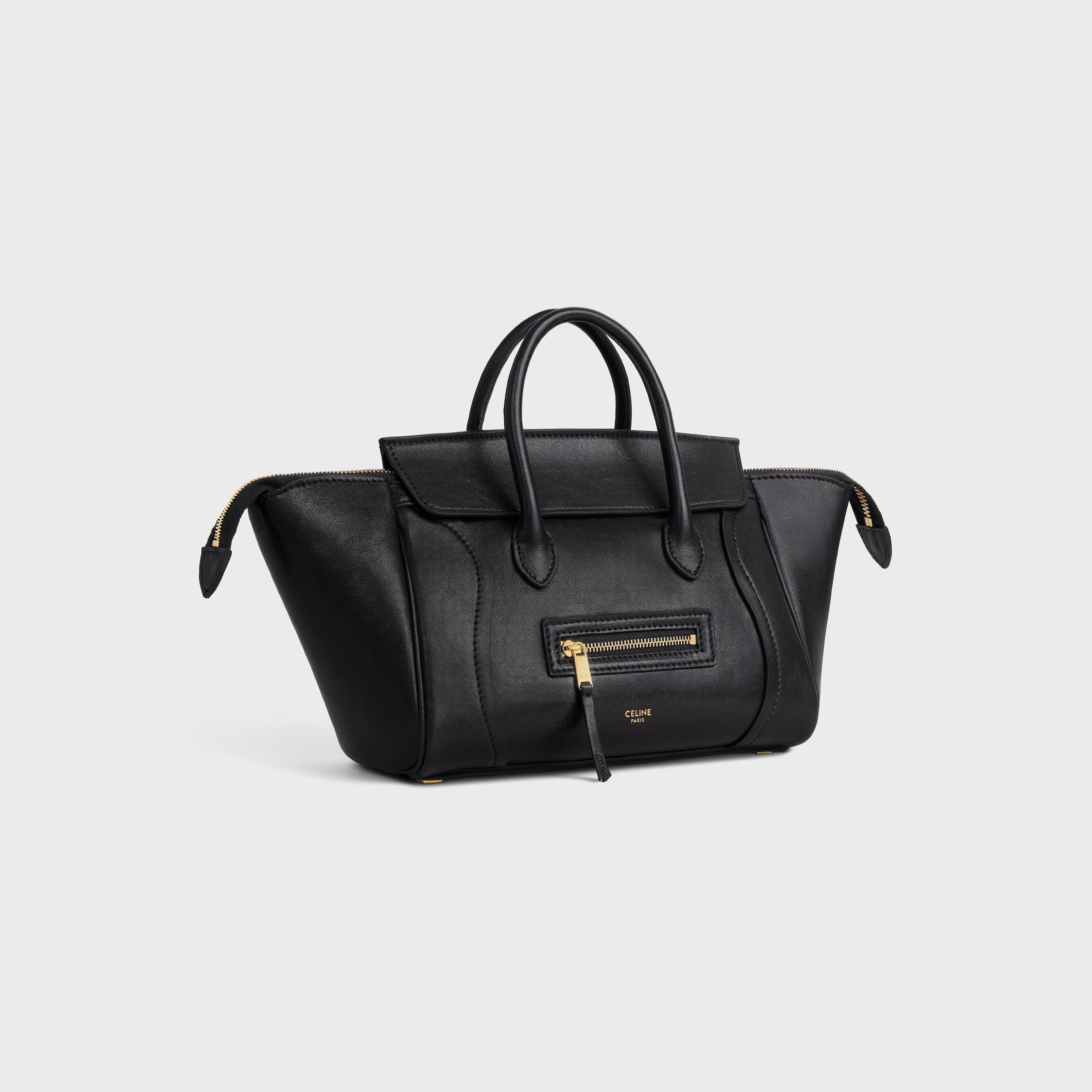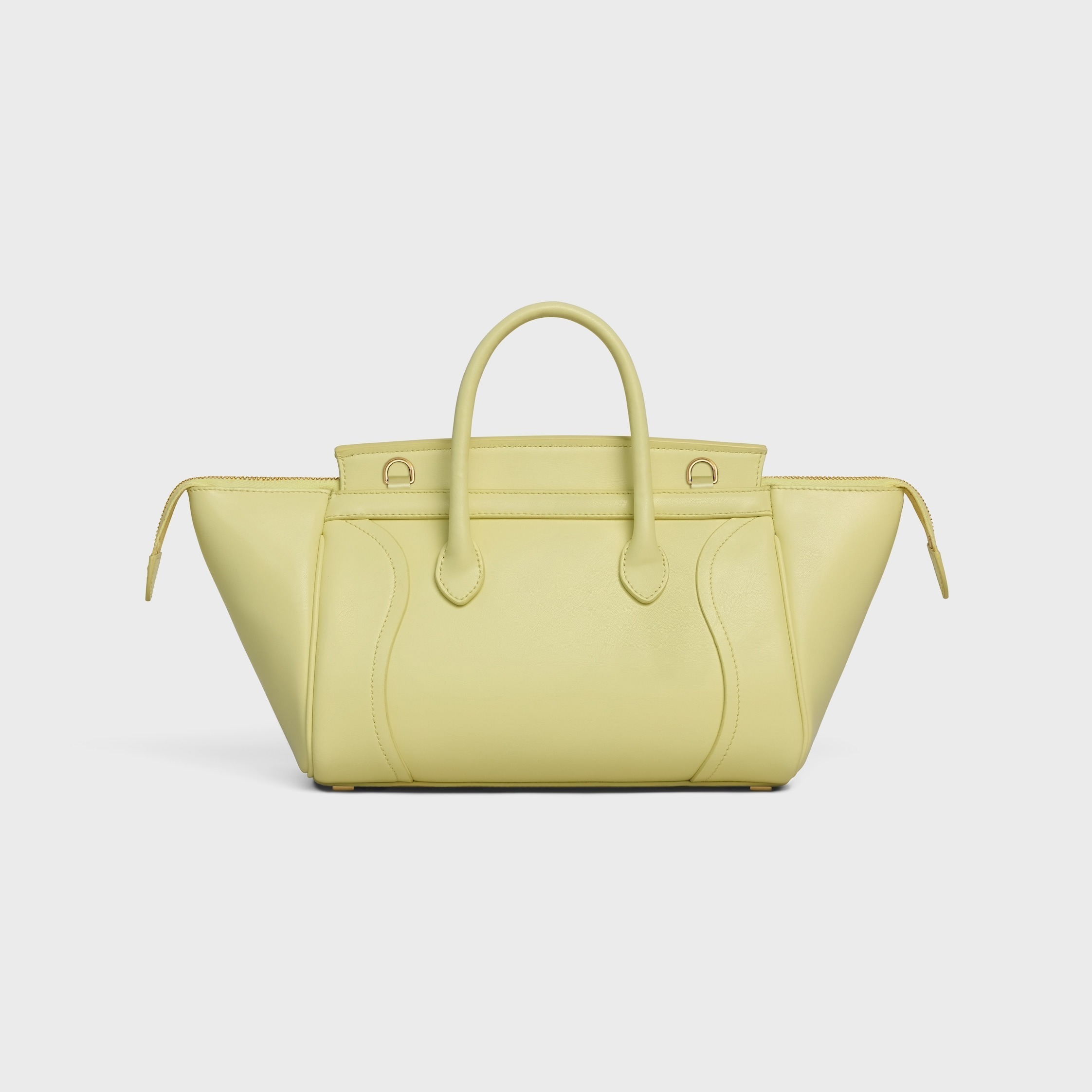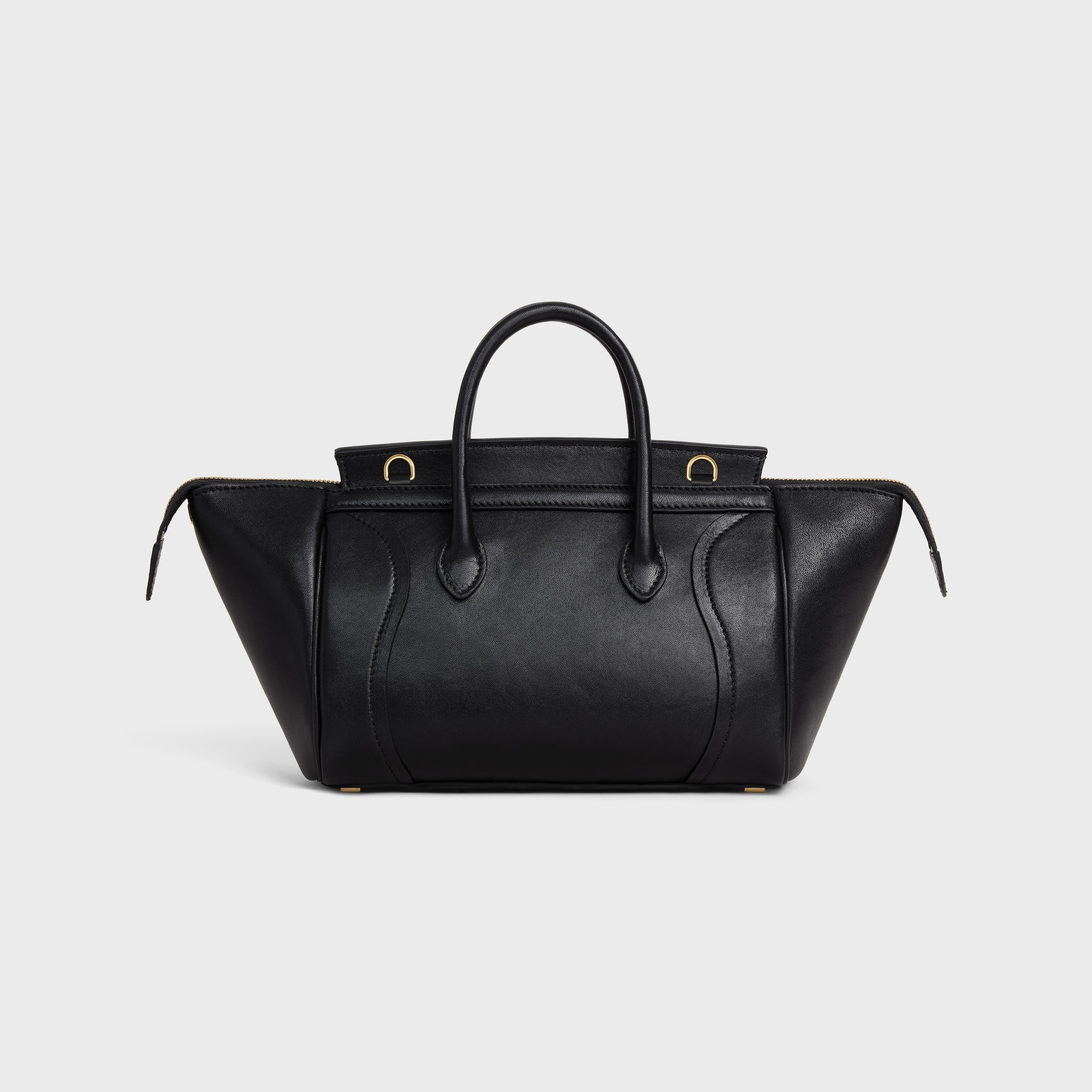 小号 New Luggage 手袋是本季推出的全新尺寸,采用 38.5x11.5x16.5cm 的小巧规格,包身延续倒梯形轮廓、波浪缝线、拉链口袋和管状双手柄等标志性设计,顶部短「刘海」和两侧拉链头增添俏皮点缀,可拆卸肩带实现单肩或斜挎背法。新版笑脸包采用柔软细腻的小羊皮材质搭配牛皮革里衬,包身自重比旧版减轻许多,小号提供黑色、浅棕褐色、氧化蓝和柑橘黄4种配色,经典黑棕色耐看百搭,亮色系为整体装束增添高光,还可以根据需求定制鳄鱼皮版本。
