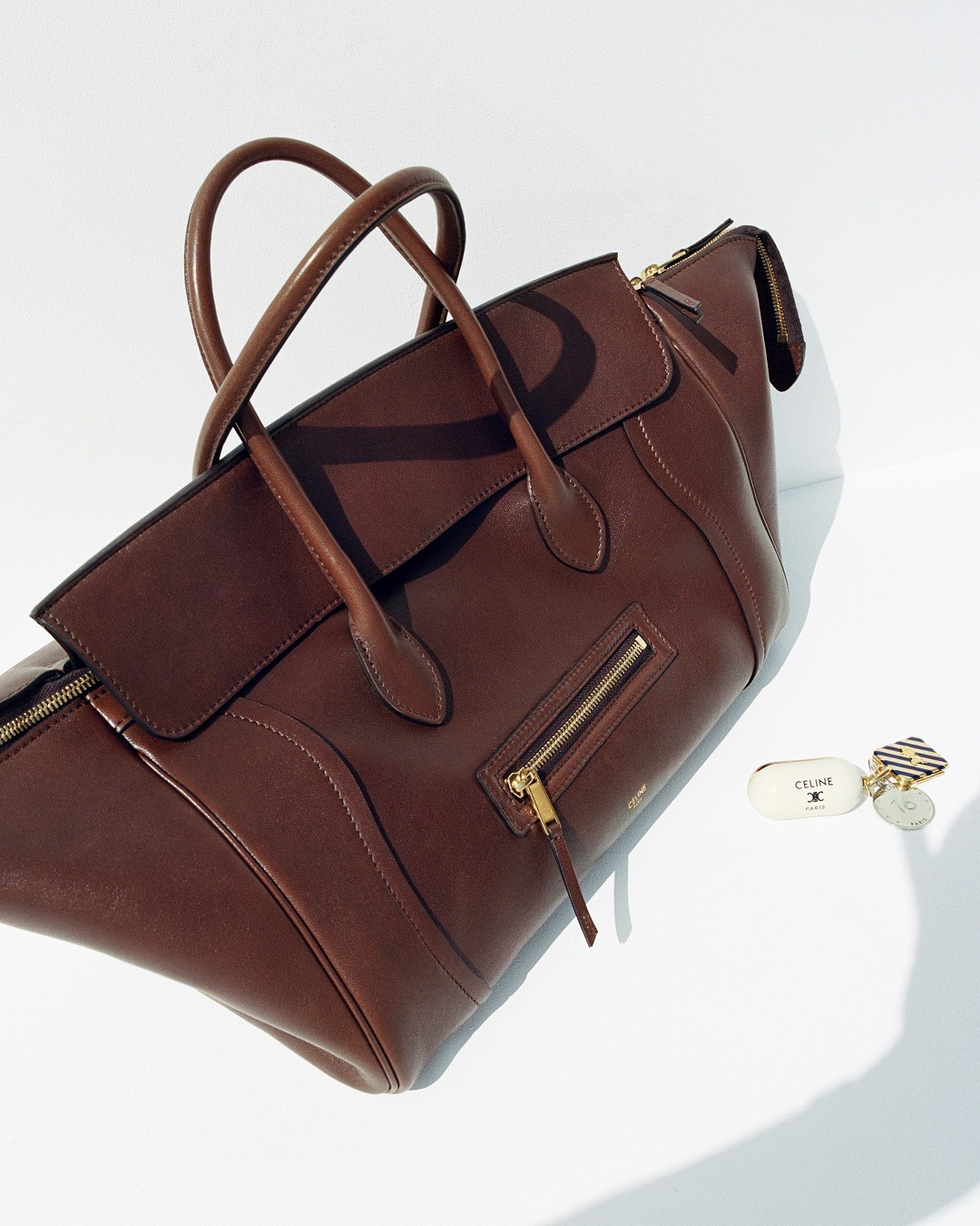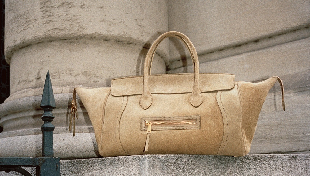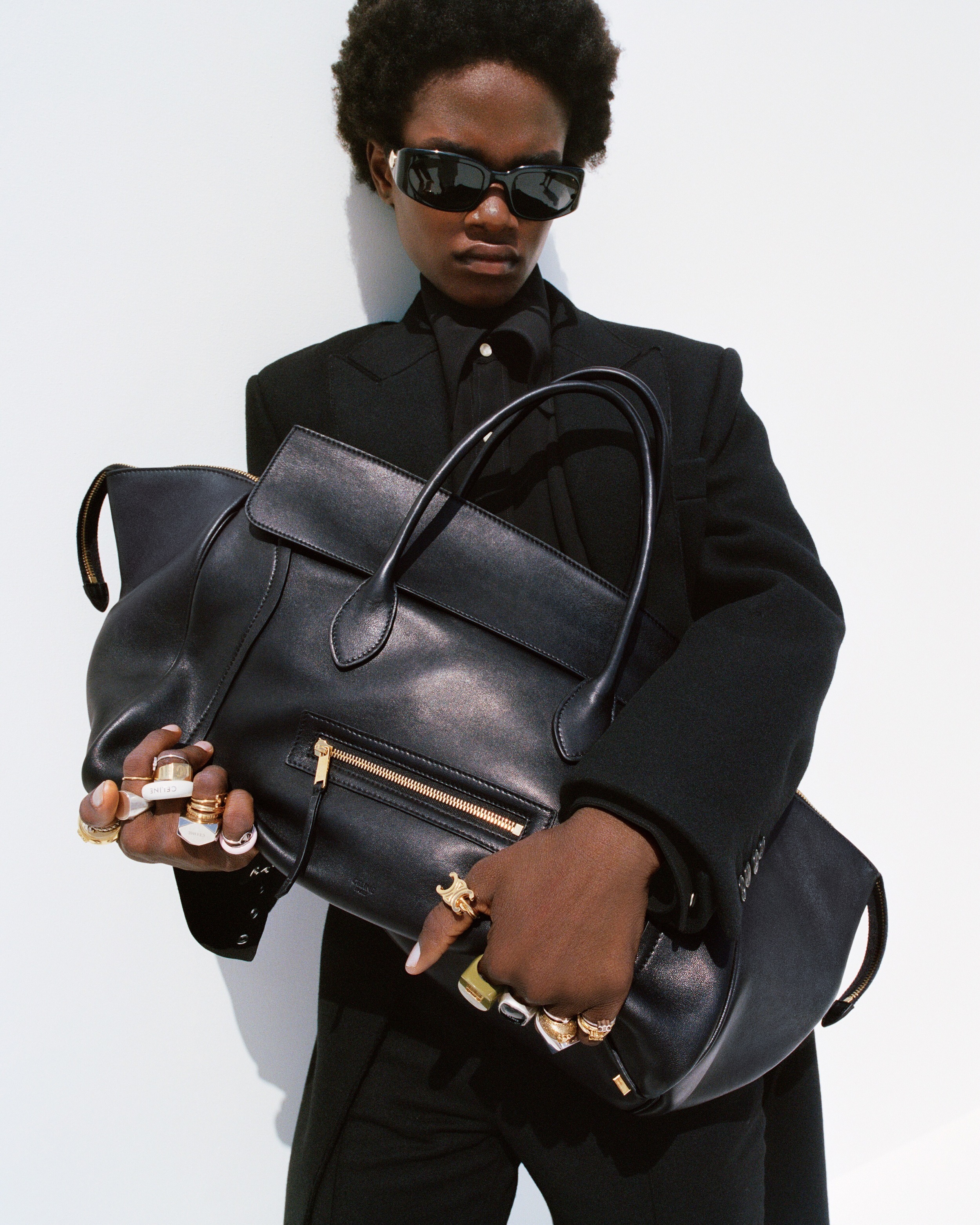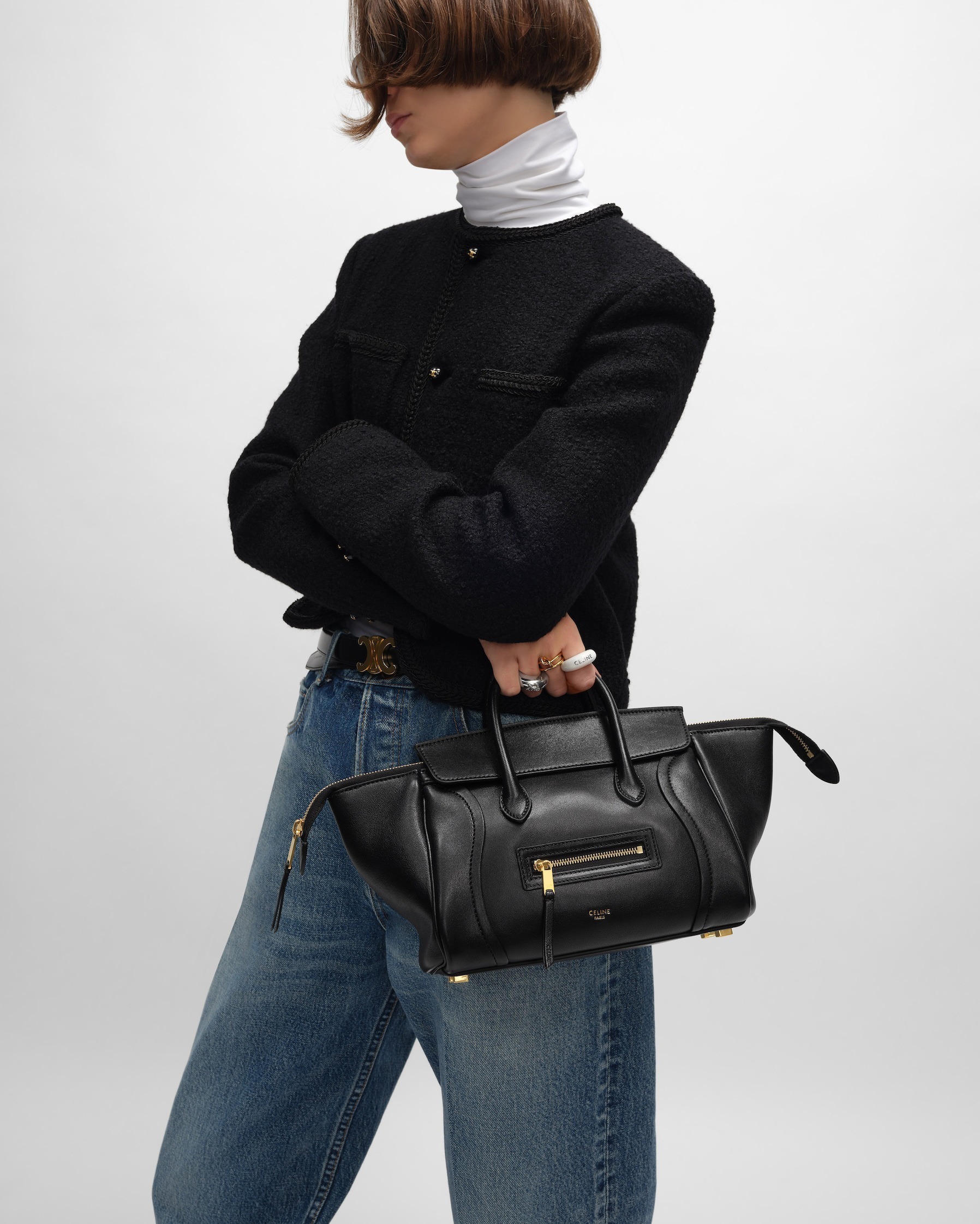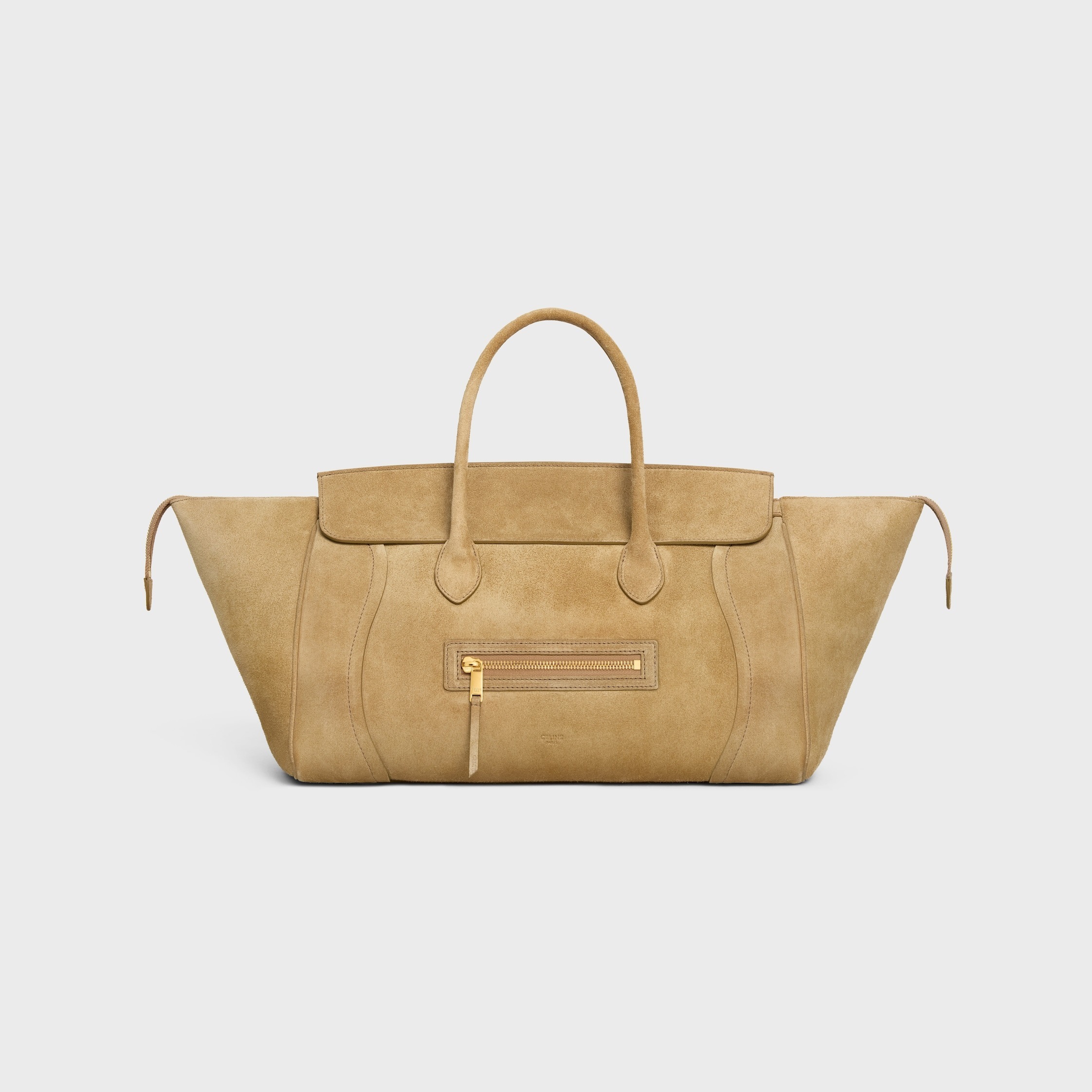 中号和大号 New Luggage 手袋继首发系列的「微笑」版本之后推出常规的平口拉链版本,横版设计为标志性廓形注入慵懒基调。本季除了黑色和深棕色羊皮革版本之外还推出一款米色绒面革设计,包包从内到外通体采用米色牛剖层革制作而成,搭配金色五金配件,温润细腻的绒面材质与秋冬氛围格外契合。