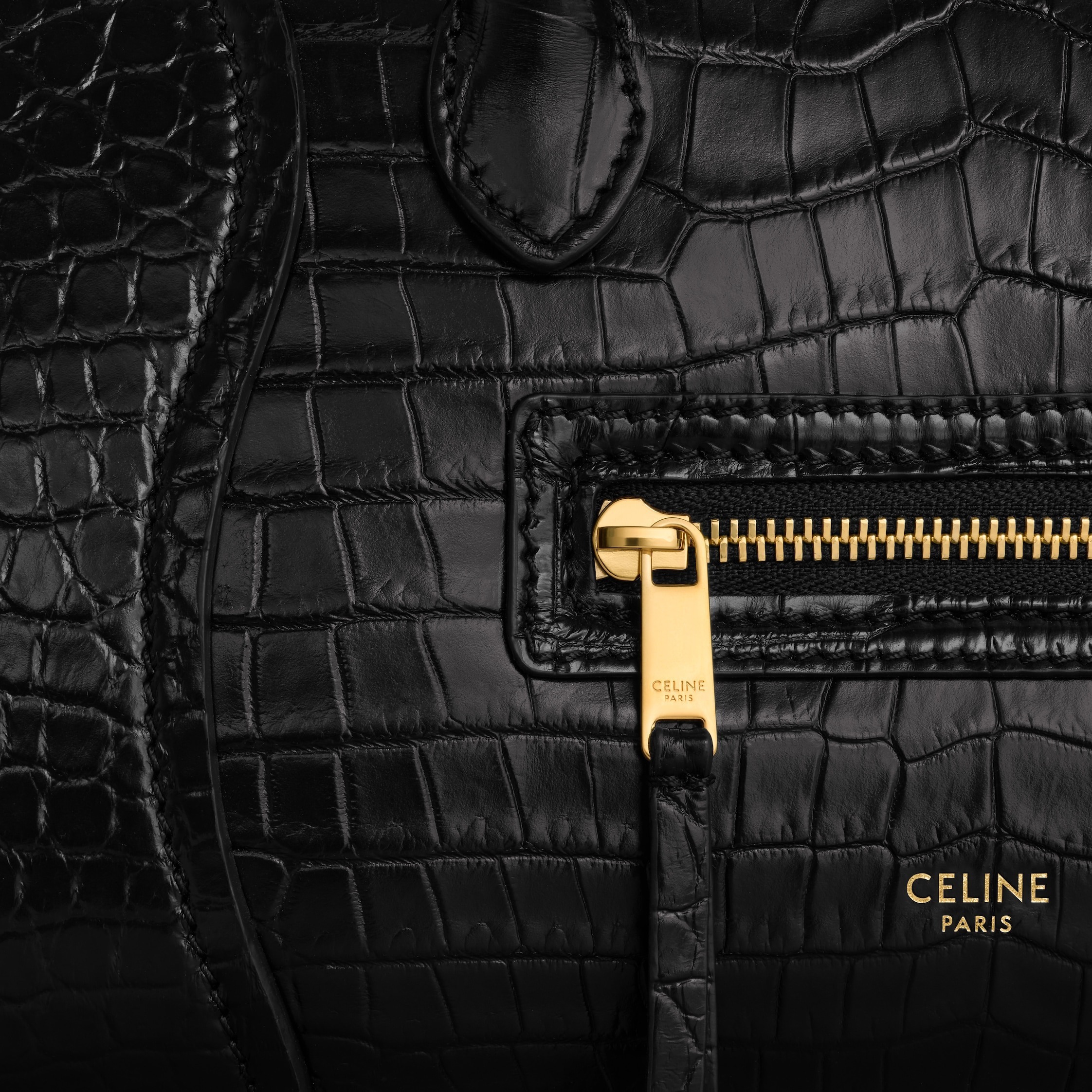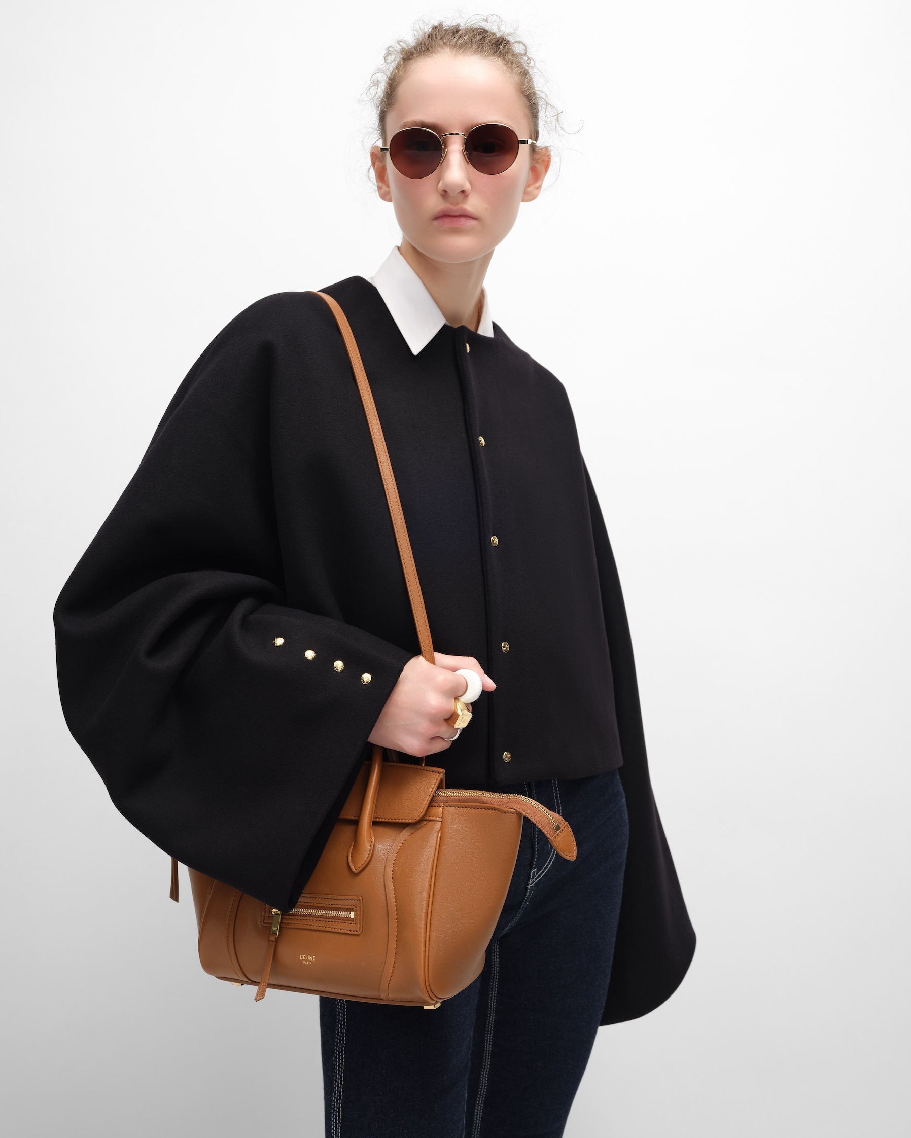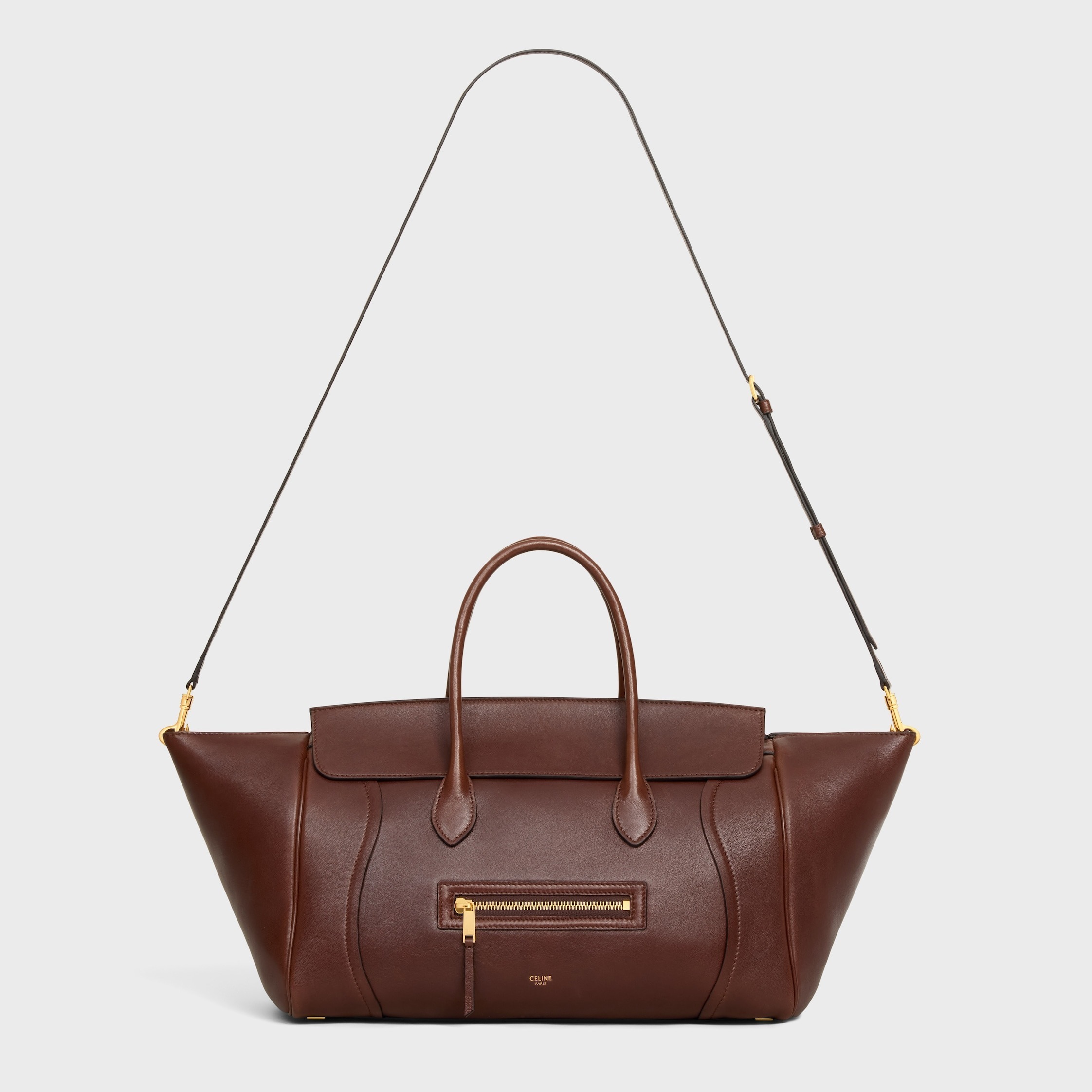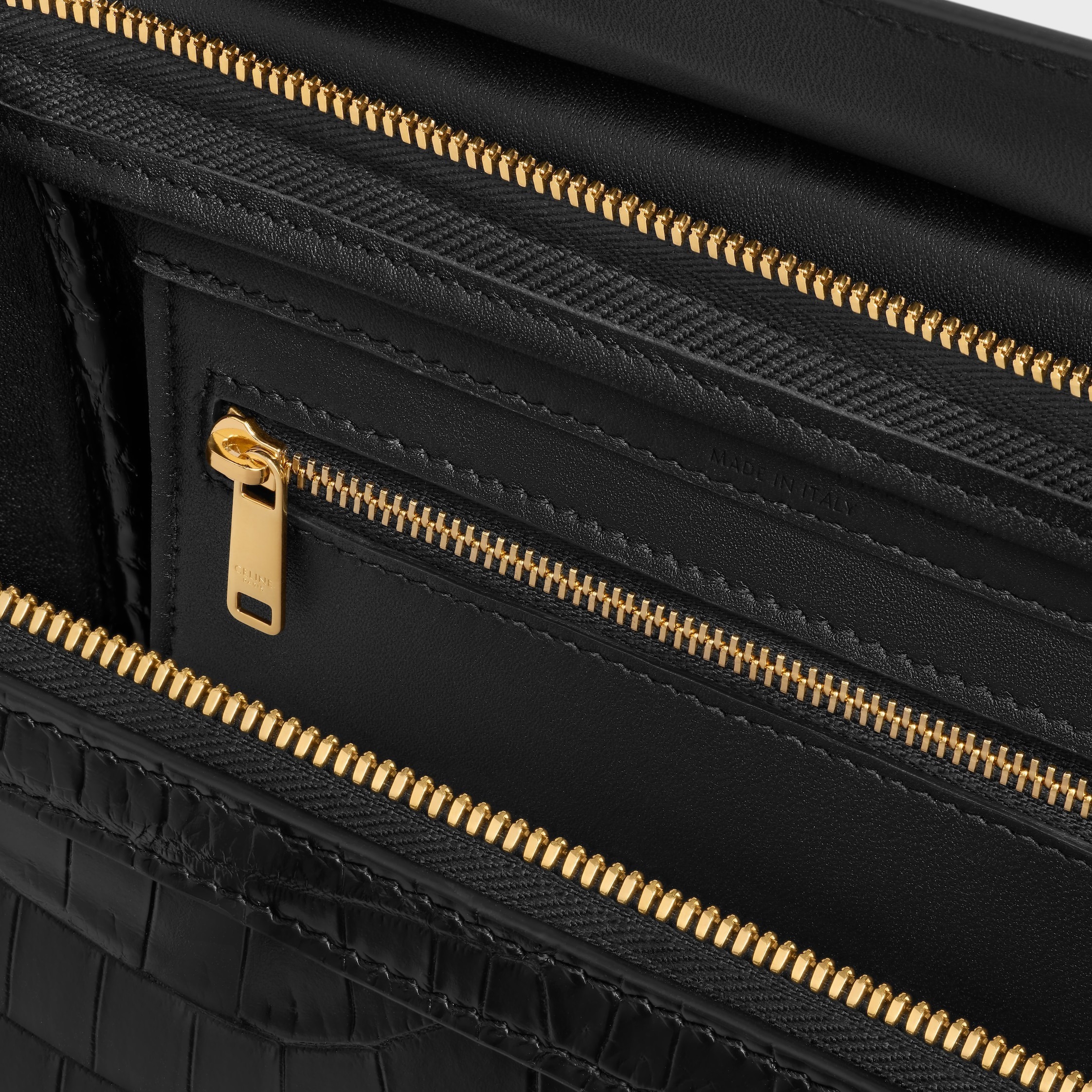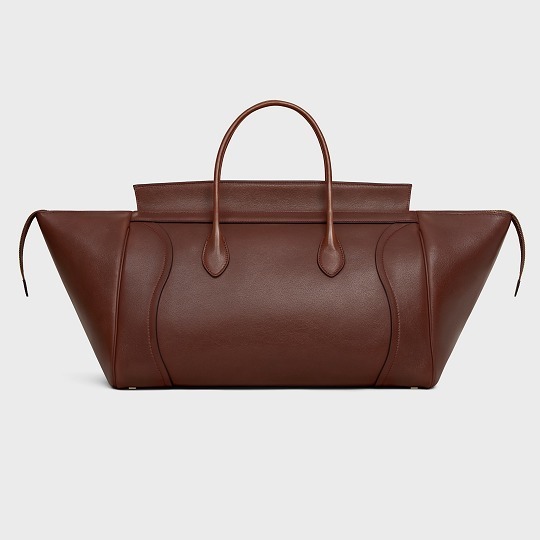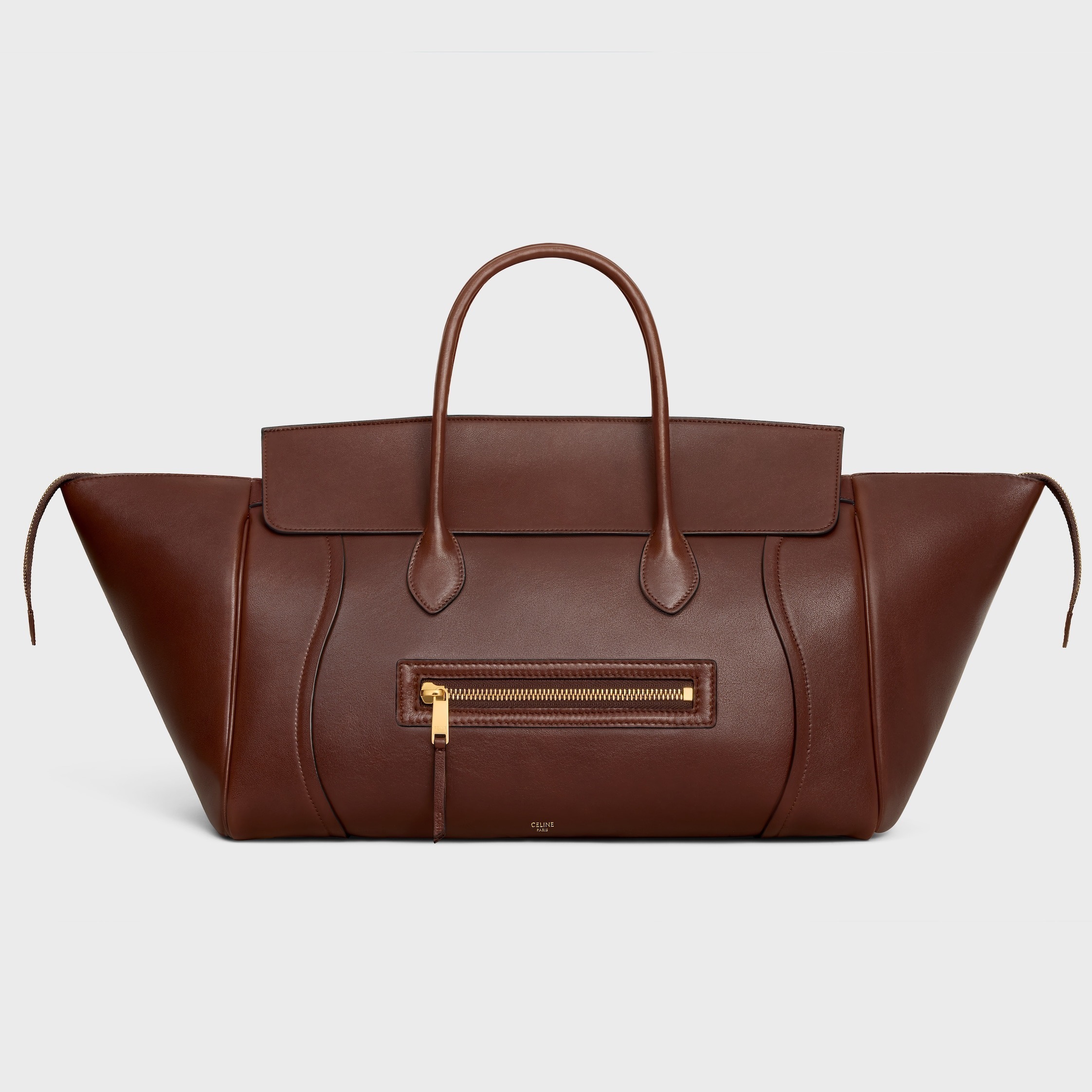 中号和大号 New Luggage 手袋继首发系列的「微笑」版本之后推出常规的平口拉链版本,横版设计为标志性廓形注入慵懒基调。本季除了黑色和深棕色羊皮革版本之外还推出一款米色绒面革设计,包包从内到外通体采用米色牛剖层革制作而成,搭配金色五金配件,温润细腻的绒面材质与秋冬氛围格外契合。