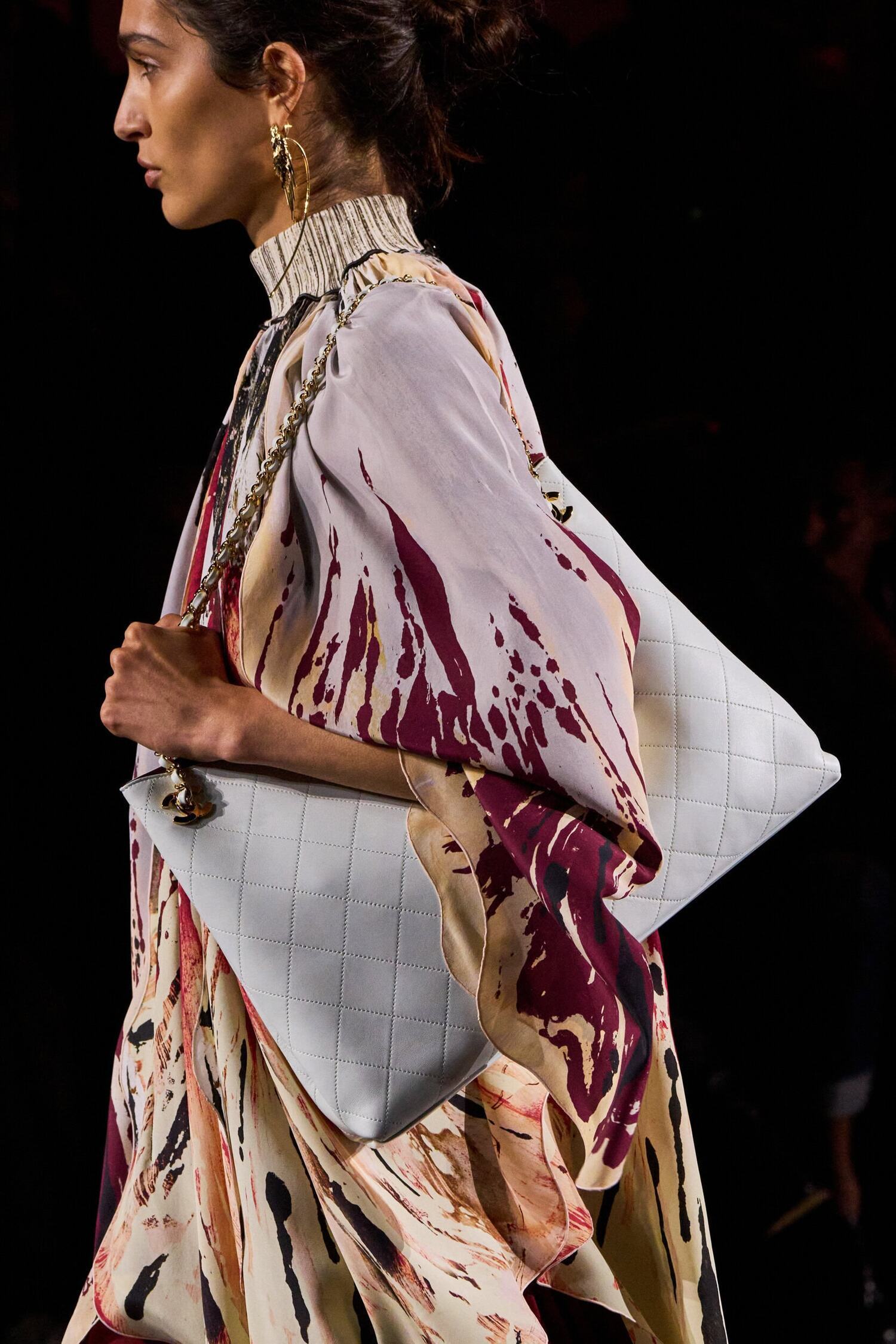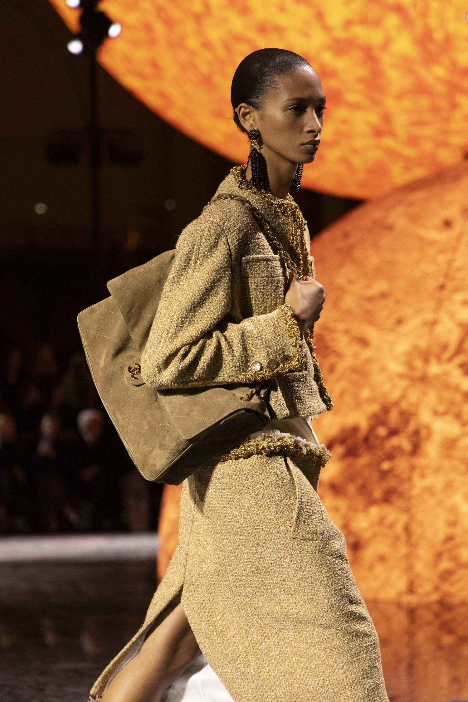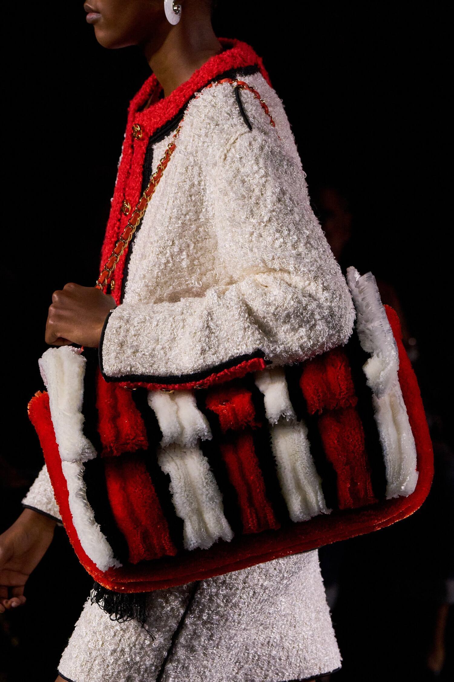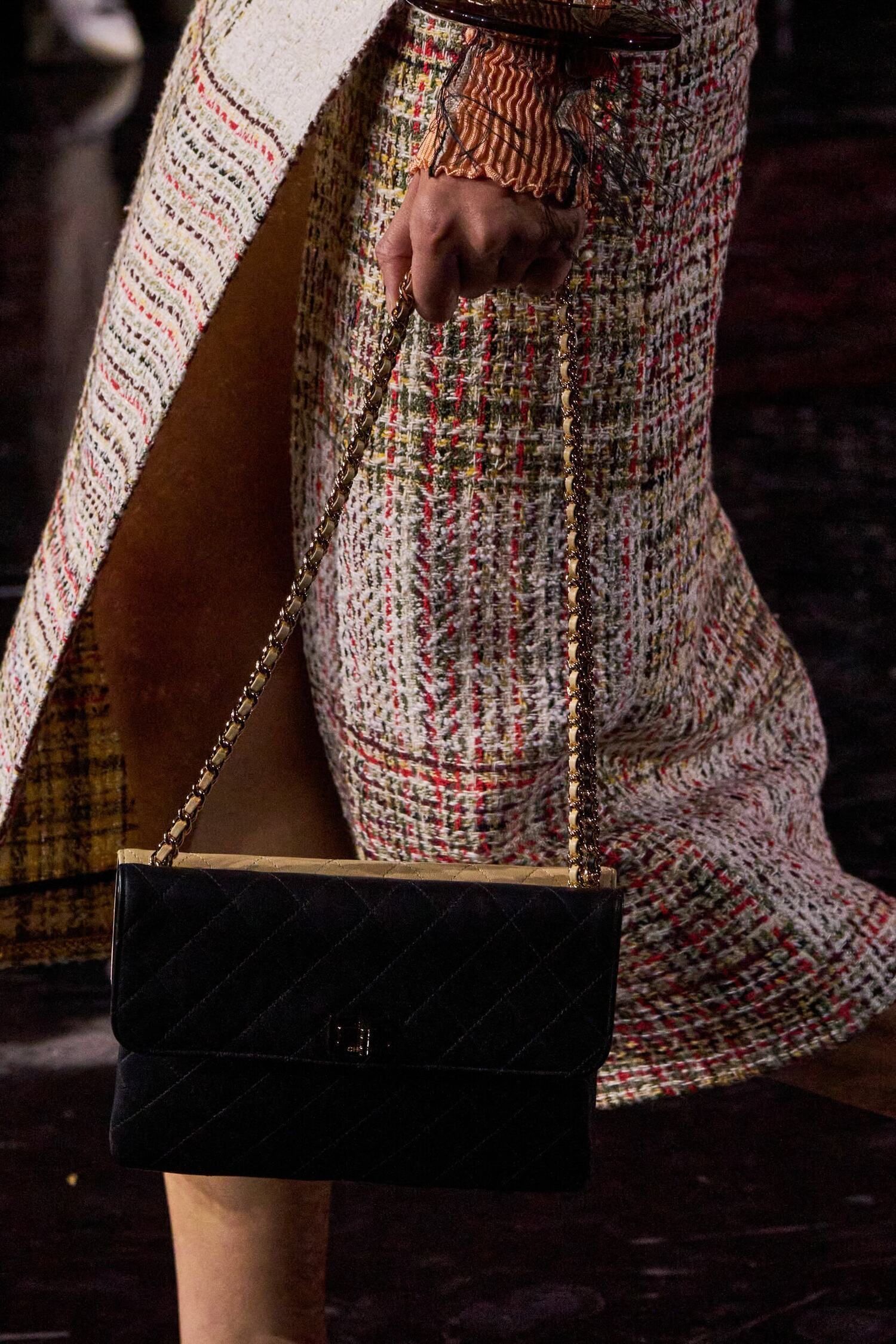你可以看到 Matthieu Blazy 故意将双C金属徽标放置于包包的侧上方,在不对称设计中巧妙形成视觉平衡;包型比例也都被放大,保留经典菱格纹和双C徽标,更显职场女性的率性风格。