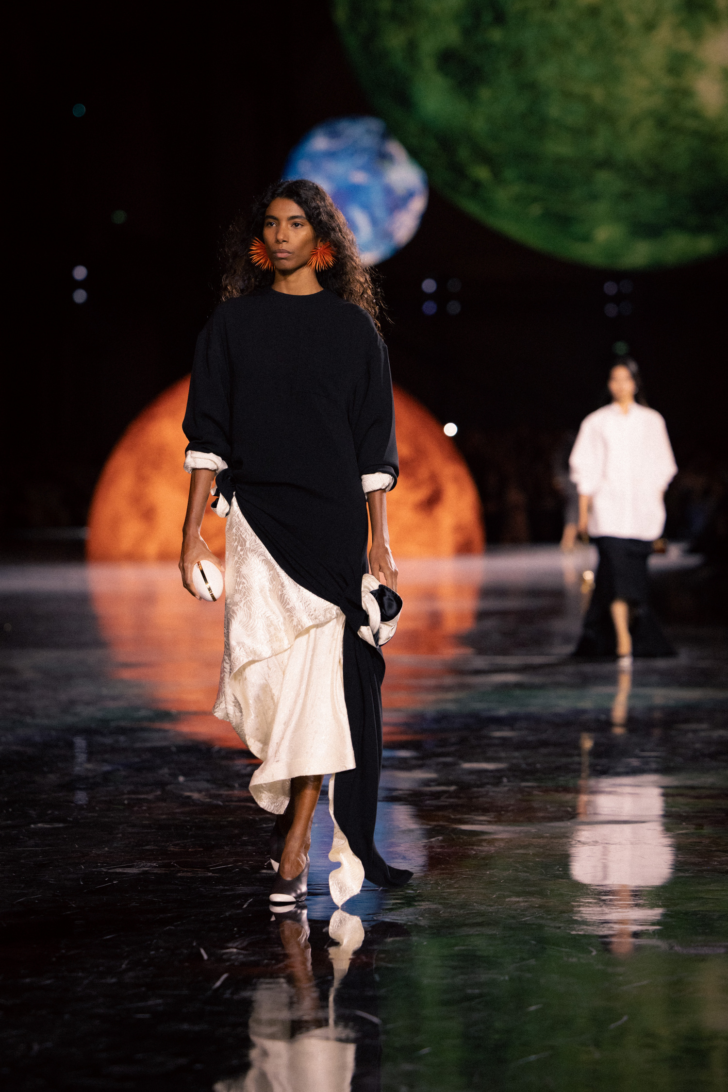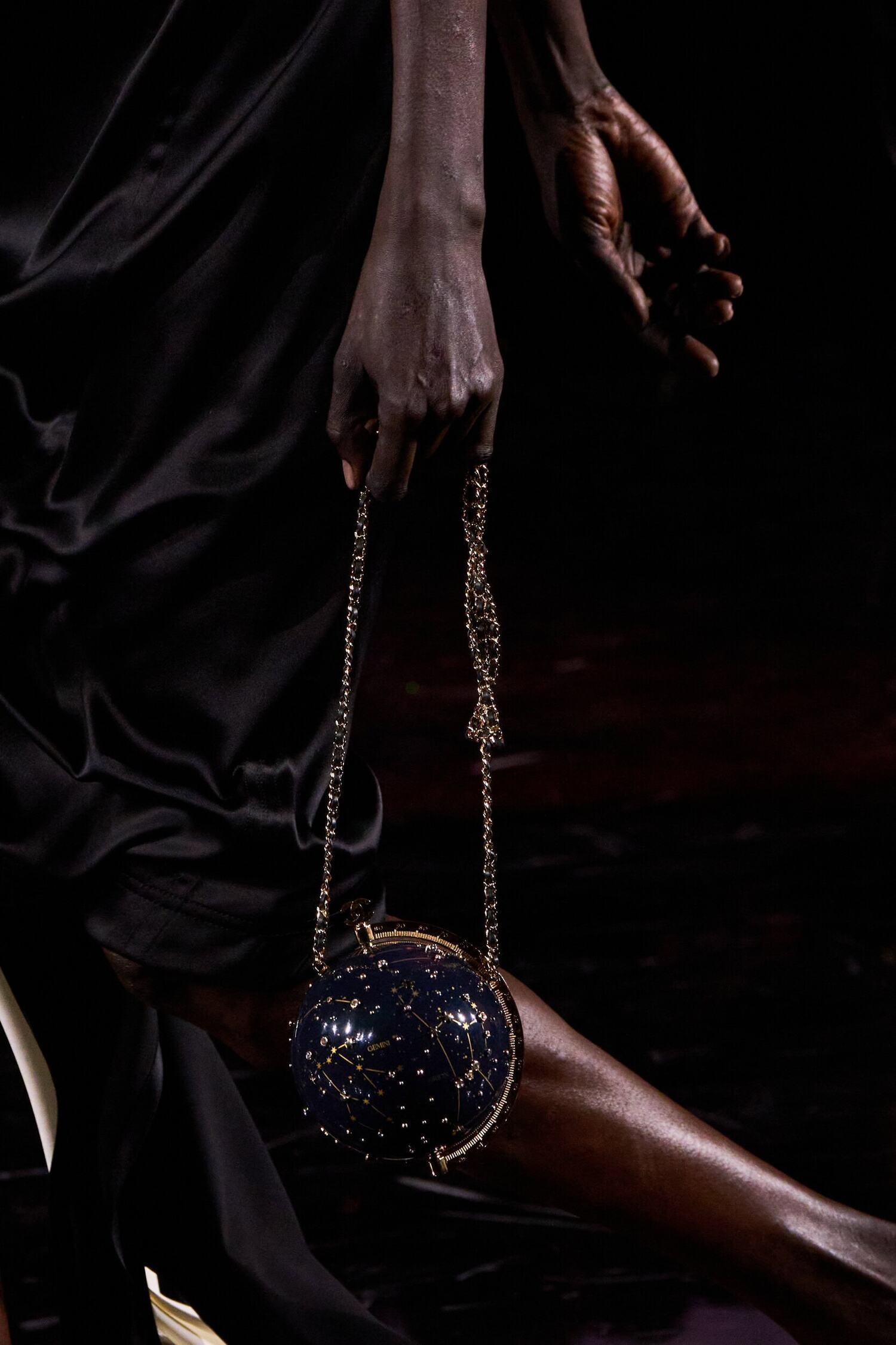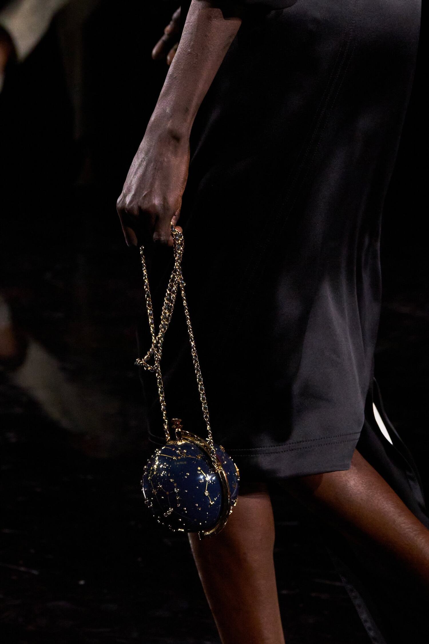 这只晚装包仿佛一只通体雪白色羽毛的白鹭,羽毛伴随佩戴者的动作而灵动飘曳,显得仙气满满;黑色球形晚装包则以金属和水钻勾勒出星座图案。