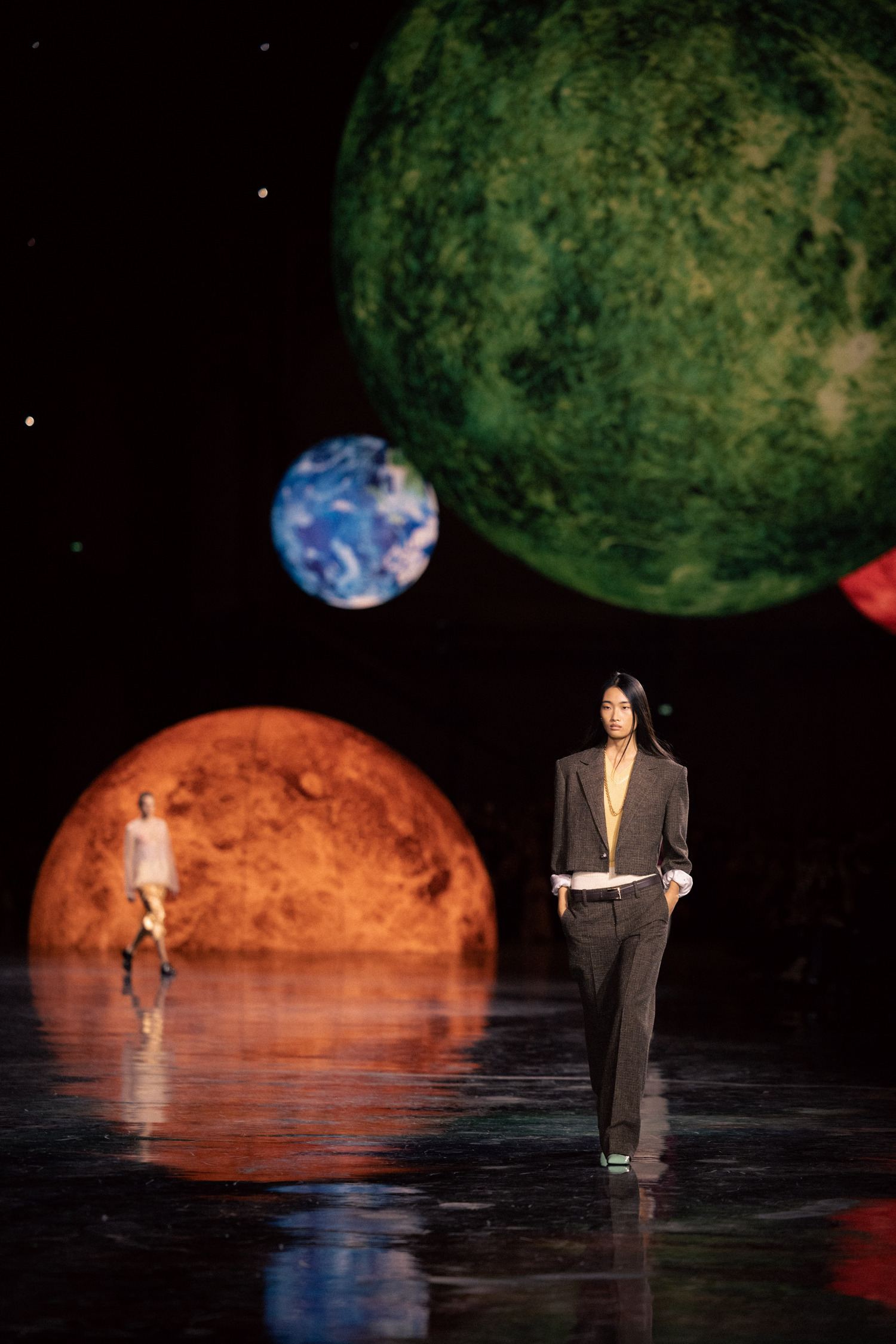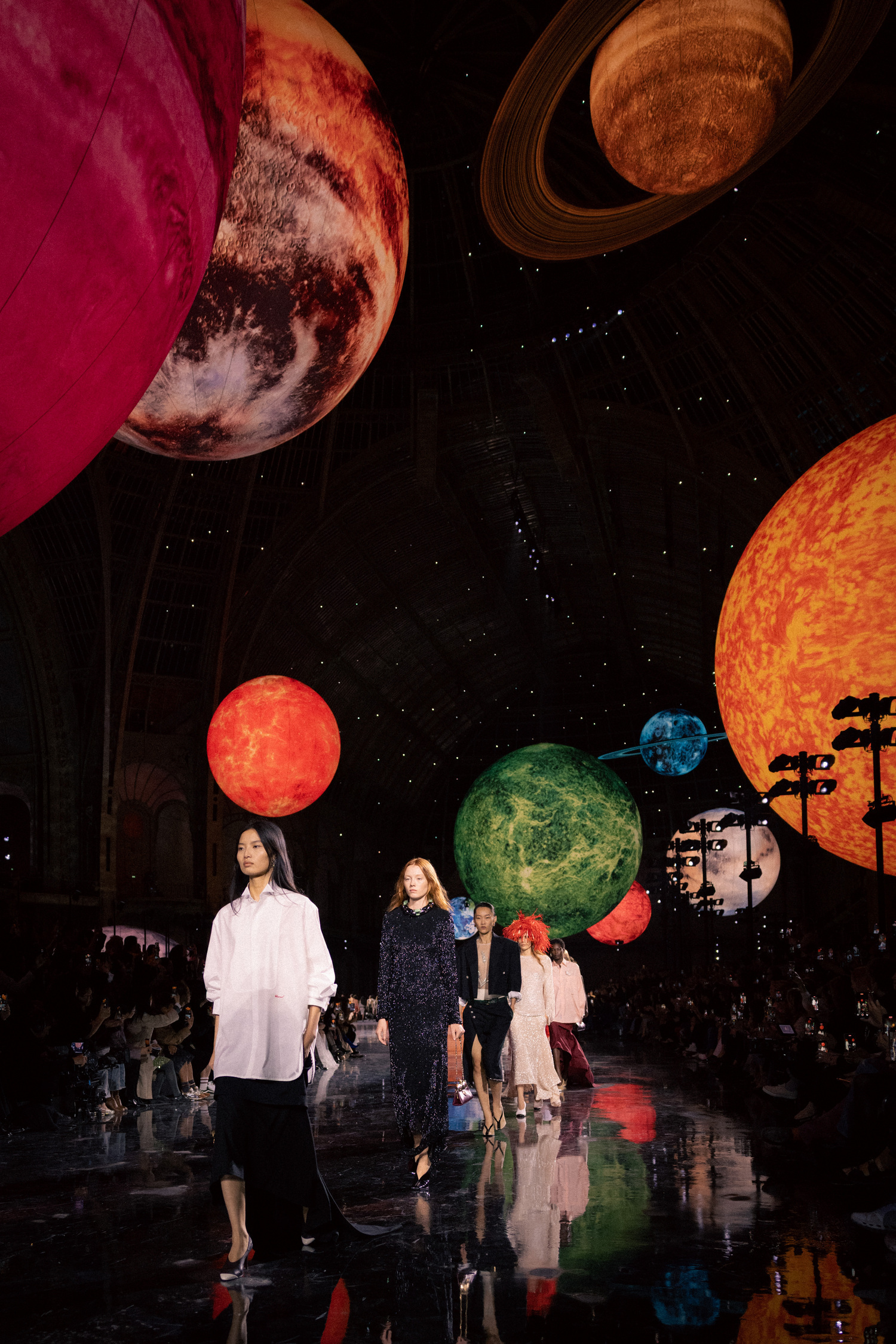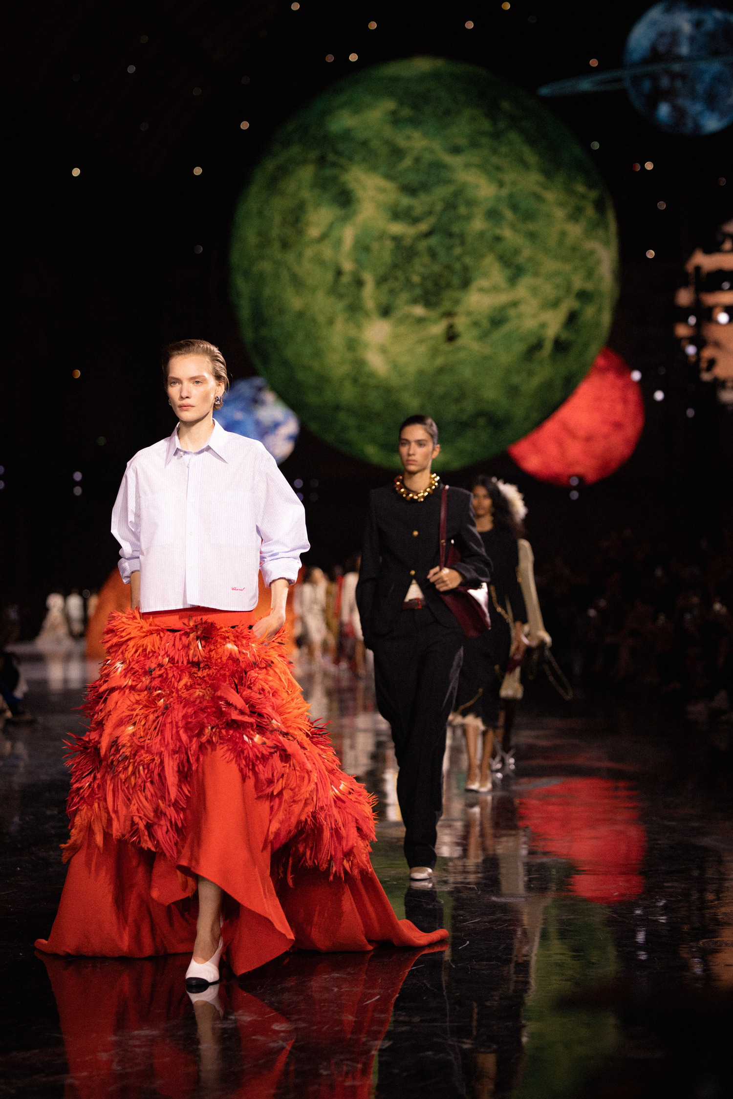 这只晚装包仿佛一只通体雪白色羽毛的白鹭,羽毛伴随佩戴者的动作而灵动飘曳,显得仙气满满;黑色球形晚装包则以金属和水钻勾勒出星座图案。