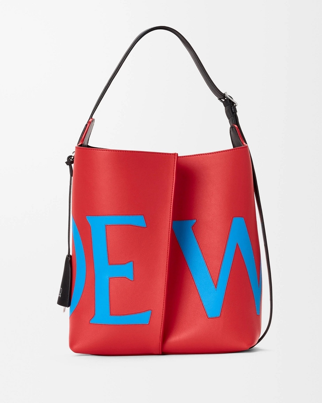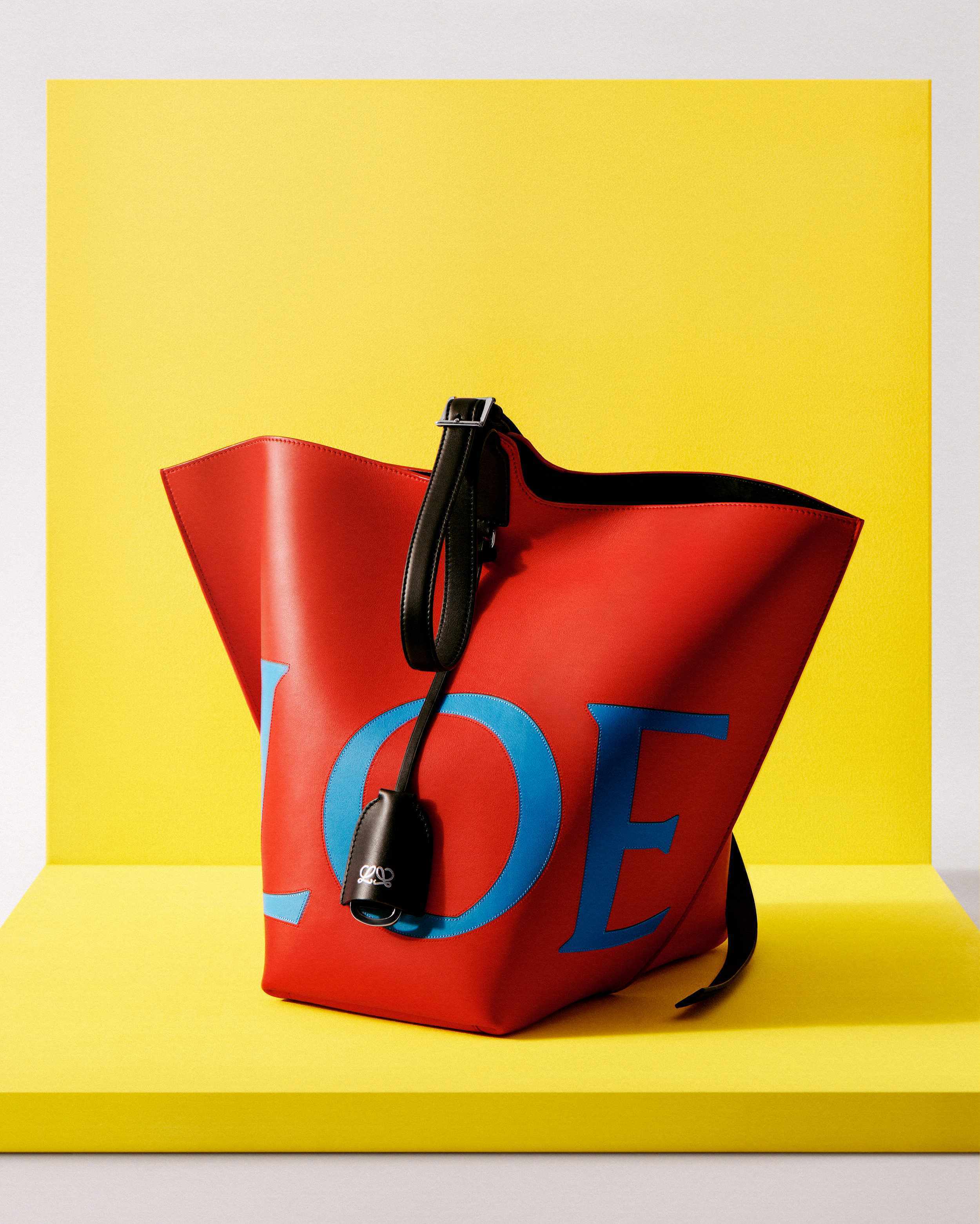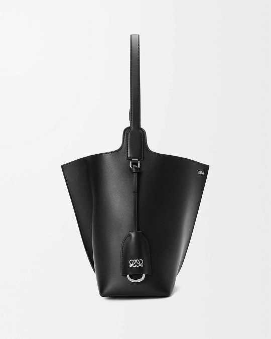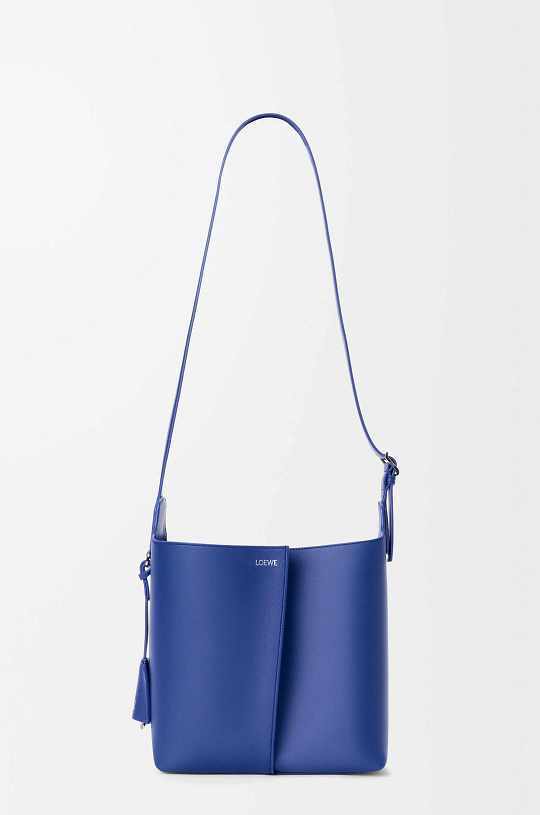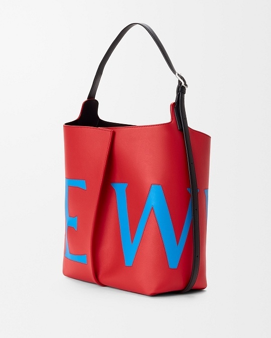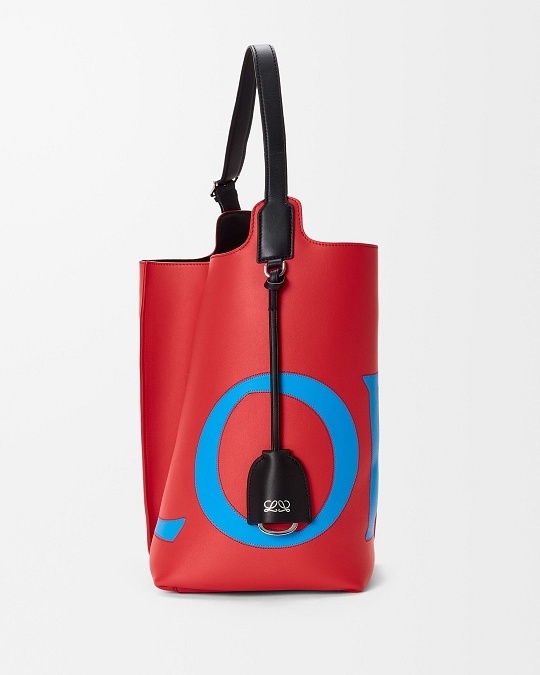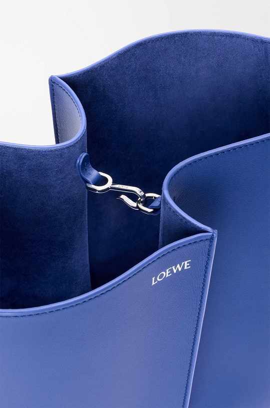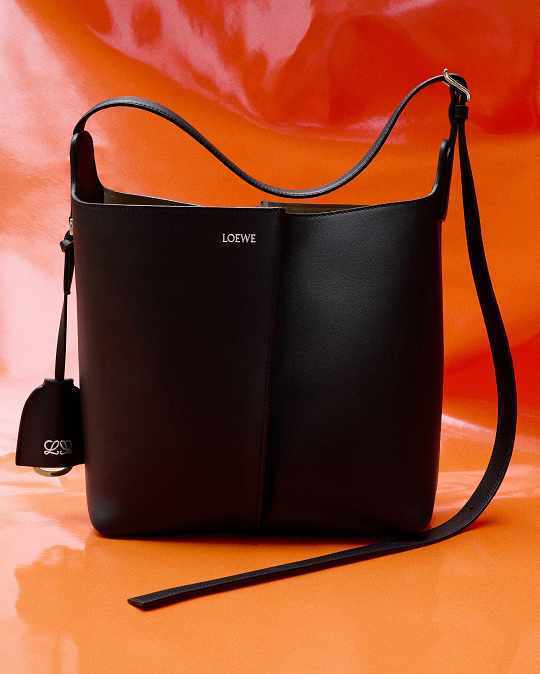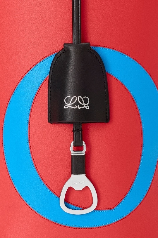 新作中最引人注意的是这只大号撞色款 Bilbao 手袋,通过皮革镶嵌工艺在红色包身嵌入亮蓝色 LOEWE 徽标图案。包包的最大设计亮点是中央的扭转式褶裥拼接方式,让原本规整的水桶构型变得更加立体且具有一种动态美感,包包旋转90°之后变换为倒梯形轮廓,中央的钟型皮革吊饰成为主角,内侧配有一枚金属开瓶器,既是对欢庆时刻的礼赞,又流露出一种西班牙式的热情和诙谐姿态。