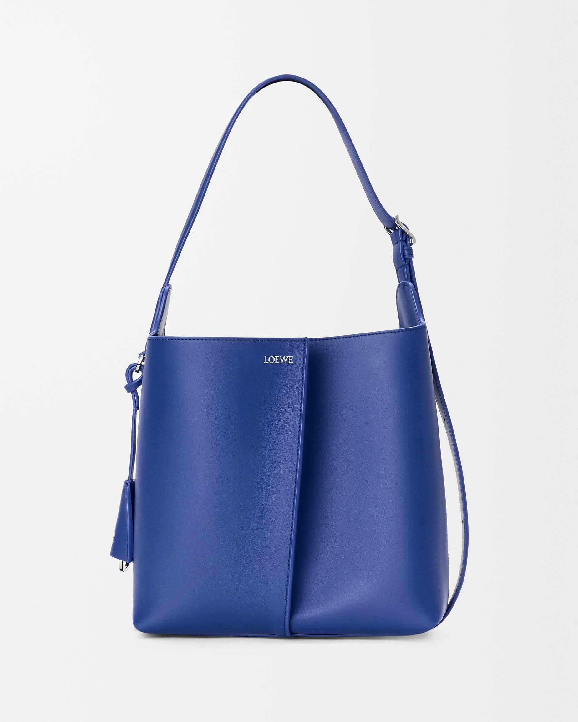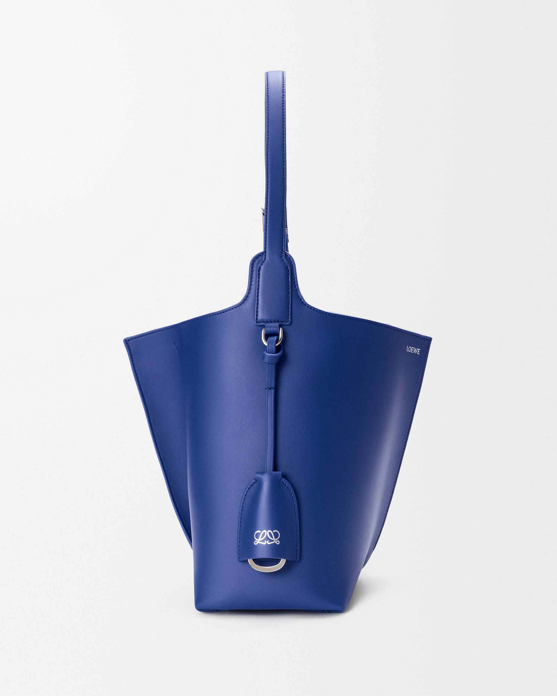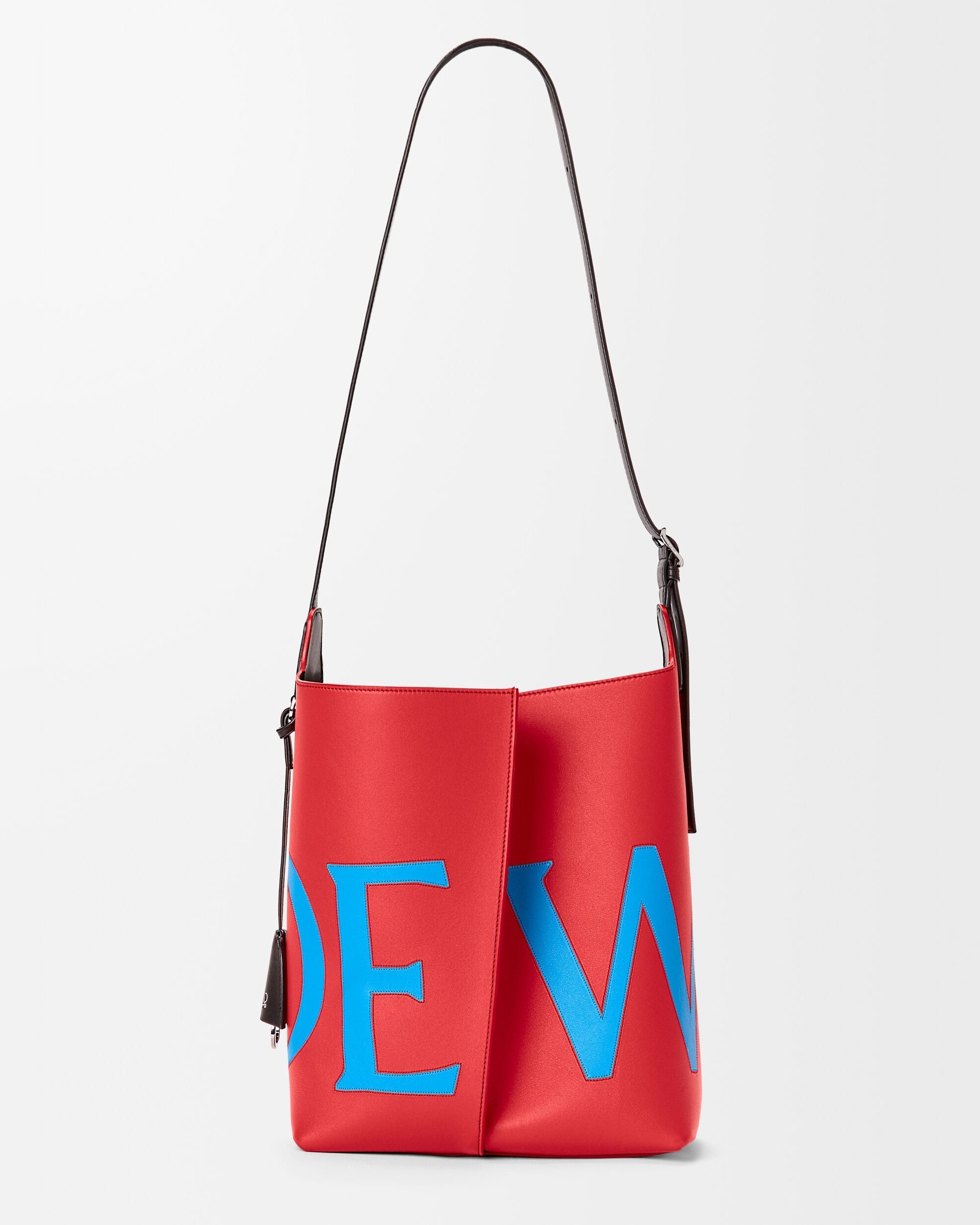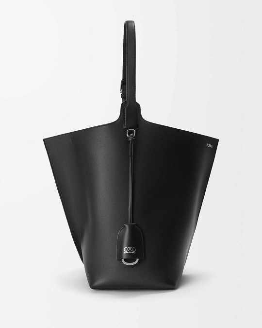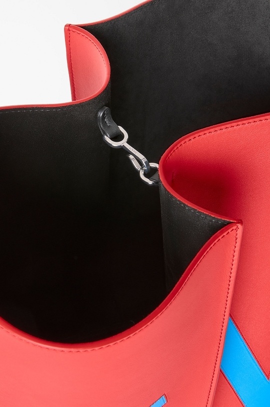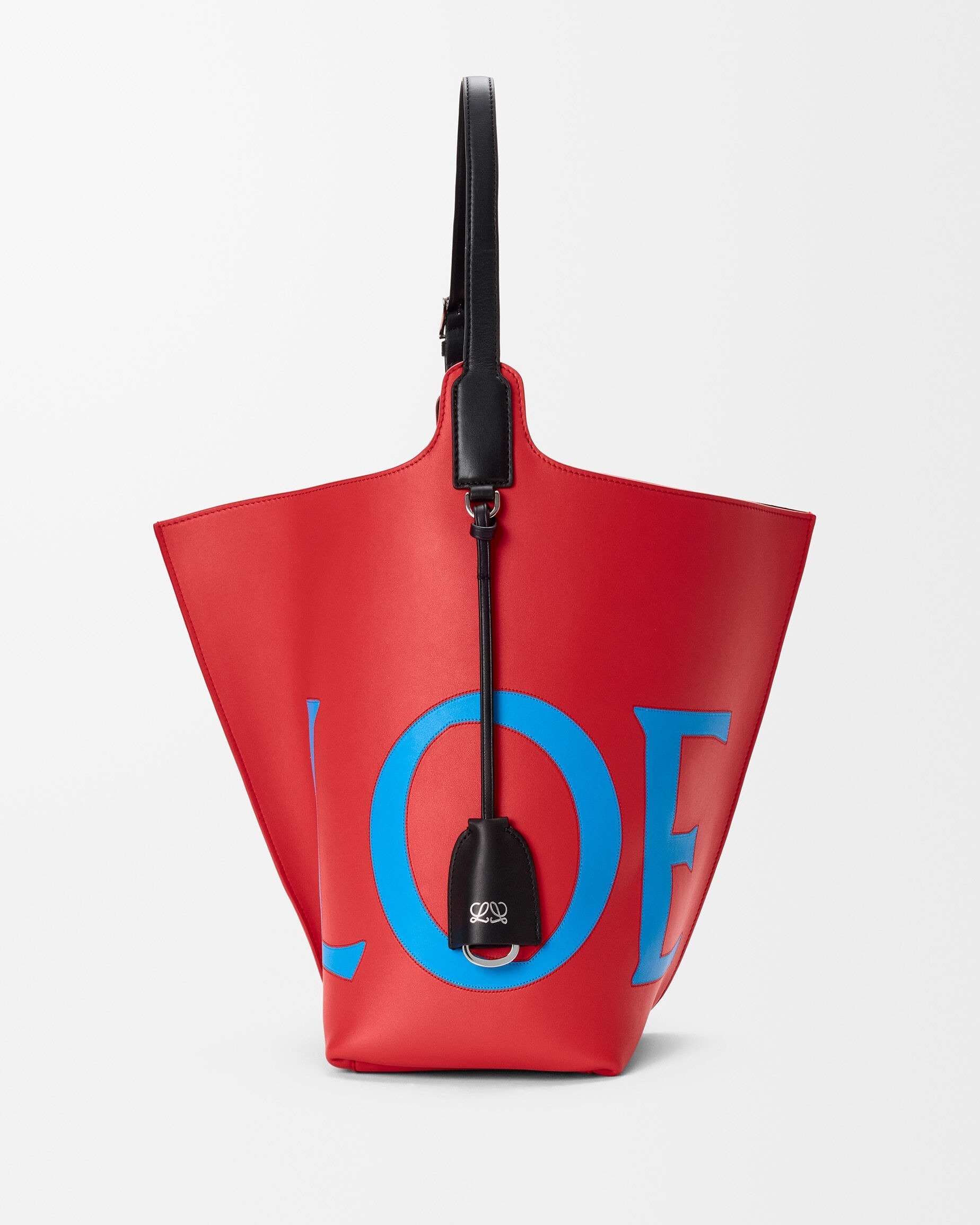 新作中最引人注意的是这只大号撞色款 Bilbao 手袋,通过皮革镶嵌工艺在红色包身嵌入亮蓝色 LOEWE 徽标图案。包包的最大设计亮点是中央的扭转式褶裥拼接方式,让原本规整的水桶构型变得更加立体且具有一种动态美感,包包旋转90°之后变换为倒梯形轮廓,中央的钟型皮革吊饰成为主角,内侧配有一枚金属开瓶器,既是对欢庆时刻的礼赞,又流露出一种西班牙式的热情和诙谐姿态。