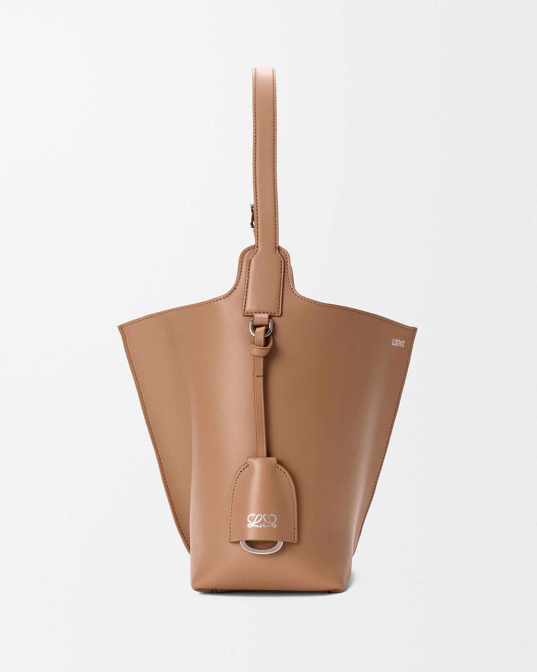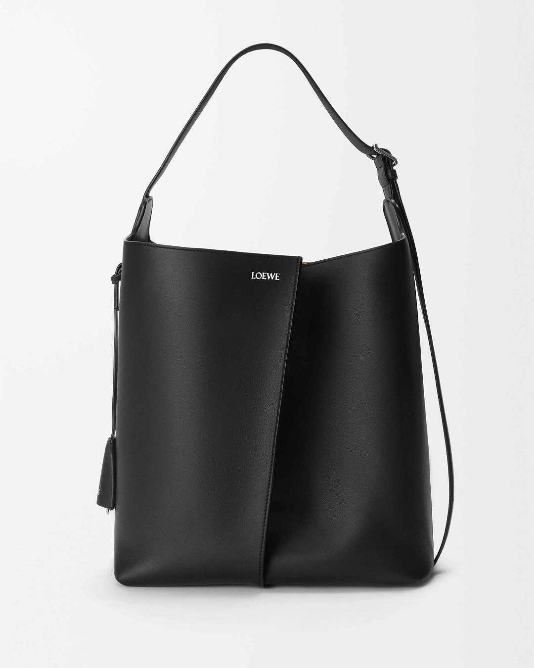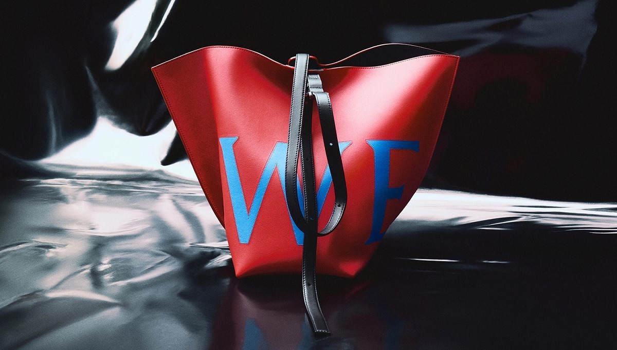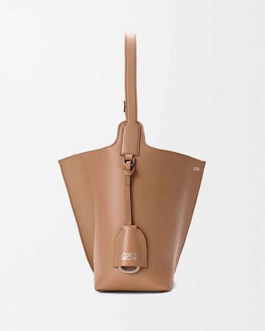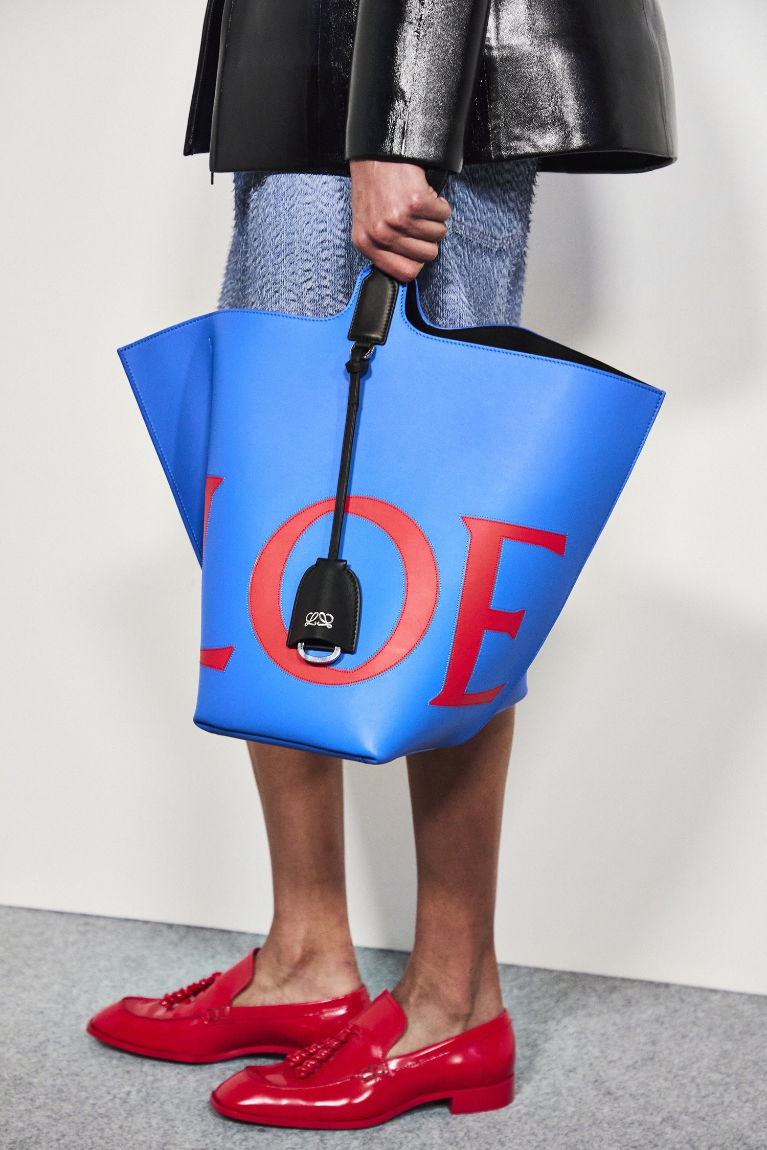 新作中最引人注意的是这只大号撞色款 Bilbao 手袋,通过皮革镶嵌工艺在红色包身嵌入亮蓝色 LOEWE 徽标图案。包包的最大设计亮点是中央的扭转式褶裥拼接方式,让原本规整的水桶构型变得更加立体且具有一种动态美感,包包旋转90°之后变换为倒梯形轮廓,中央的钟型皮革吊饰成为主角,内侧配有一枚金属开瓶器,既是对欢庆时刻的礼赞,又流露出一种西班牙式的热情和诙谐姿态。