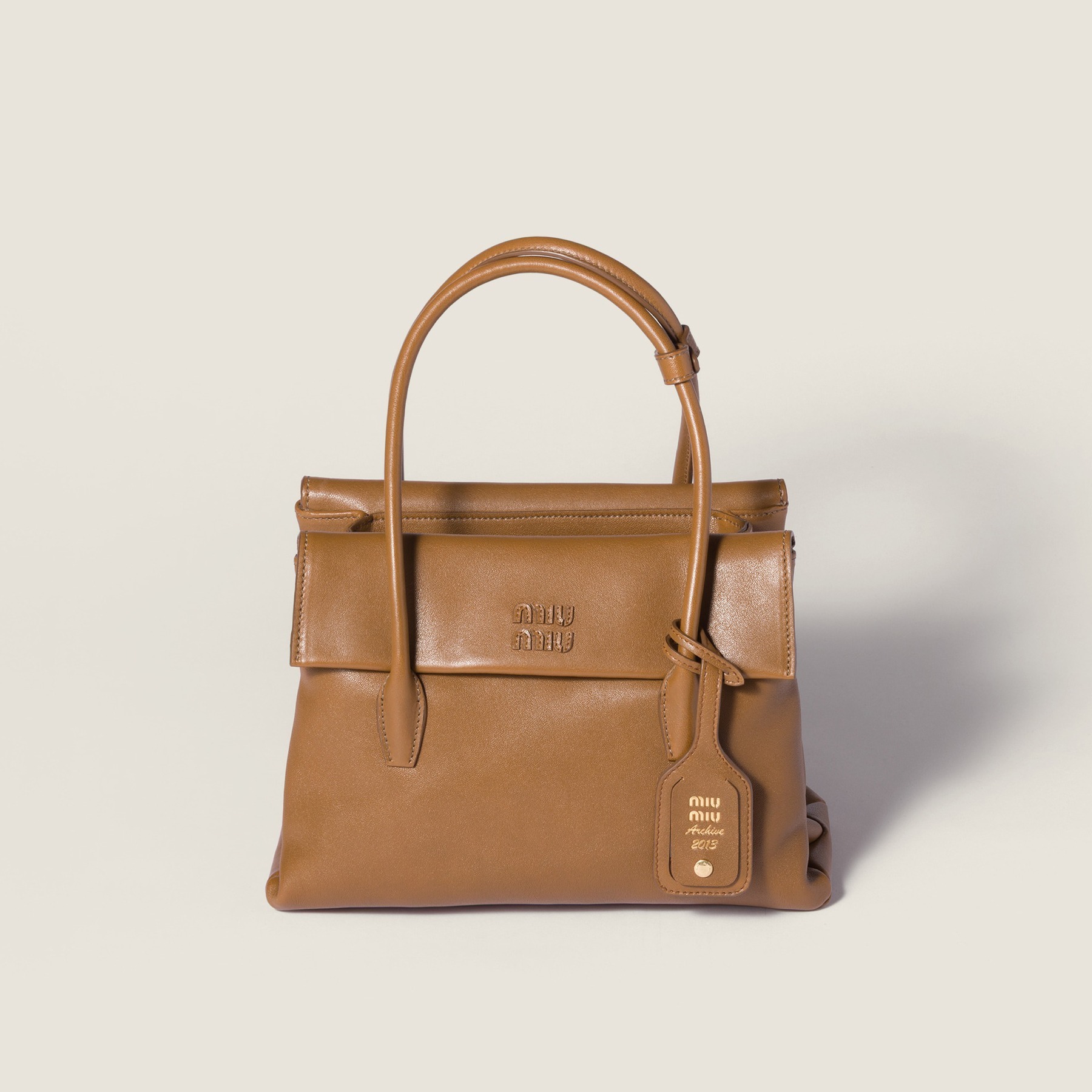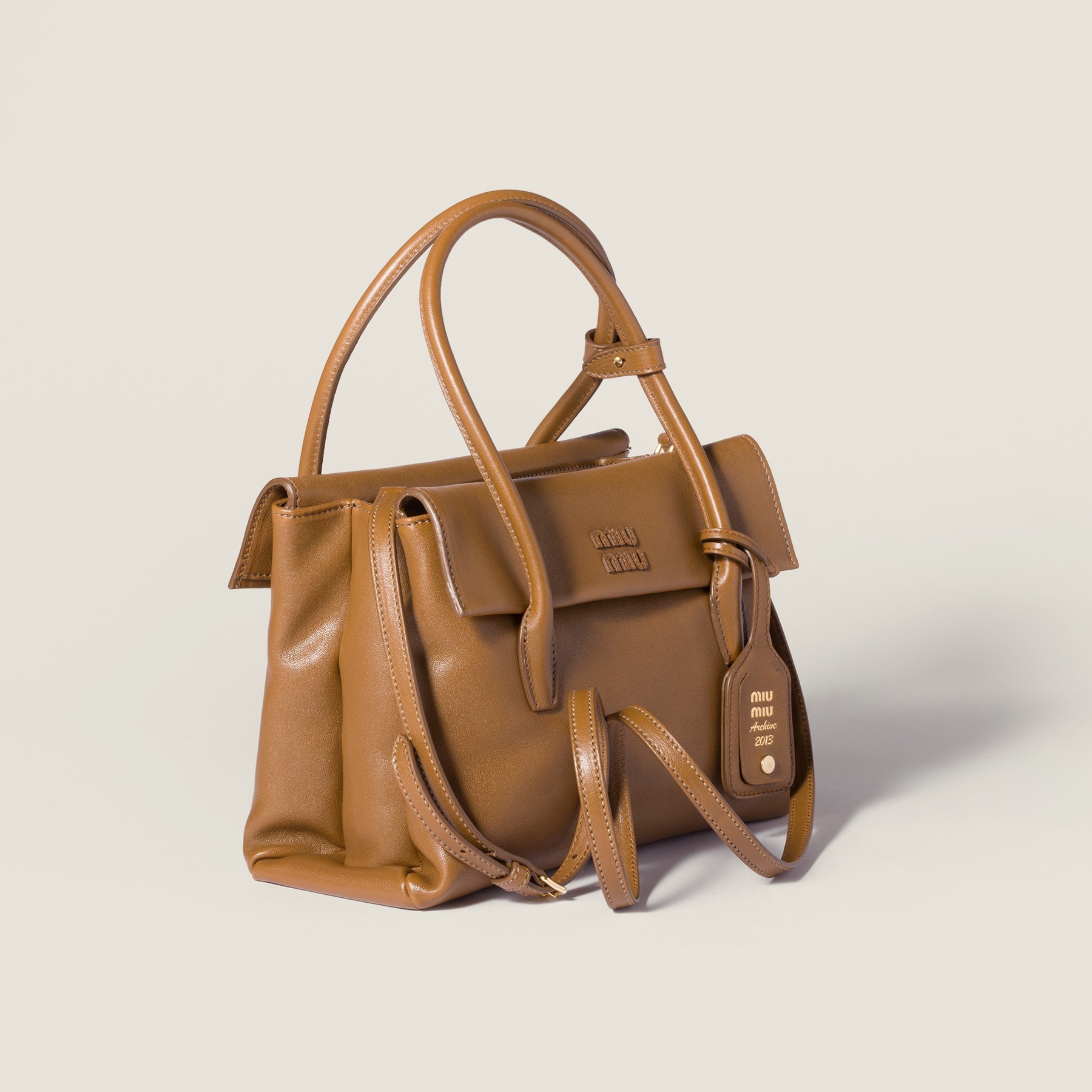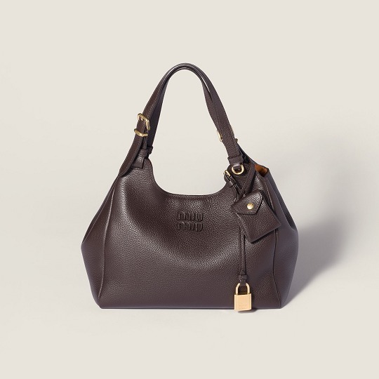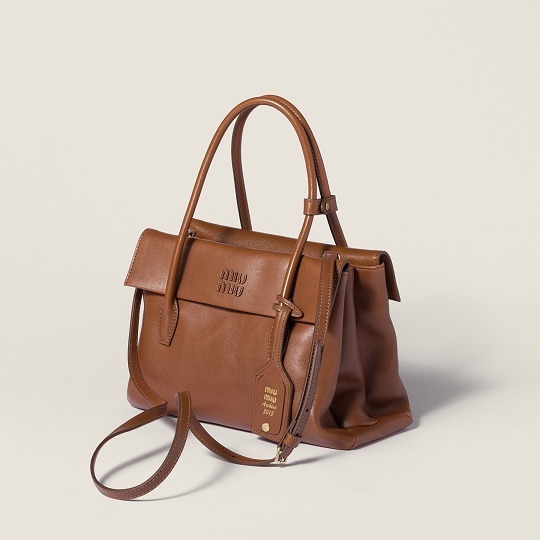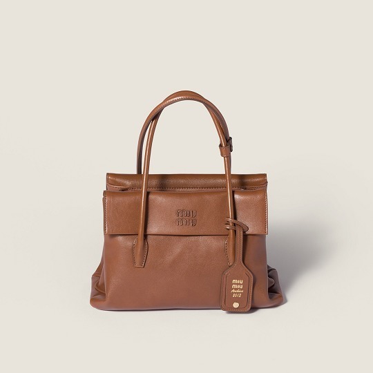全新 Solitaire 手袋出自 Miu Miu 2025秋冬秀场,采用木色和紫檀木色纳帕皮革塑造复古公文包型,最大亮点是别出心裁的双面翻盖口袋设计,层次分明的结构既实用又典雅,同色系皮标低调宣示品牌身份。