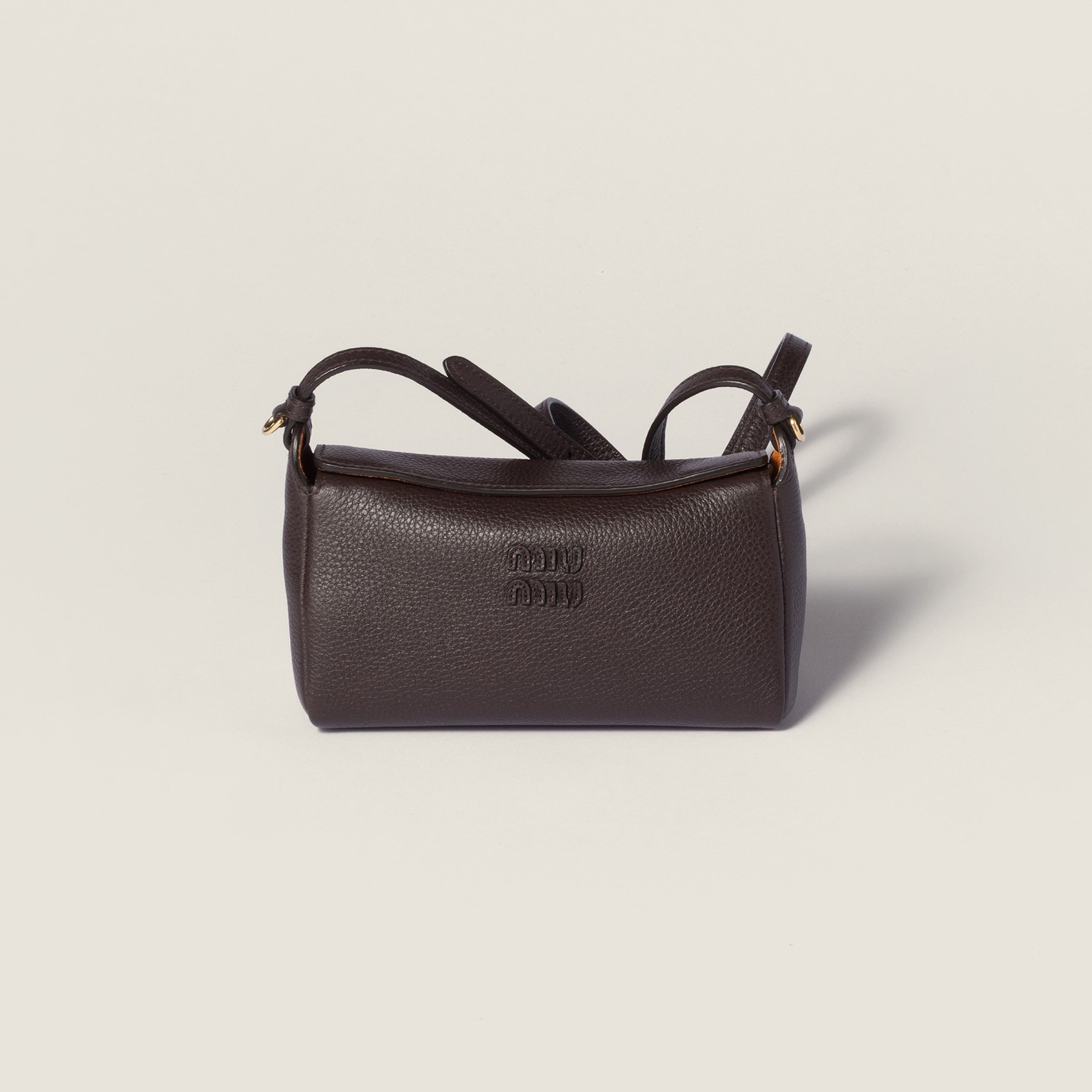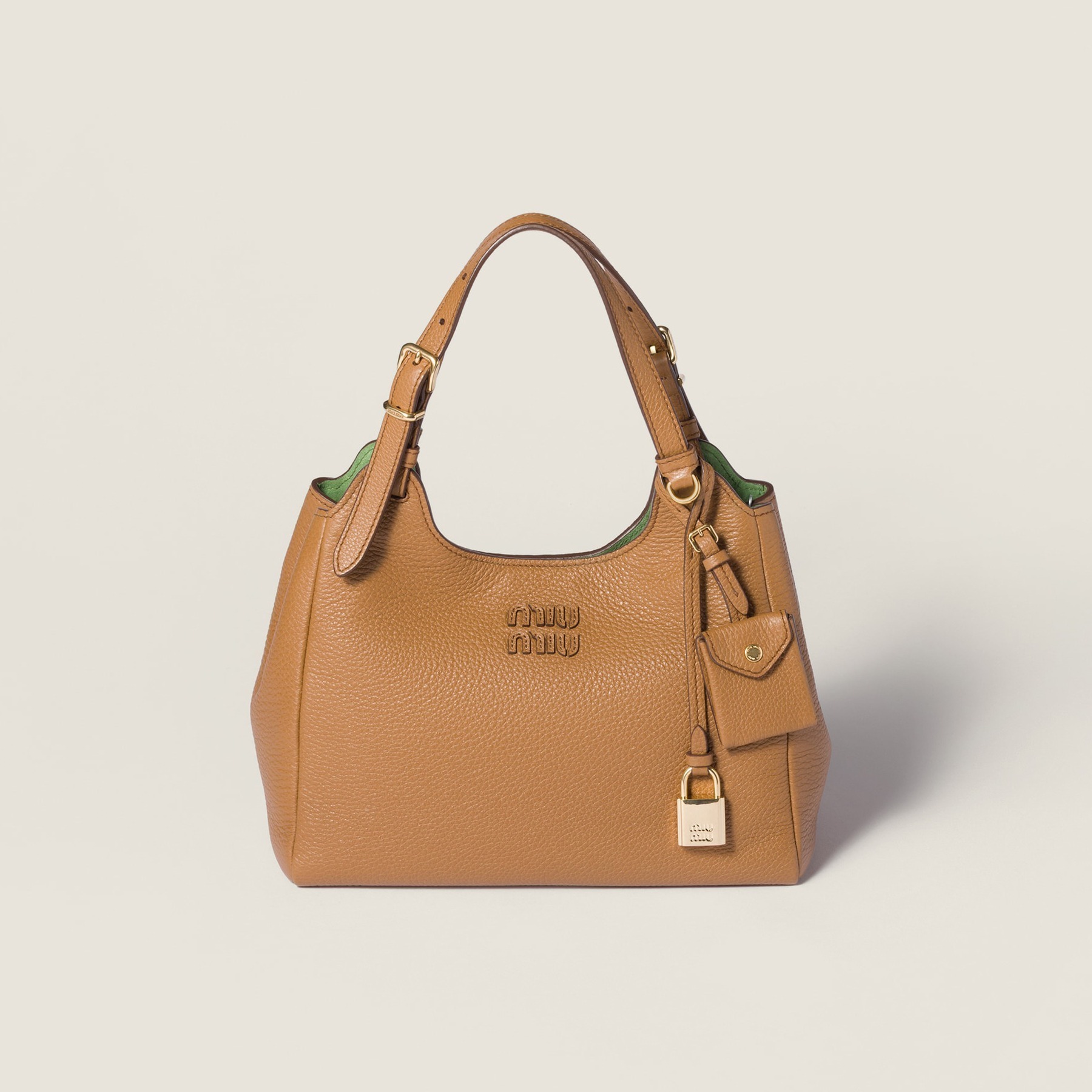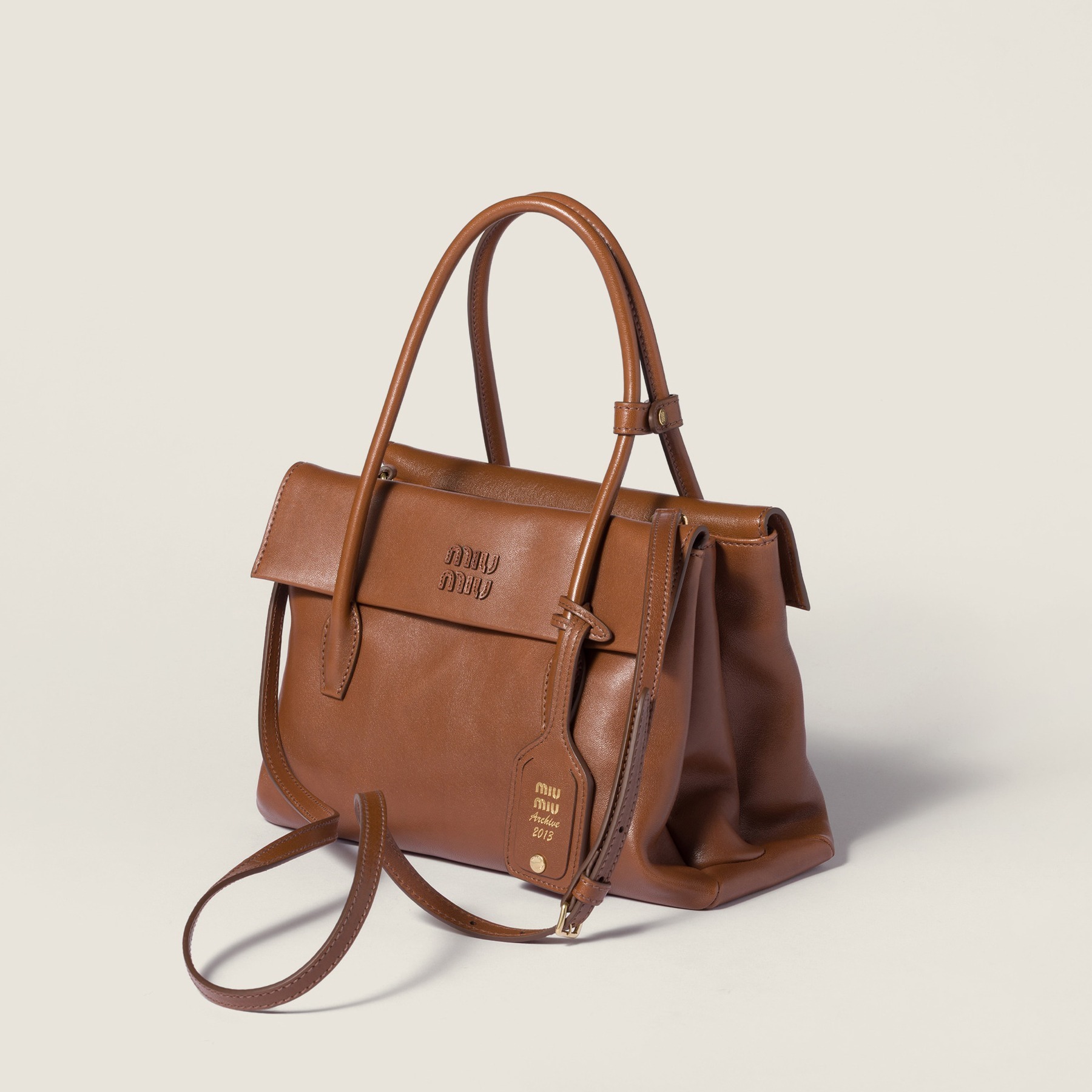 全新 Solitaire 手袋出自 Miu Miu 2025秋冬秀场,采用木色和紫檀木色纳帕皮革塑造复古公文包型,最大亮点是别出心裁的双面翻盖口袋设计,层次分明的结构既实用又典雅,同色系皮标低调宣示品牌身份。